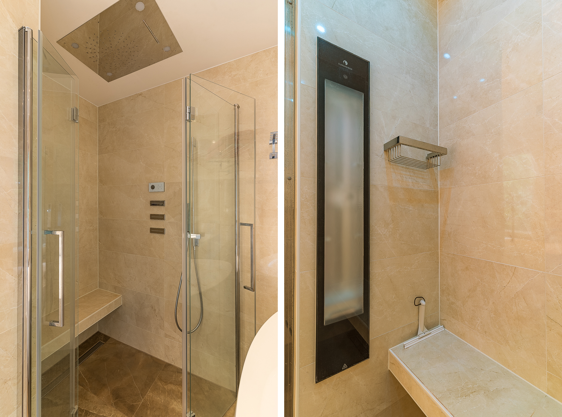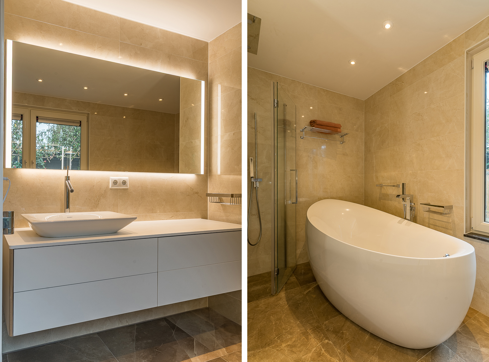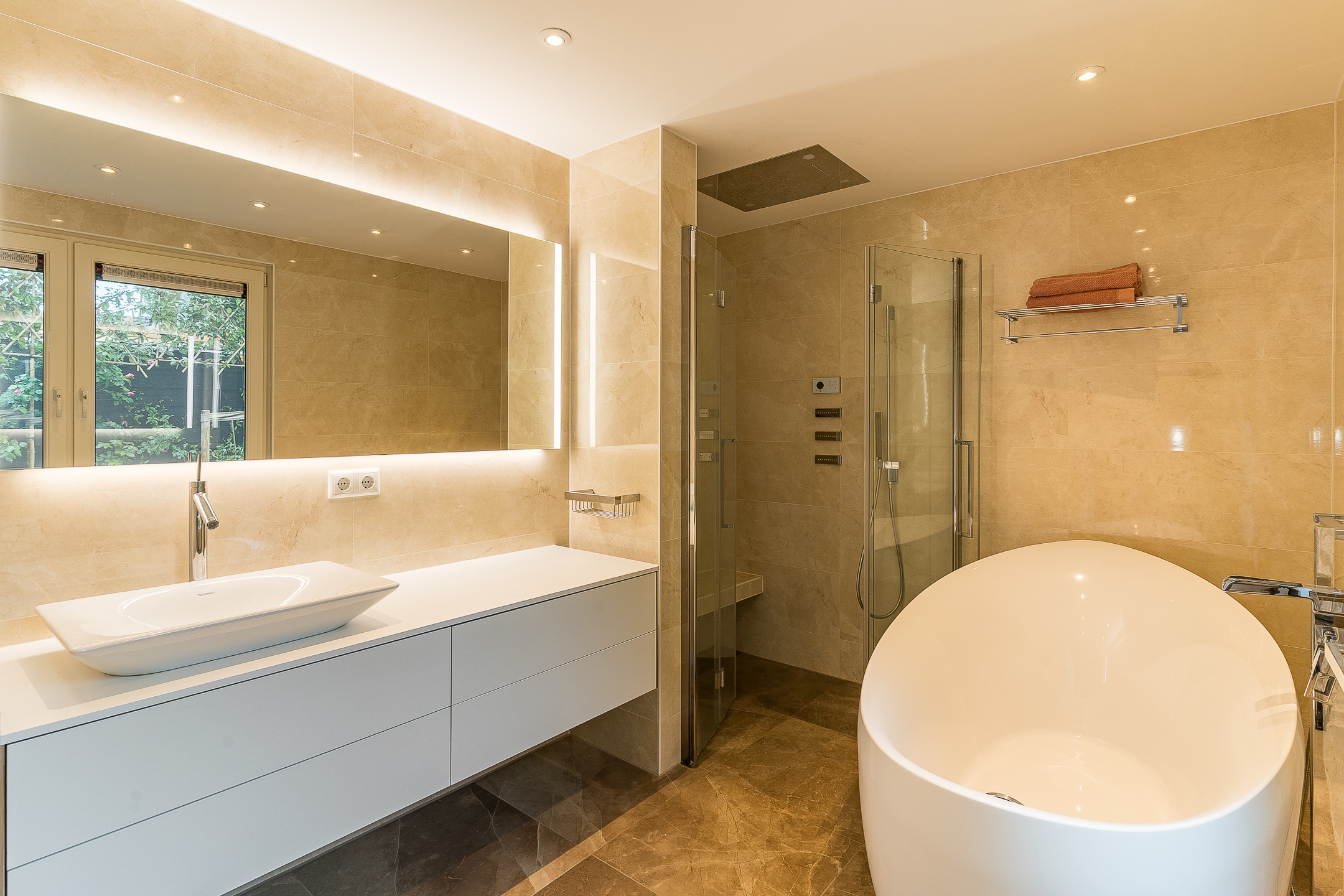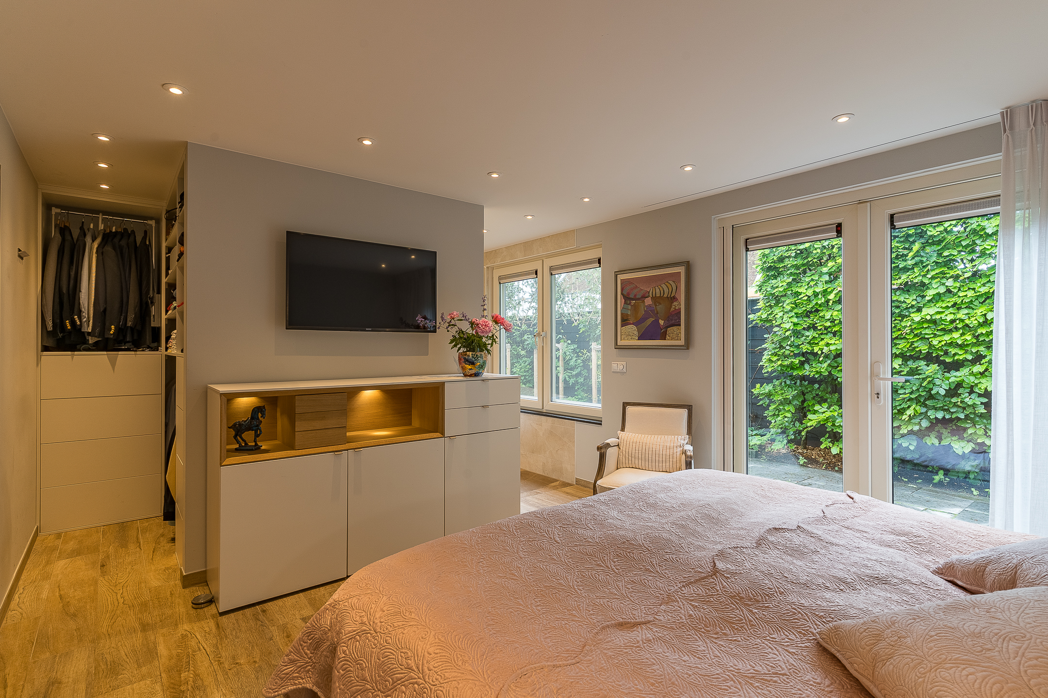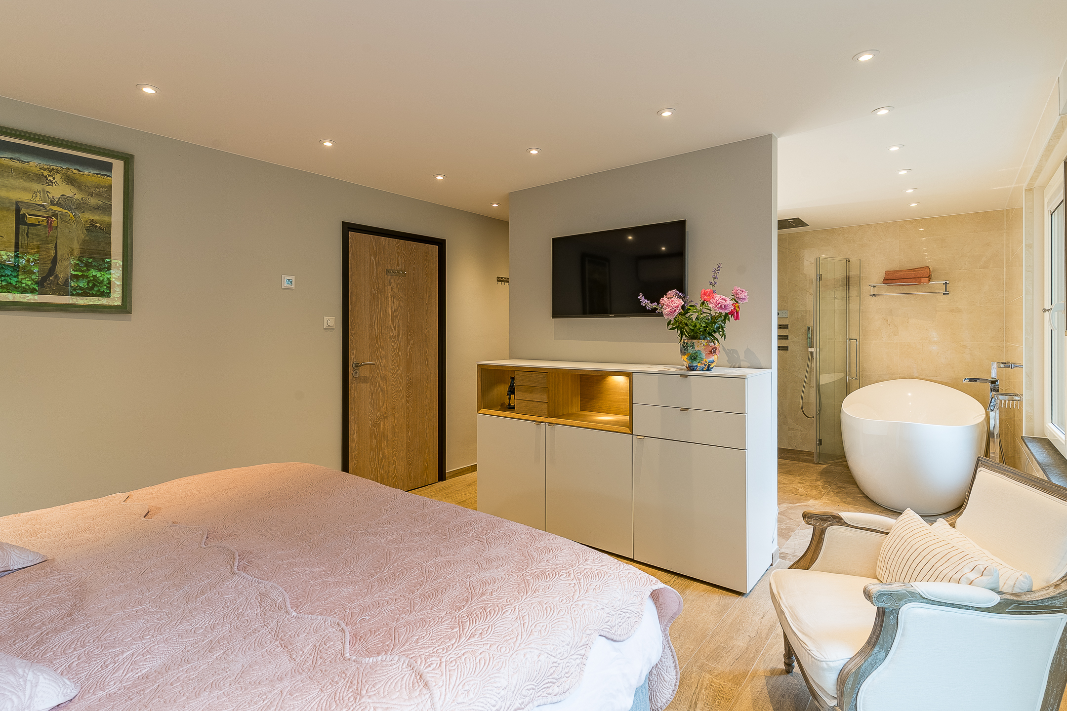 Teruggekomen in de hal is er toegang tot het toilet met fonteintje, de bijkeuken en de slaapkamer. Net als de woonkamer is ook de slaapkamer voorzien van inbouwspotjes en elektrisch bedienbare gordijnen en om de hoek van de deur is een op maat gemaakte inloopkast gecreëerd. Verder beschikt de slaapkamer over een eigen airconditioning unit. Vanuit het slaapgedeelte is er een directe, open verbinding naar de badkamer, welke uiteraard luxe is uitgevoerd. Hier treft u een breed wastafelmeubel met fraaie waskom aan en het royale, vrijstaande ligbad is hier een mooie eyecatcher. In de hoek is een ruime inloopdouche gesitueerd, compleet met regendouche, handdouche en Sunshower.