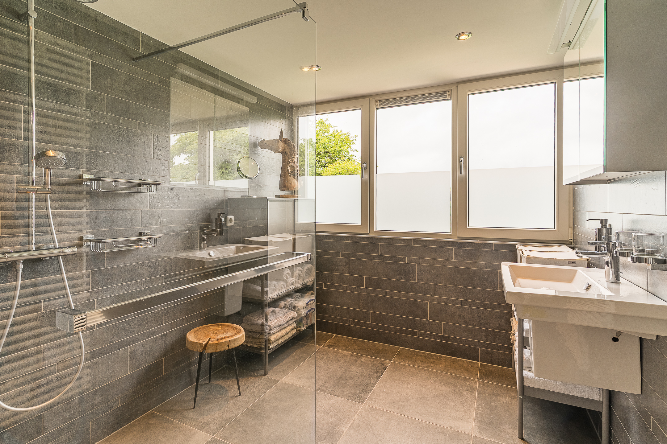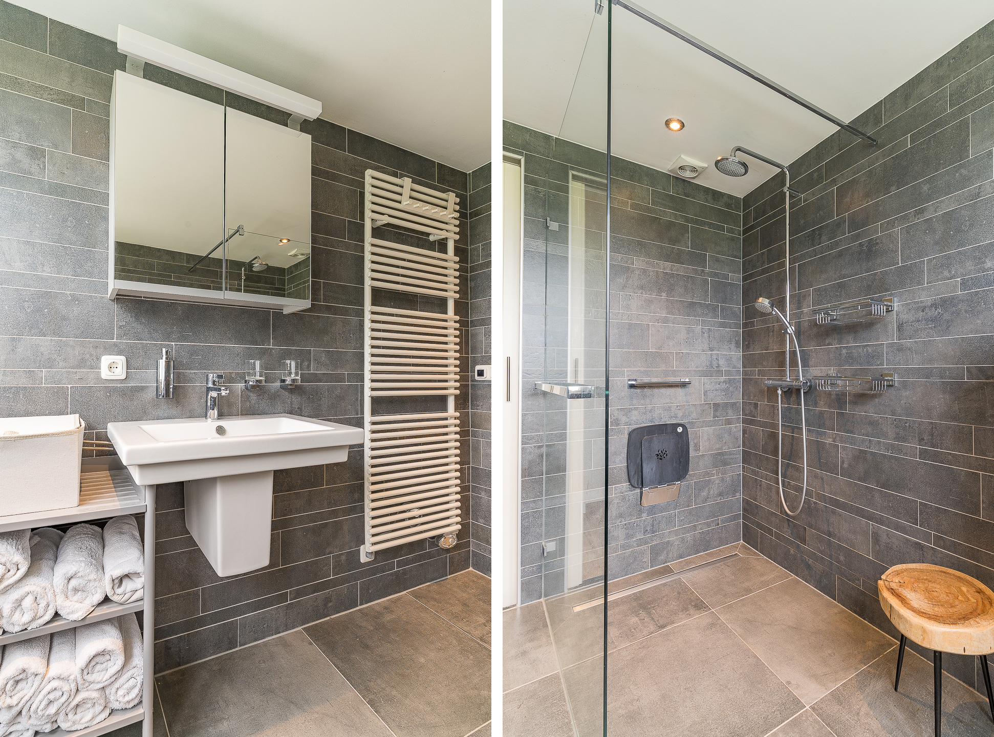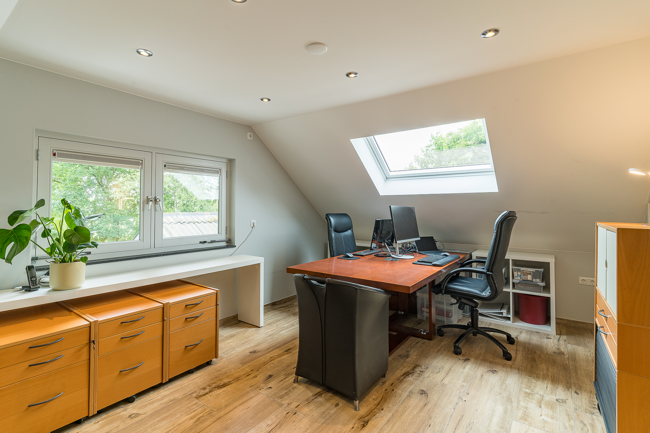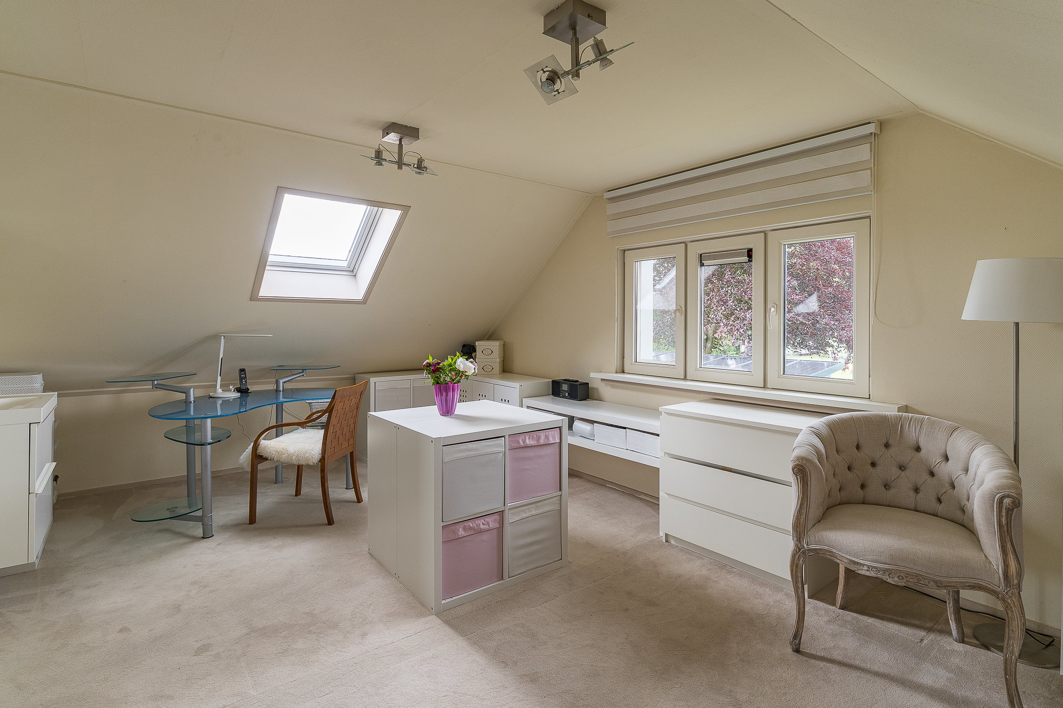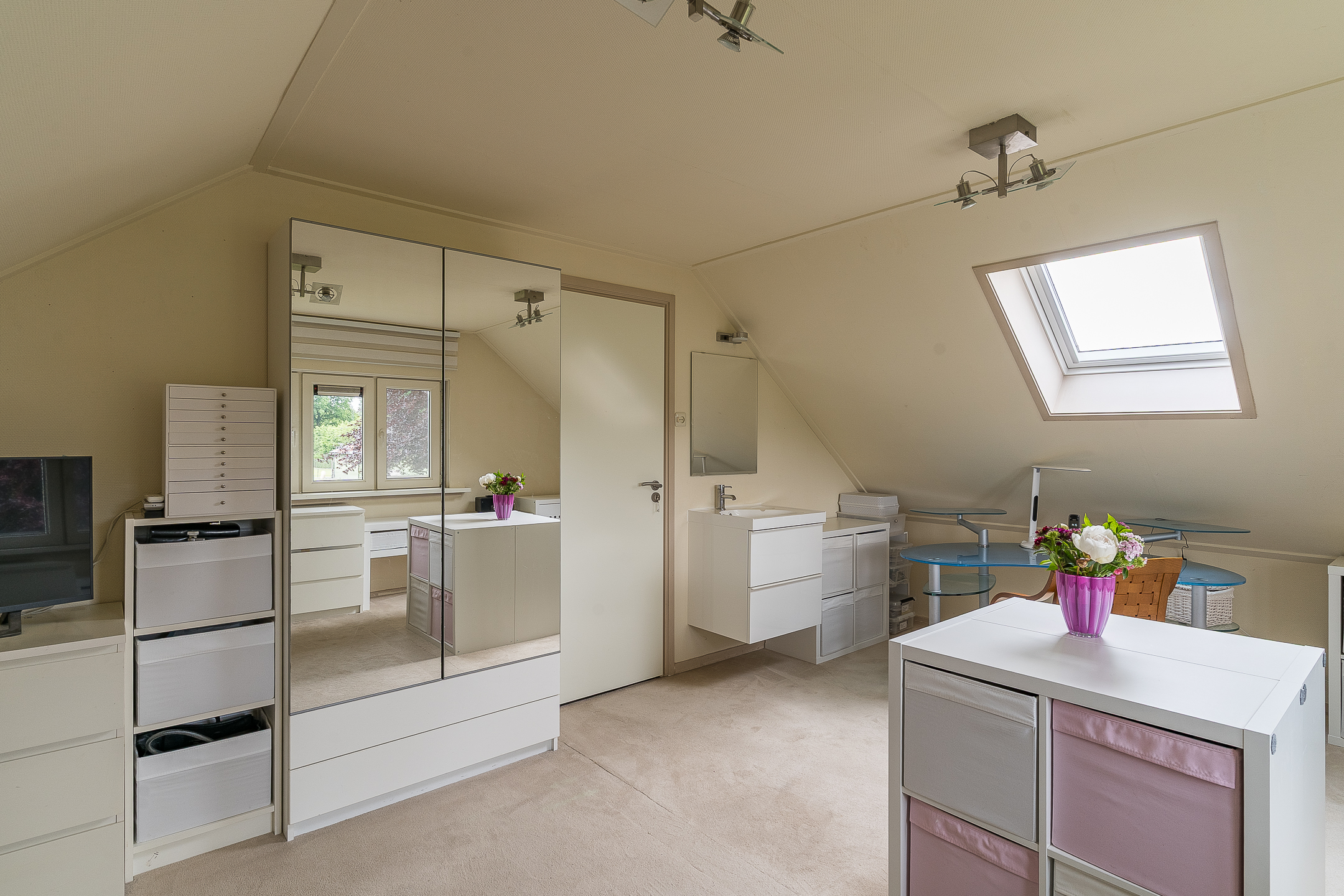 De trap brengt u op de overloop van de verdieping, vanwaar er toegang is tot twee riante slaapkamers, een ruime badkamer, een separate toiletruimte, een technische ruimte en een drietal bergingen waarvan twee tot een 3e en 4e slaapkamer gemaakt zouden kunnen worden. De badkamer is voorzien van een wastafel en een inloopdouche.