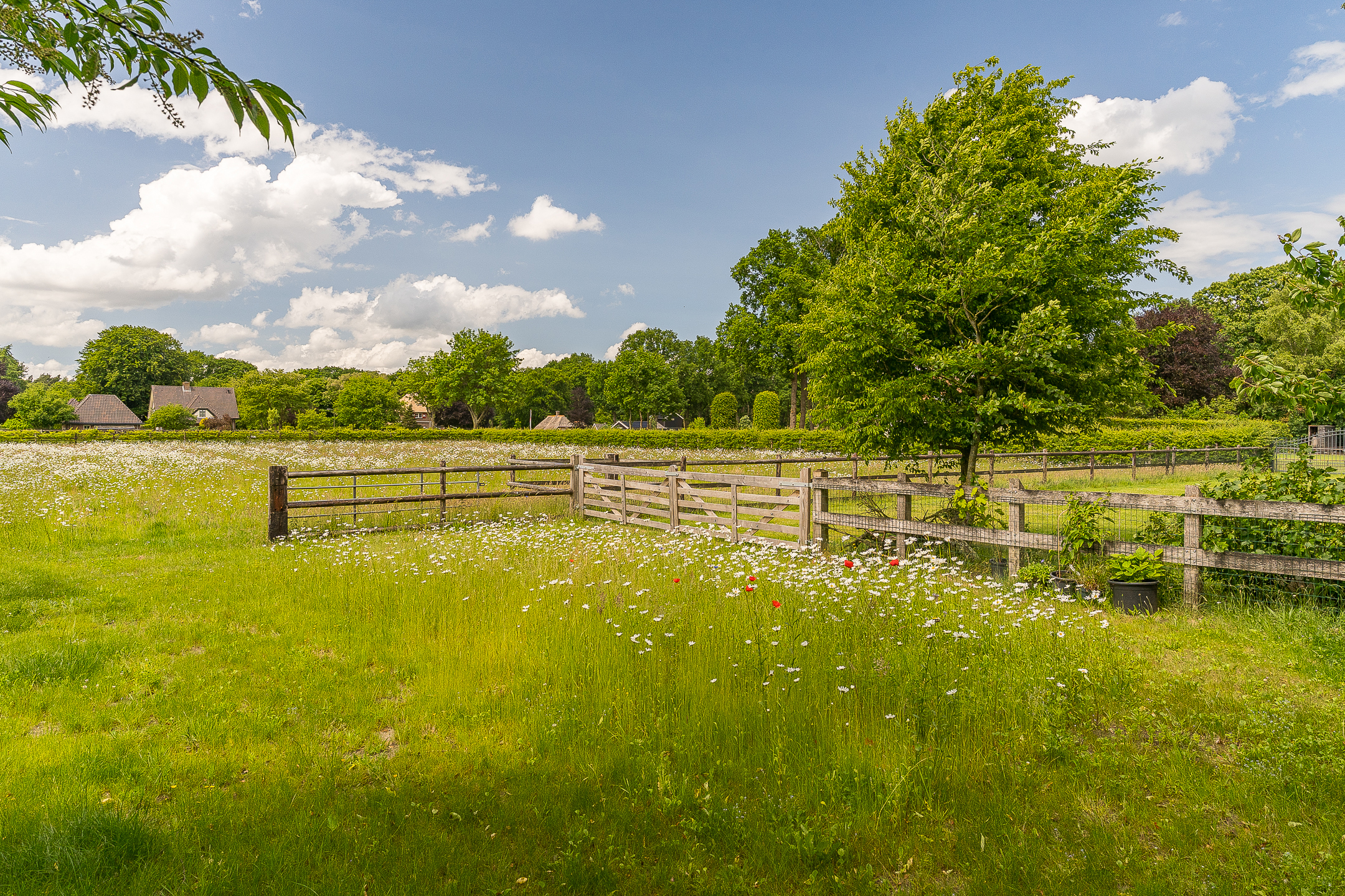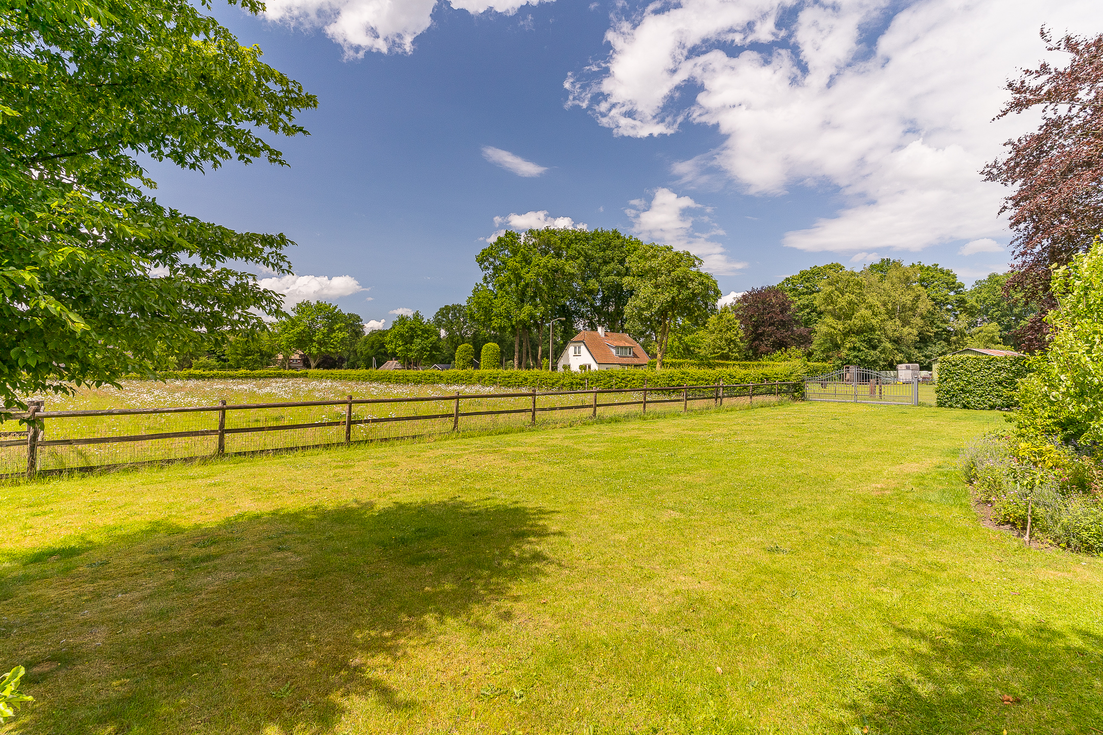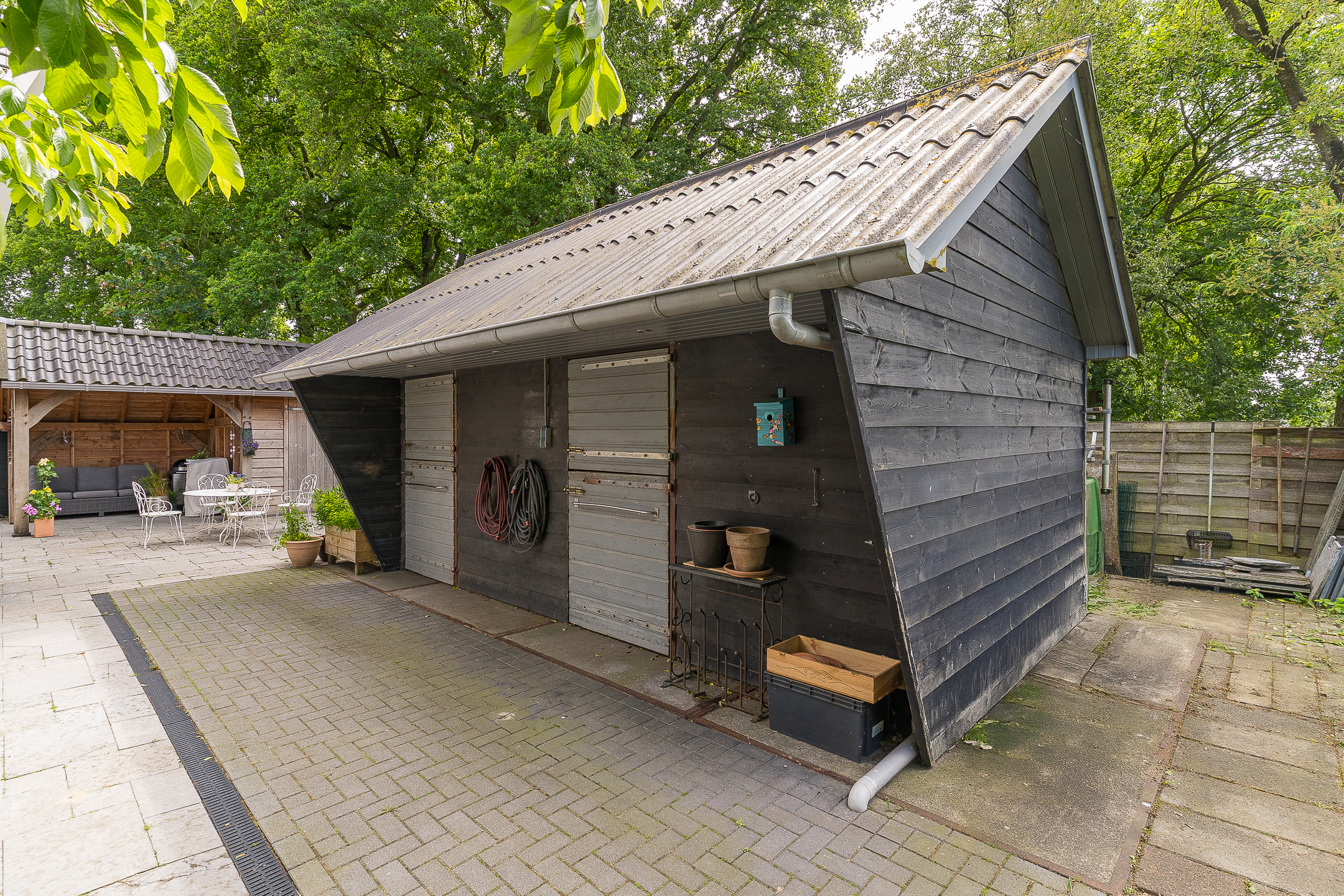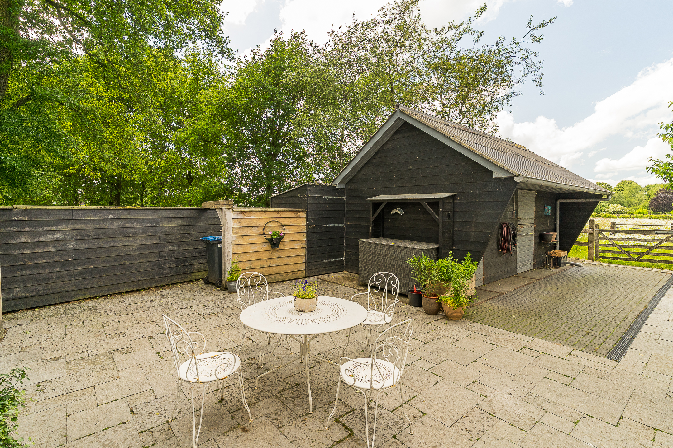 De tuin is voorzien van strakke gazons, diverse beplanting en een viertal terrassen waar u volop kunt genieten van het buitenleven. Achter de woning treft u de paardenstallen aan, die een directe verbinding hebben tot de weide naast de woning. Ook treft u hier een extra Douglas/eiken schuur met veranda aan.