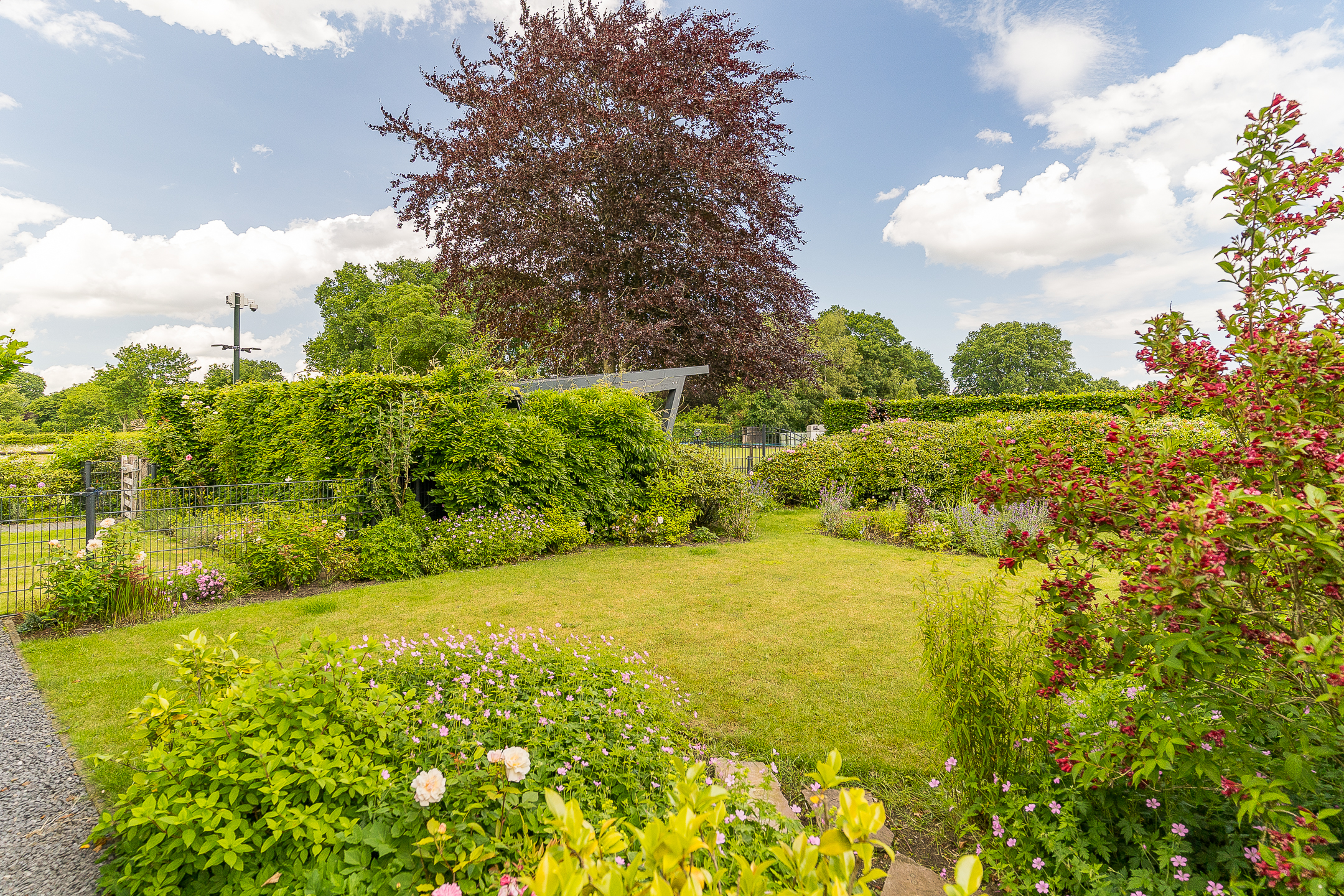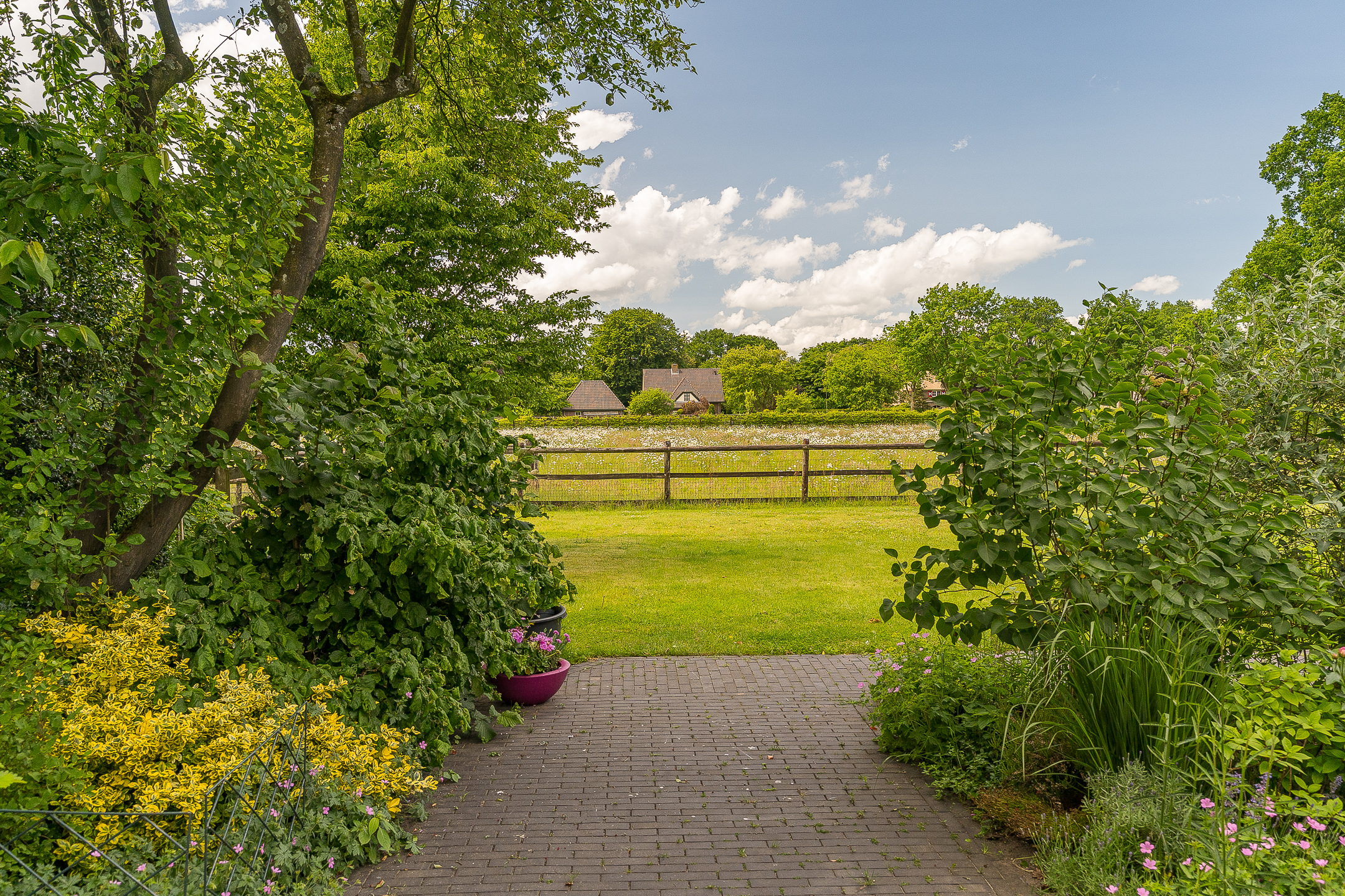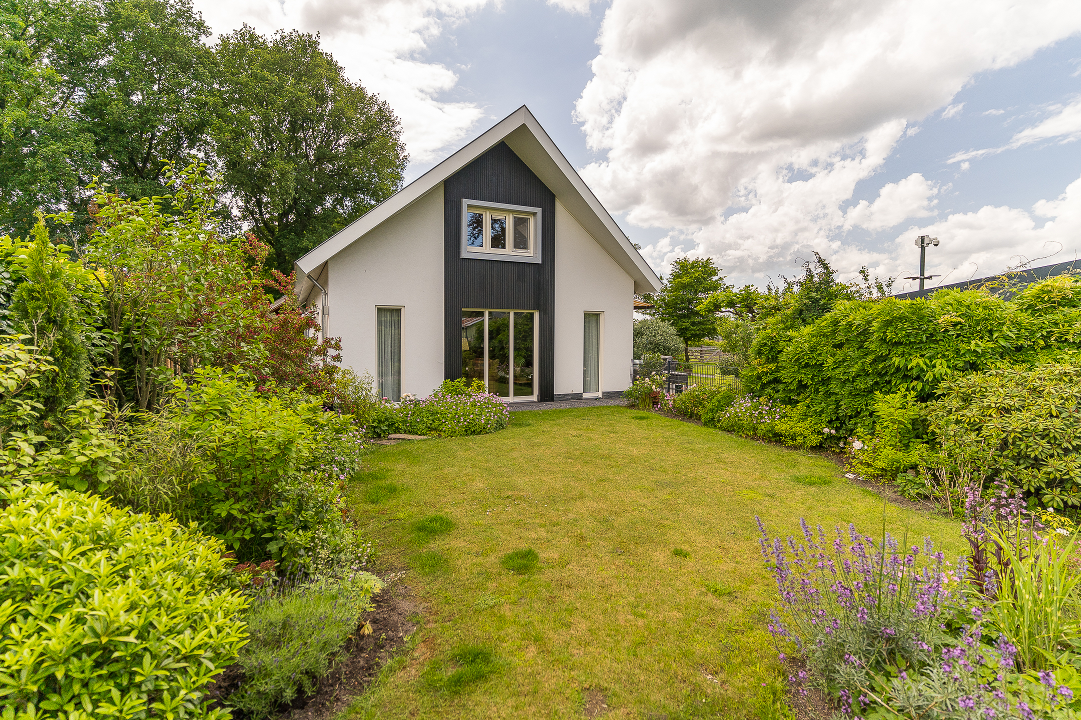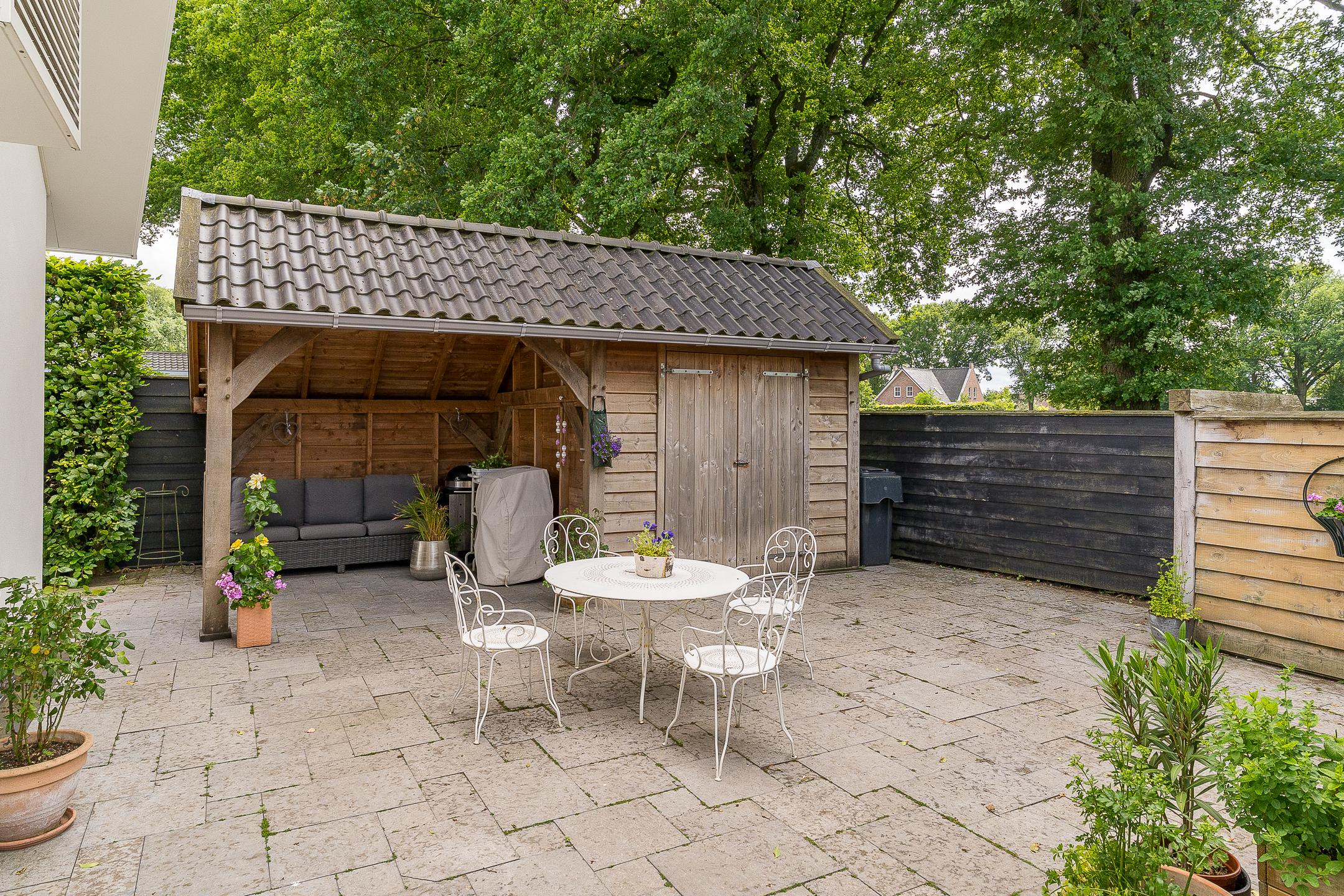 De tuin is voorzien van strakke gazons, diverse beplanting en een viertal terrassen waar u volop kunt genieten van het buitenleven. Achter de woning treft u de paardenstallen aan, die een directe verbinding hebben tot de weide naast de woning. Ook treft u hier een extra Douglas/eiken schuur met veranda aan.