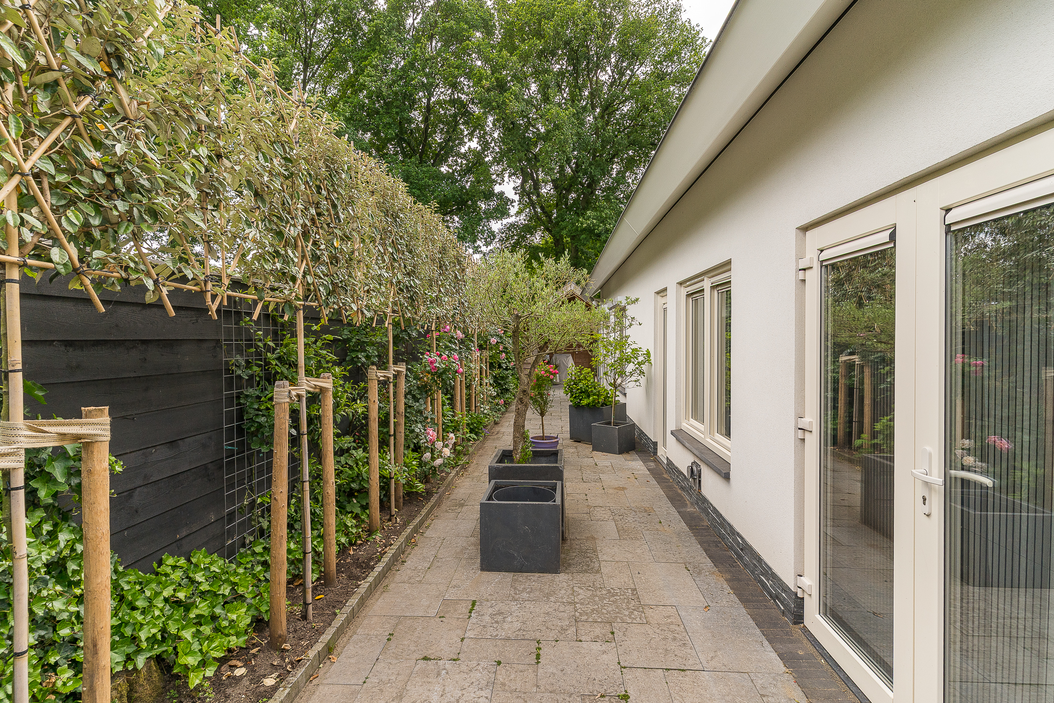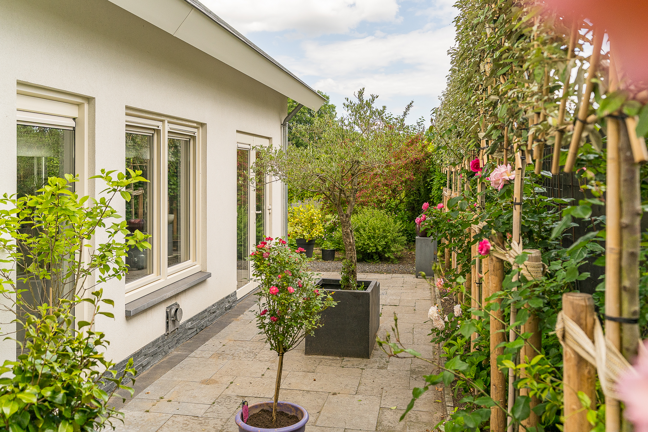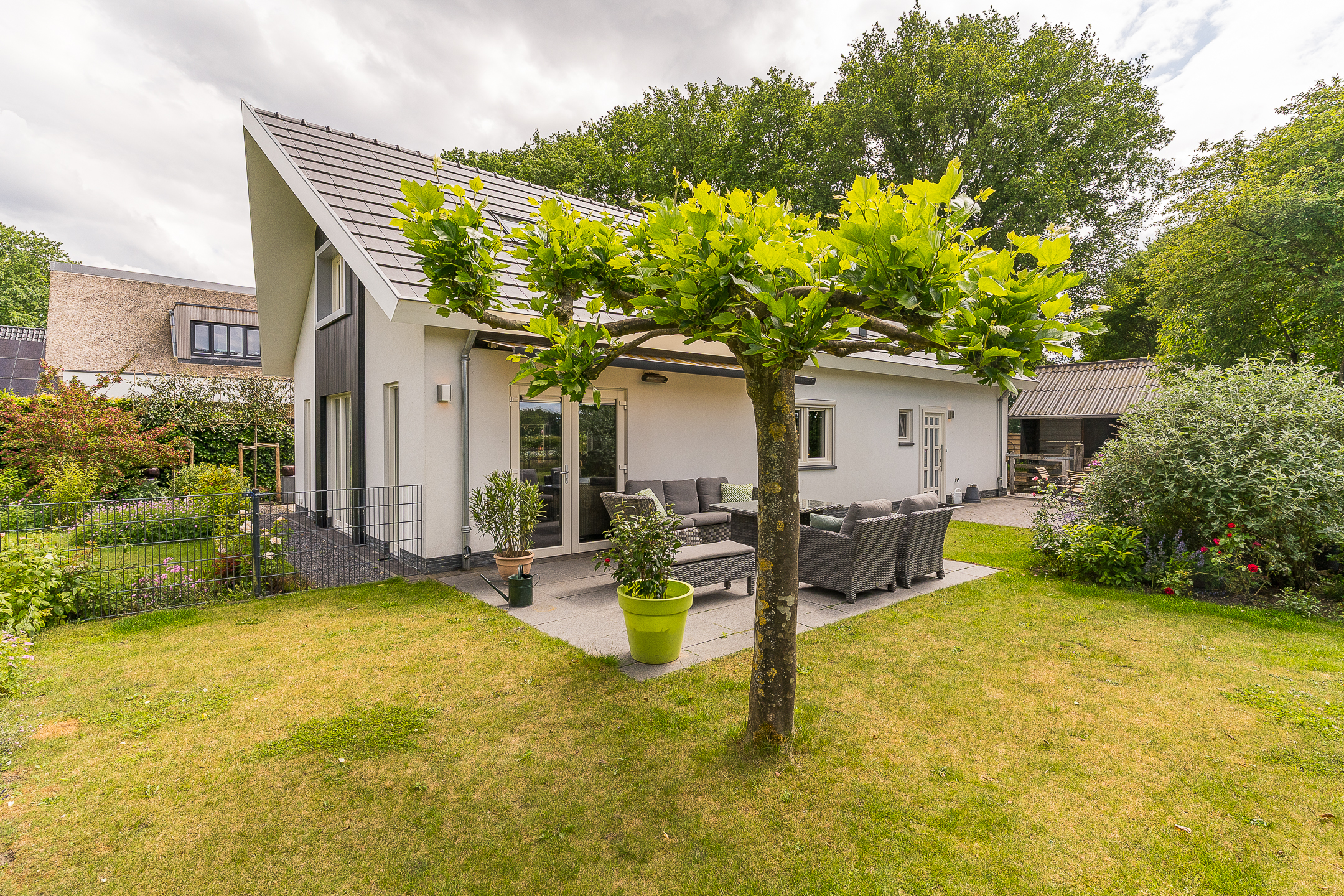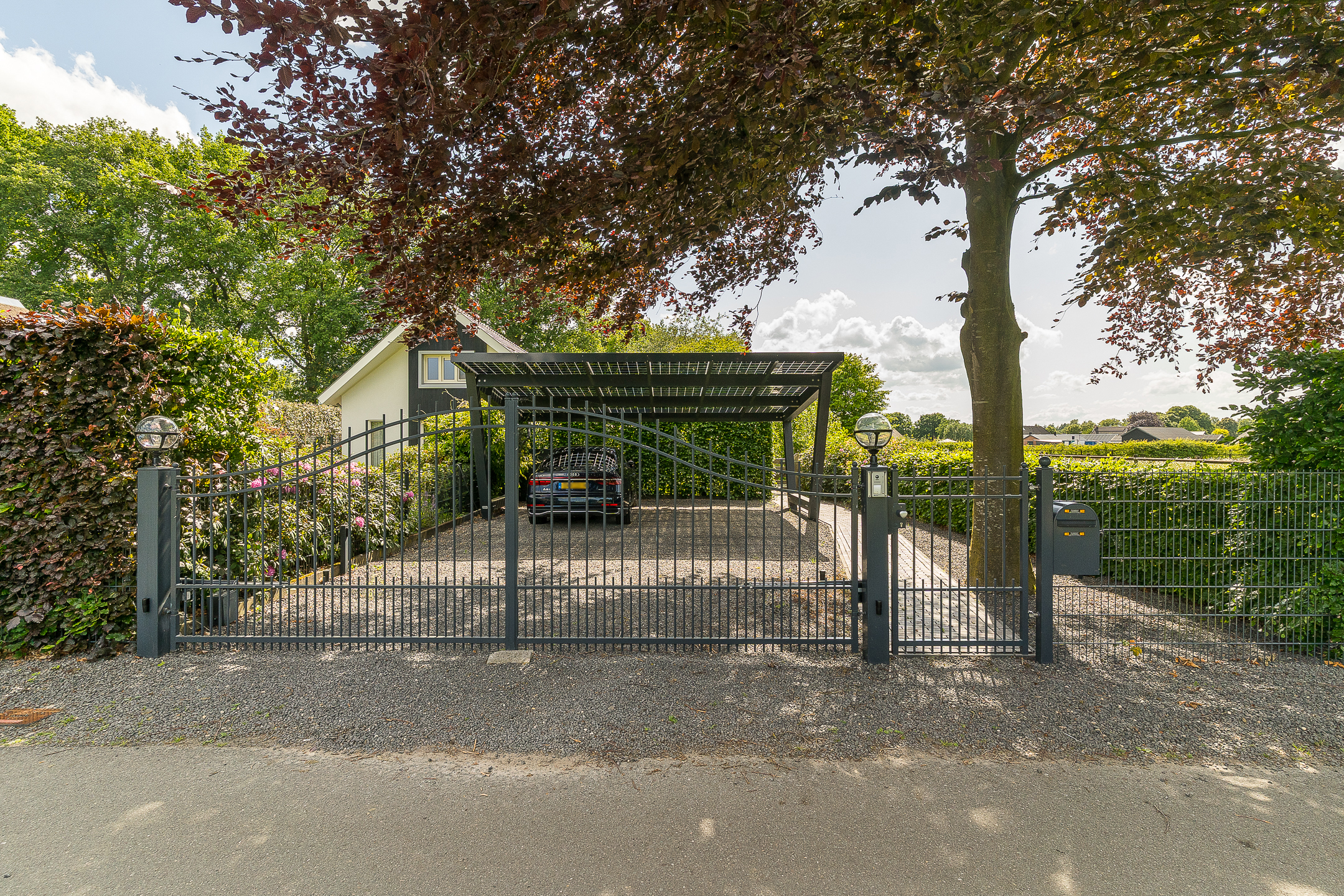 Rondom de woning ligt een volwassen tuin en net als de woning is ook de tuin buitengewoon stijlvol vormgegeven en uitstekend onderhouden. Geheel voor de woning ligt een breed parkeergedeelte, compleet met elektrisch bedienbare poort en een royale carport, waar u meerdere auto’s kunt parkeren. In deze carport zijn zonnepanelen geïntegreerd die samen goed zijn voor een totale opbrengst van 6 MW per jaar.