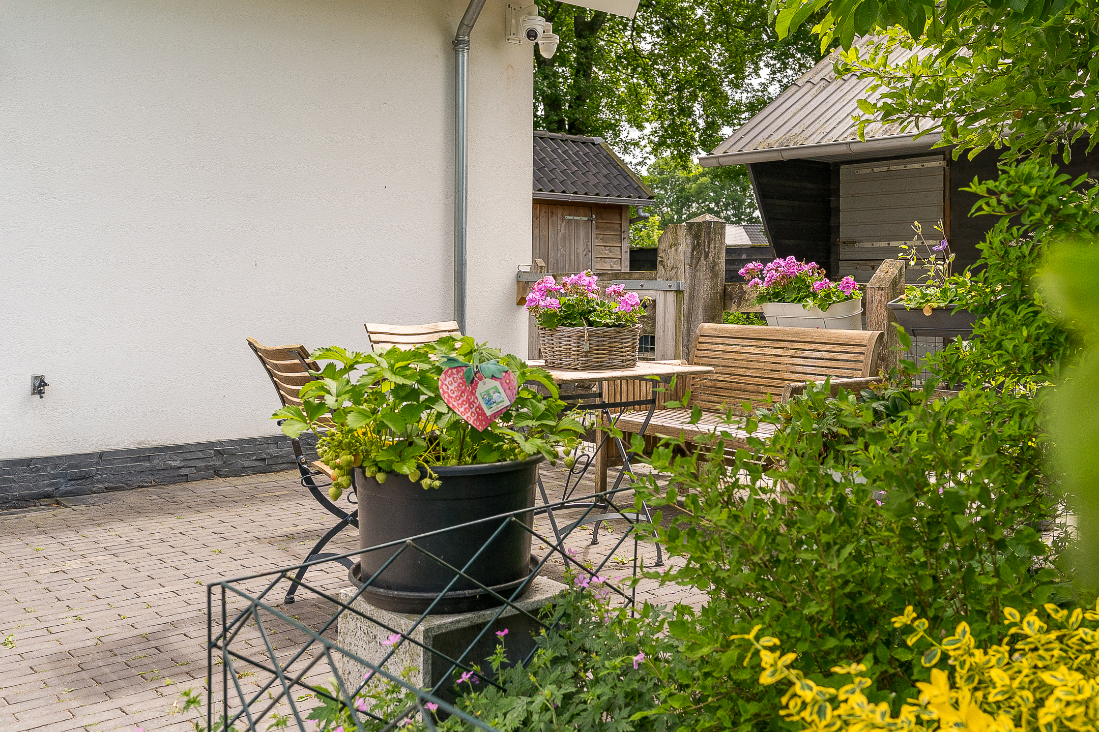 Ook buiten is er veel aandacht besteed aan de inrichting en het geheel is perfect onderhouden. Er zijn diverse terrassen en gazons te vinden en voor uw gemak is er een royale carport geplaatst met geïntegreerde zonnepanelen en een laadpaal voor twee auto’s. DE ZONNEPANELEN HEBBEN EEN GEZAMENLIJKE OPBRENGST VAN CA. 6.600 kWh PER JAAR. Daarnaast is er een eigen waterbron aanwezig waardoor u geheel zelfvoorzienend kan zijn op deze locatie.