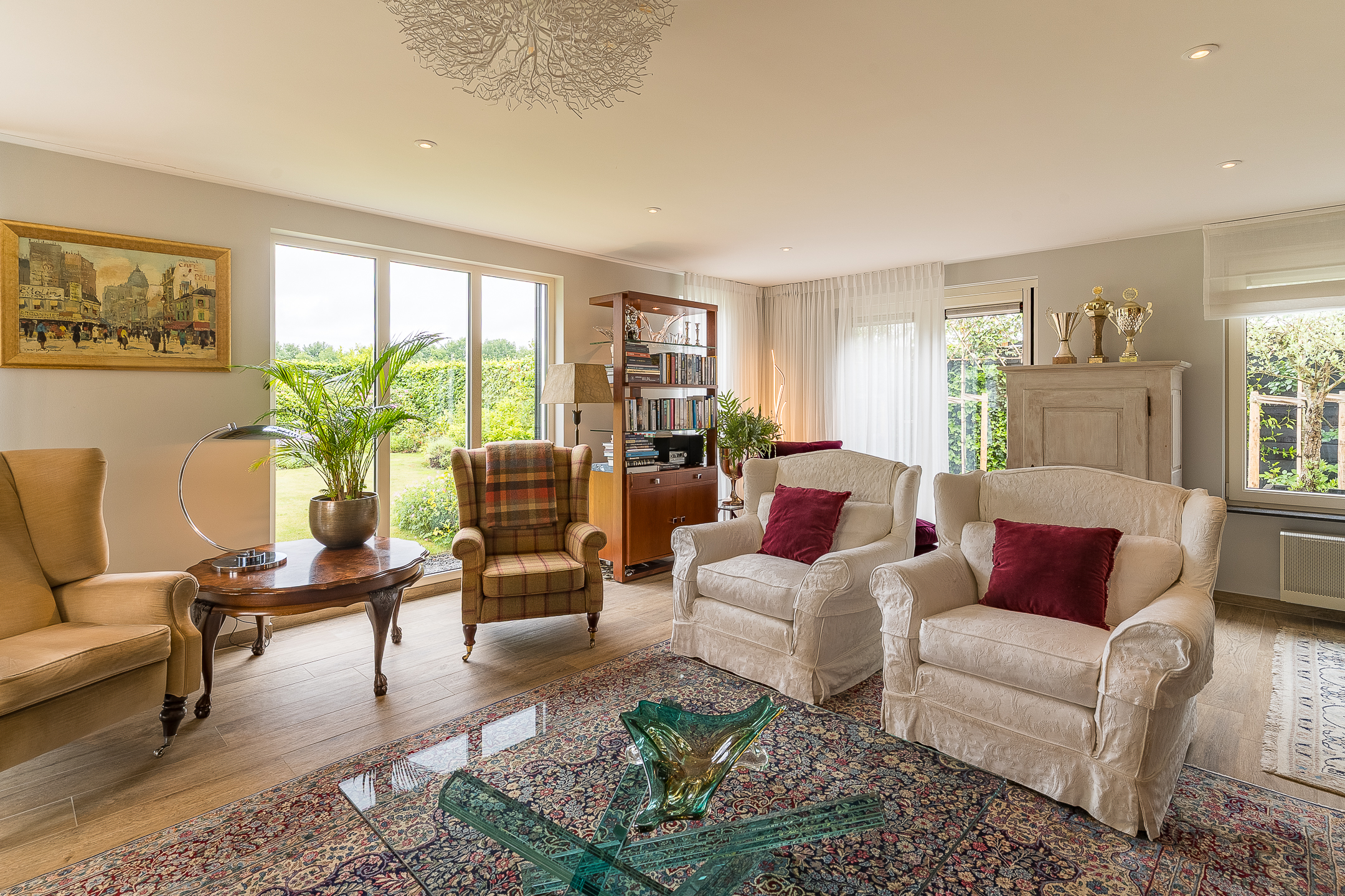 Linksom is er toegang tot het woon- en leefgedeelte, waar aan de voorzijde een ruime woonkamer tot uw beschikking is. De grote raampartijen rondom en de openslaande deuren aan weerszijden zorgen voor veel daglichtinval. Hier kunt u heerlijk tot rust komen en dankzij de ligging en de vormgeving van het perceel, geniet u hier ook van veel privacy. ’s Avonds doet u eenvoudig met één druk op de knop de gordijnen dicht.