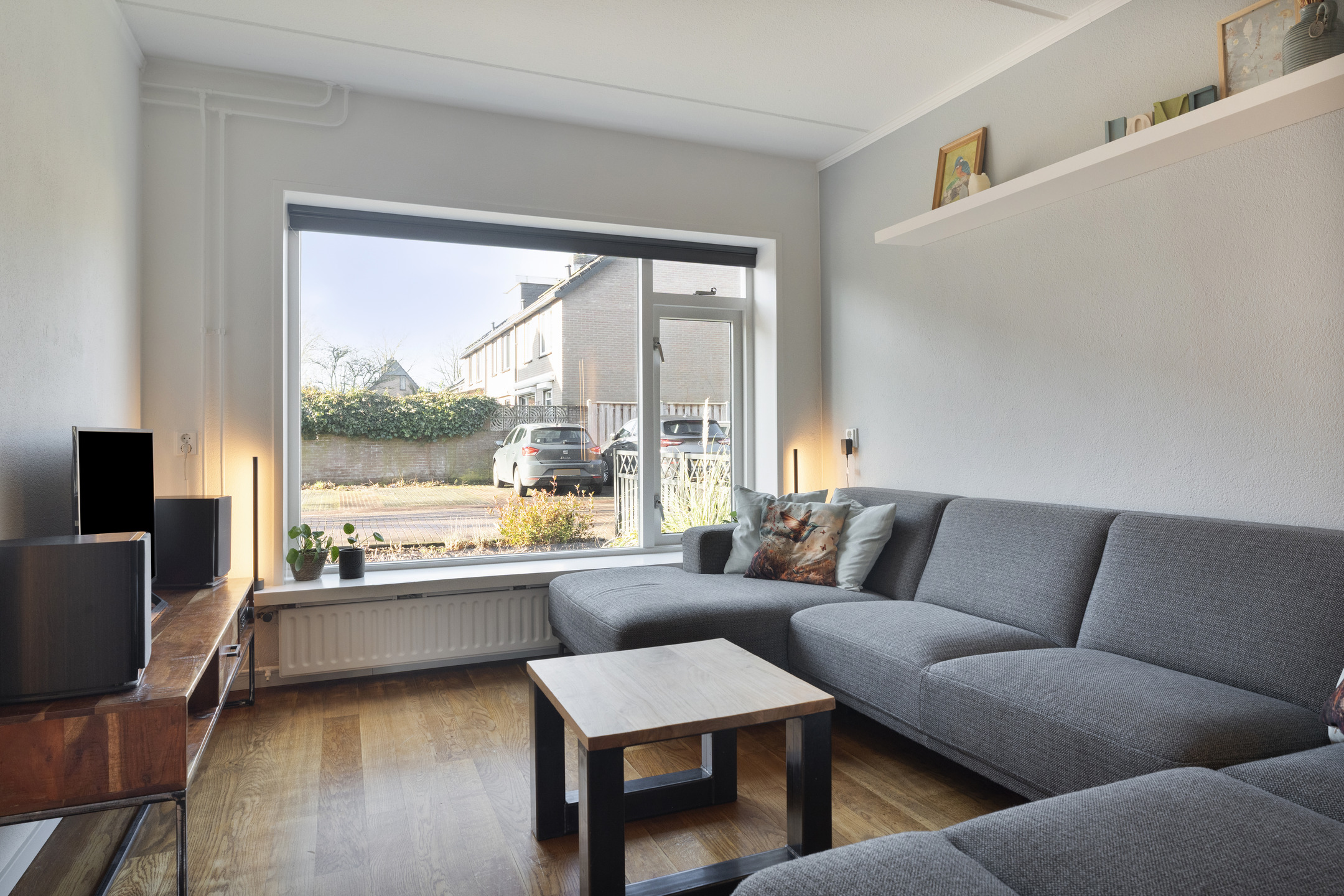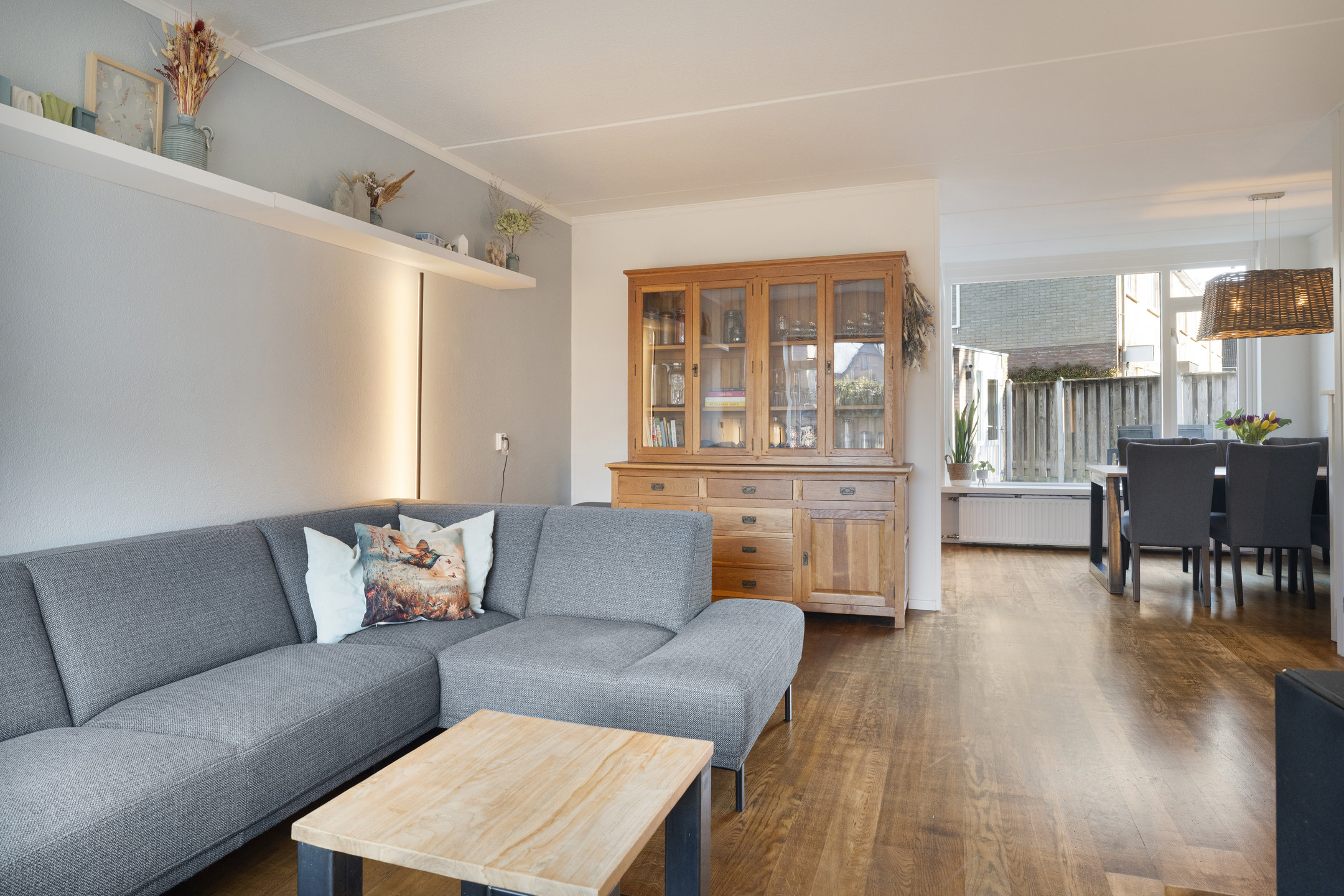De woonkamer is heerlijk licht dankzij de grote raampartijen aan zowel de voor- als achterzijde. Aan de voorzijde is ruimte voor een comfortabel zitgedeelte, terwijl je aan de achterzijde een royale eettafel kwijt kunt met uitzicht op de tuin. De houten vloer zorgt voor een warme uitstraling en maakt het geheel sfeervol.