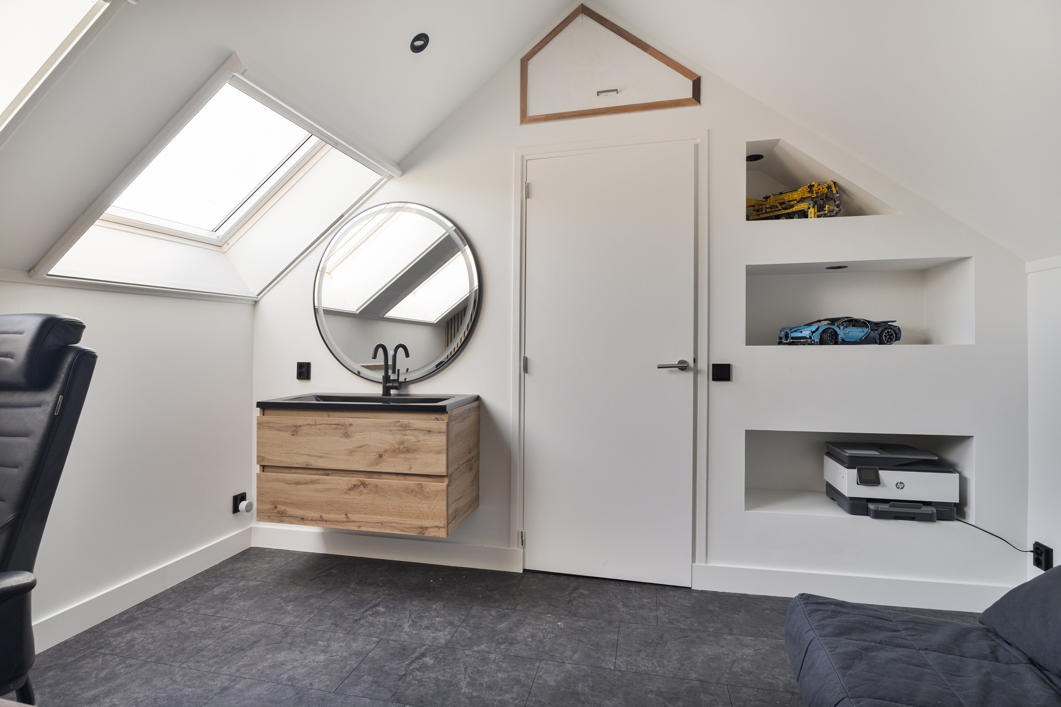 De vaste trap brengt je naar de zolderverdieping. Deze ruimte is recent aangepakt en volledig na-geïsoleerd. Hier is een volwaardige extra slaapkamer of werkkamer gerealiseerd, voorzien van een luxe wastafelmeubel met fontein. De dakramen zorgen voor een prettige lichtinval, waardoor het een fijne en comfortabele ruimte is om te slapen of te werken.