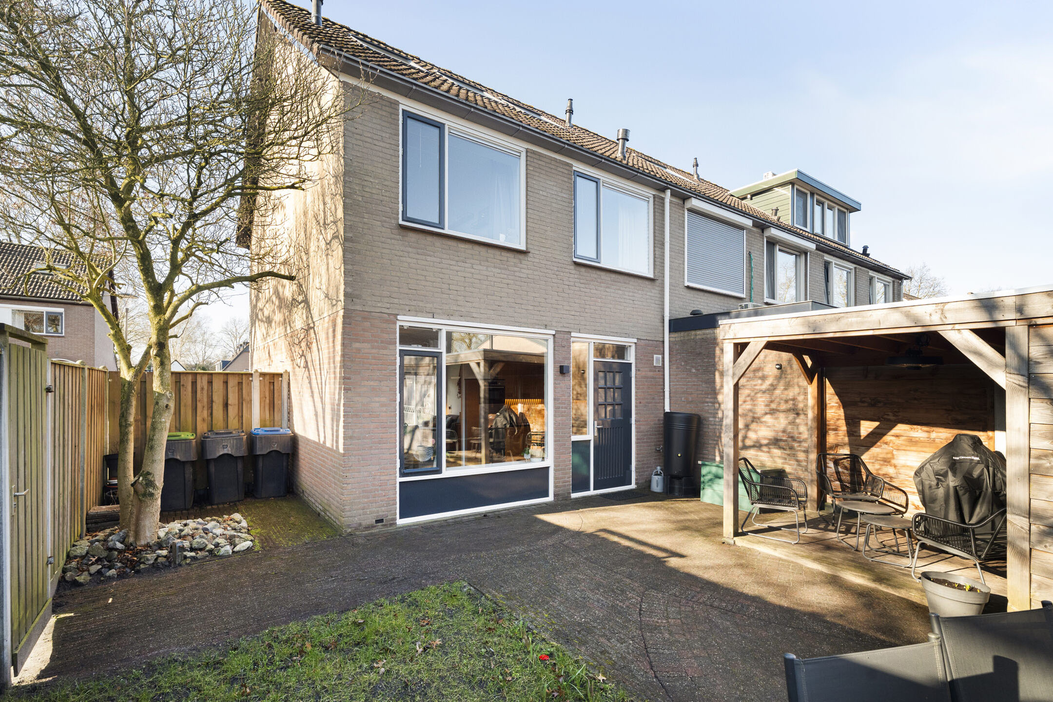 De achtertuin is onderhoudsvriendelijk aangelegd en biedt volop ruimte om te genieten van het buitenleven. Achterin de tuin staat een berging met daarnaast een fijne overkapping. Hier zit je al vroeg in het voorjaar beschut buiten en kun je lange zomeravonden doorbrengen met familie of vrienden. Een plek waar je echt tot rust komt.