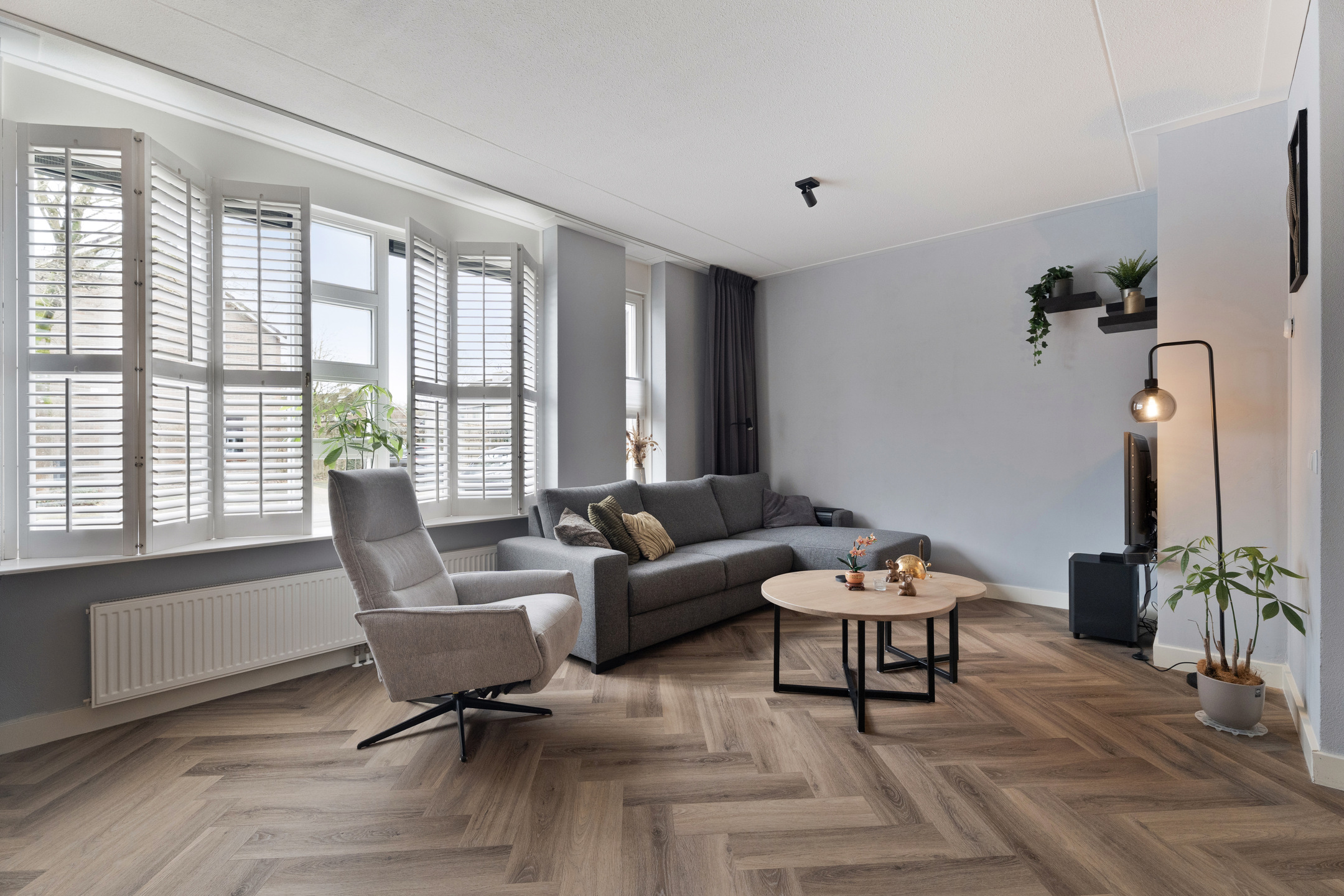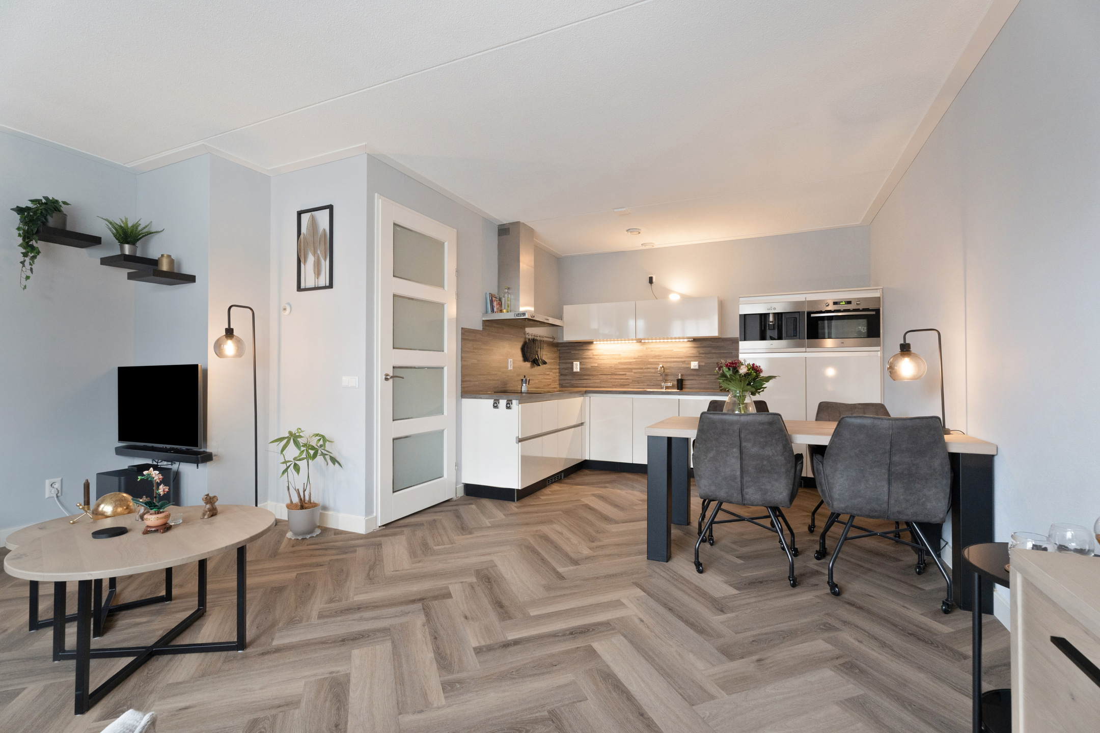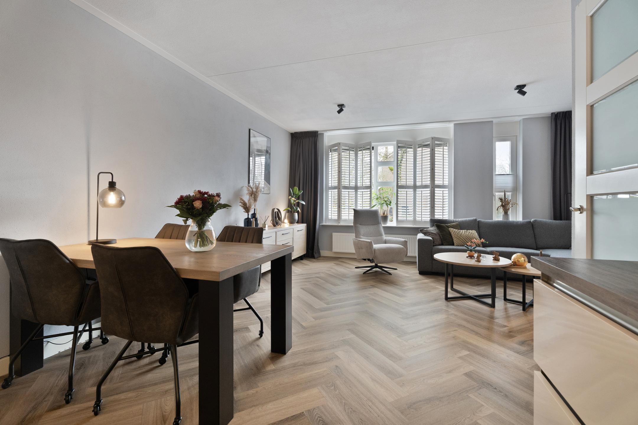 De woonkamer is heerlijk licht dankzij de erker aan de voorzijde, waar stijlvolle shutters zorgen voor sfeer én privacy. De ruimte is strak afgewerkt en voorzien van een moderne pvc-vloer in visgraatmotief. In open verbinding met de woonkamer ligt de keuken, die is uitgerust met een nette en complete hoekopstelling met diverse inbouwapparatuur. Dankzij de slimme indeling is er ook ruimte voor een gezellige eethoek.