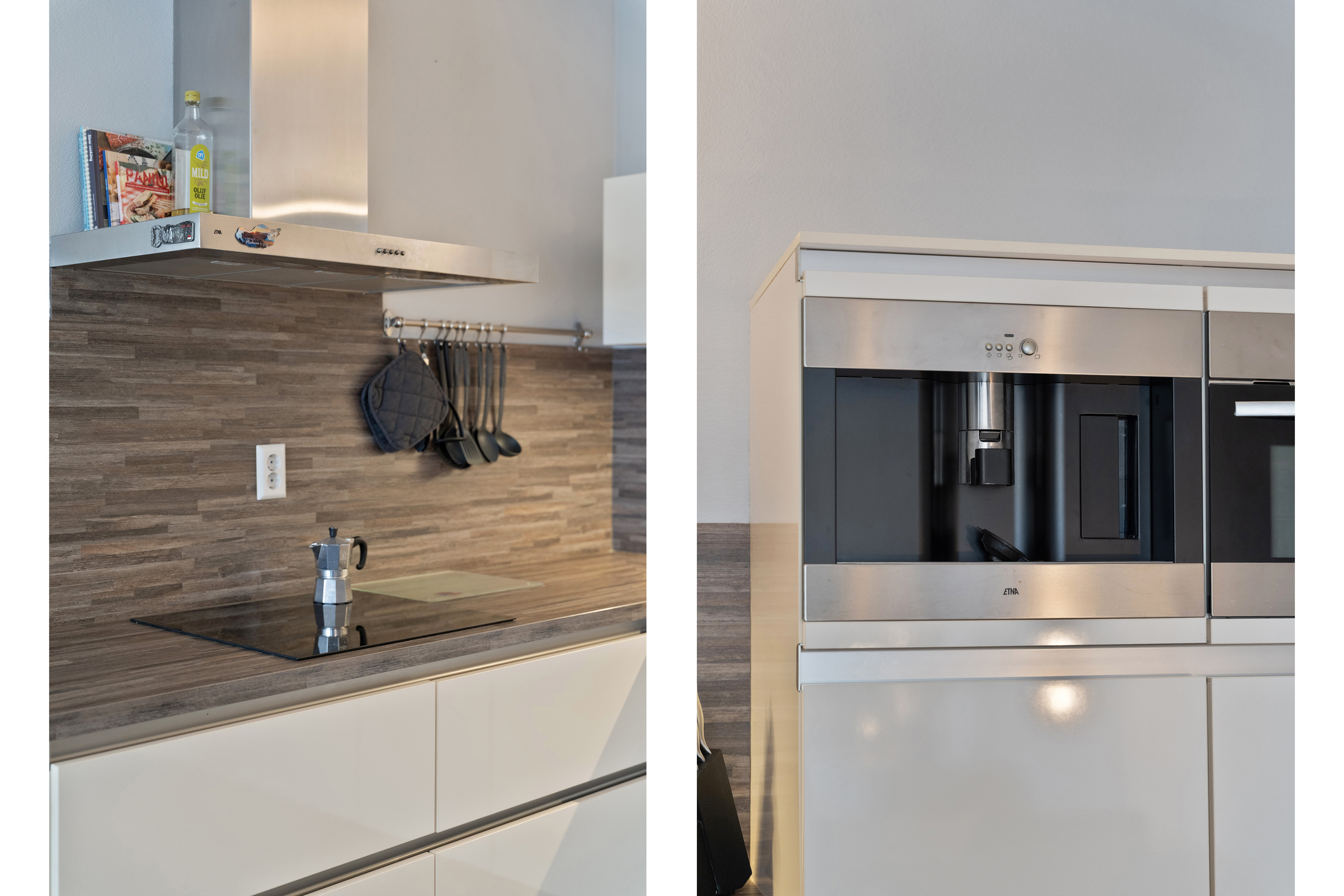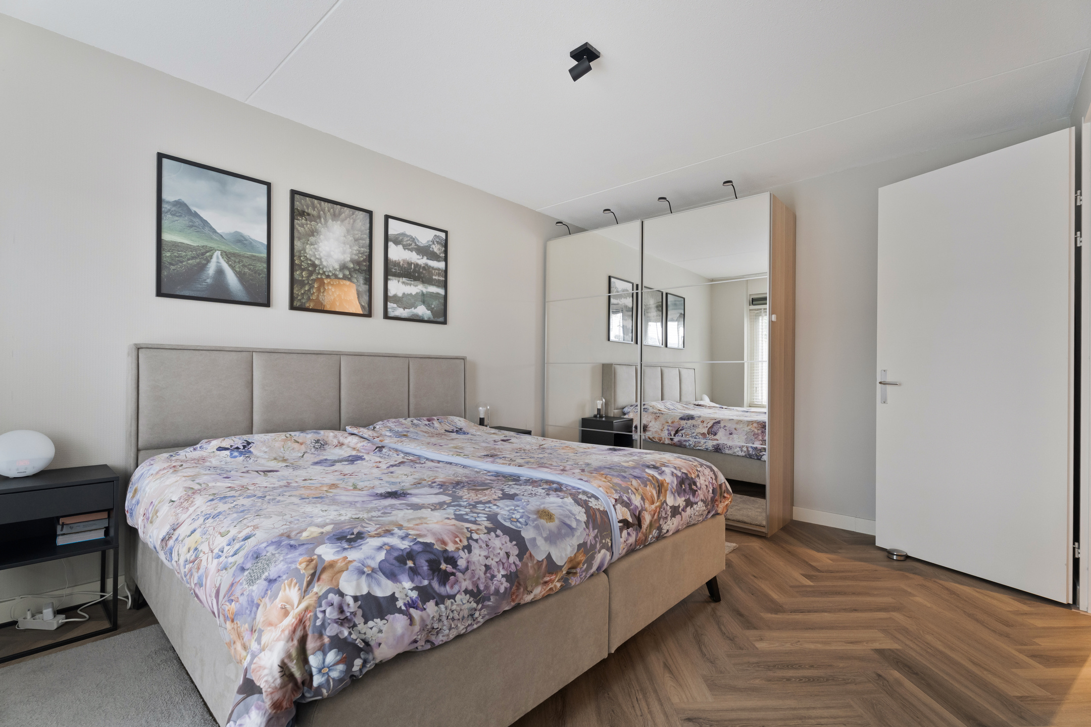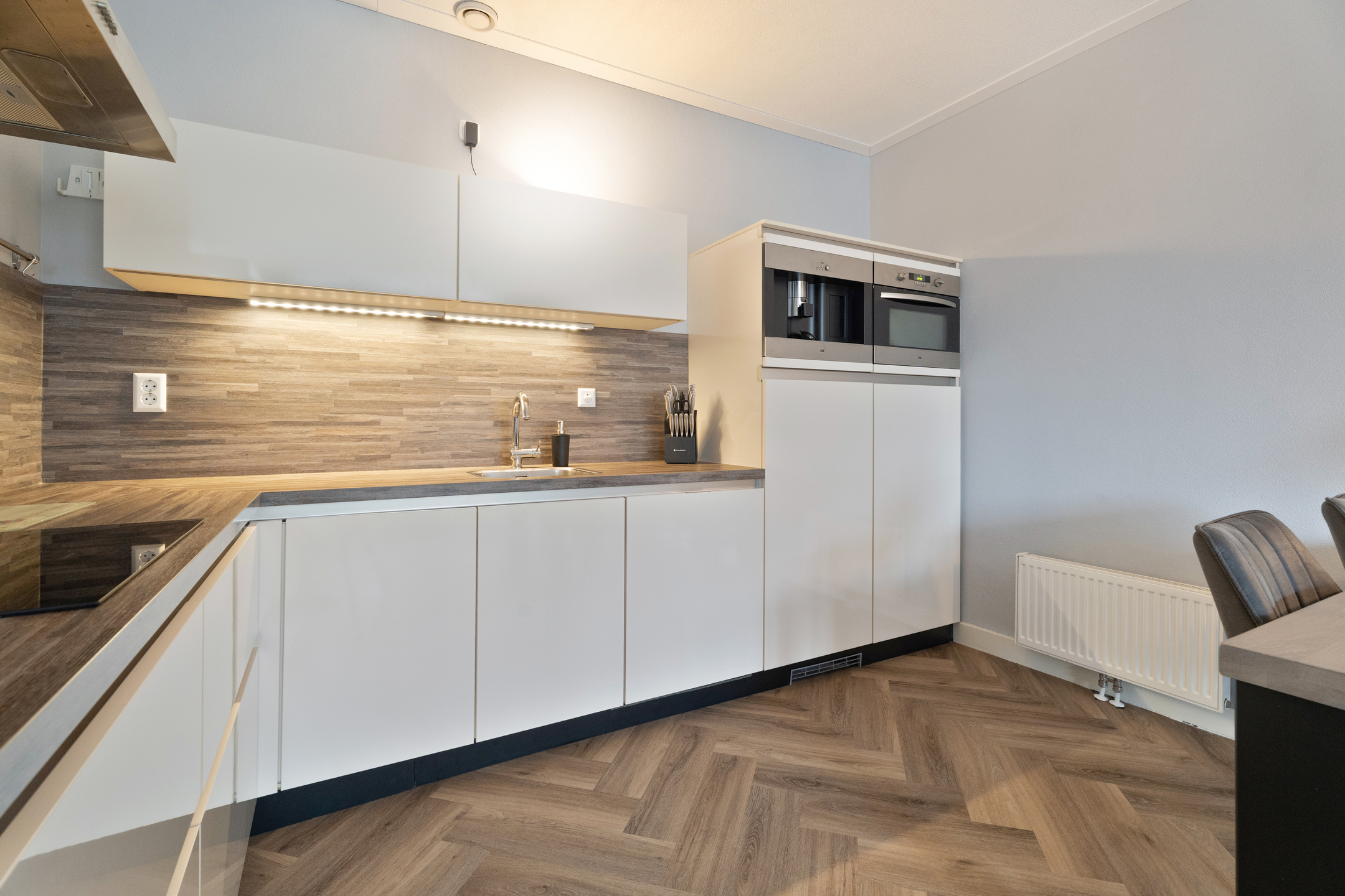 De woonkamer is heerlijk licht dankzij de erker aan de voorzijde, waar stijlvolle shutters zorgen voor sfeer én privacy. De ruimte is strak afgewerkt en voorzien van een moderne pvc-vloer in visgraatmotief. In open verbinding met de woonkamer ligt de keuken, die is uitgerust met een nette en complete hoekopstelling met diverse inbouwapparatuur. Dankzij de slimme indeling is er ook ruimte voor een gezellige eethoek.