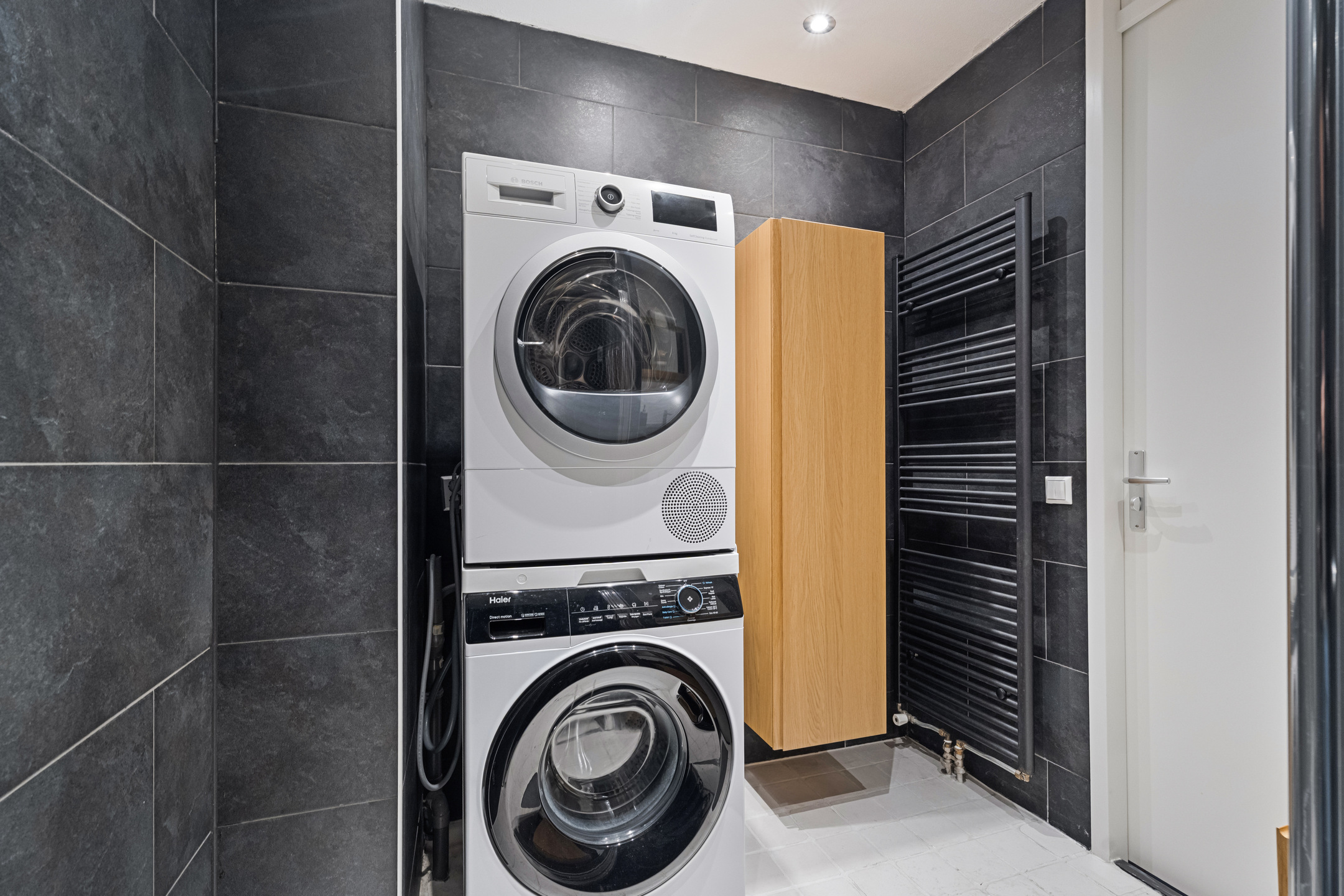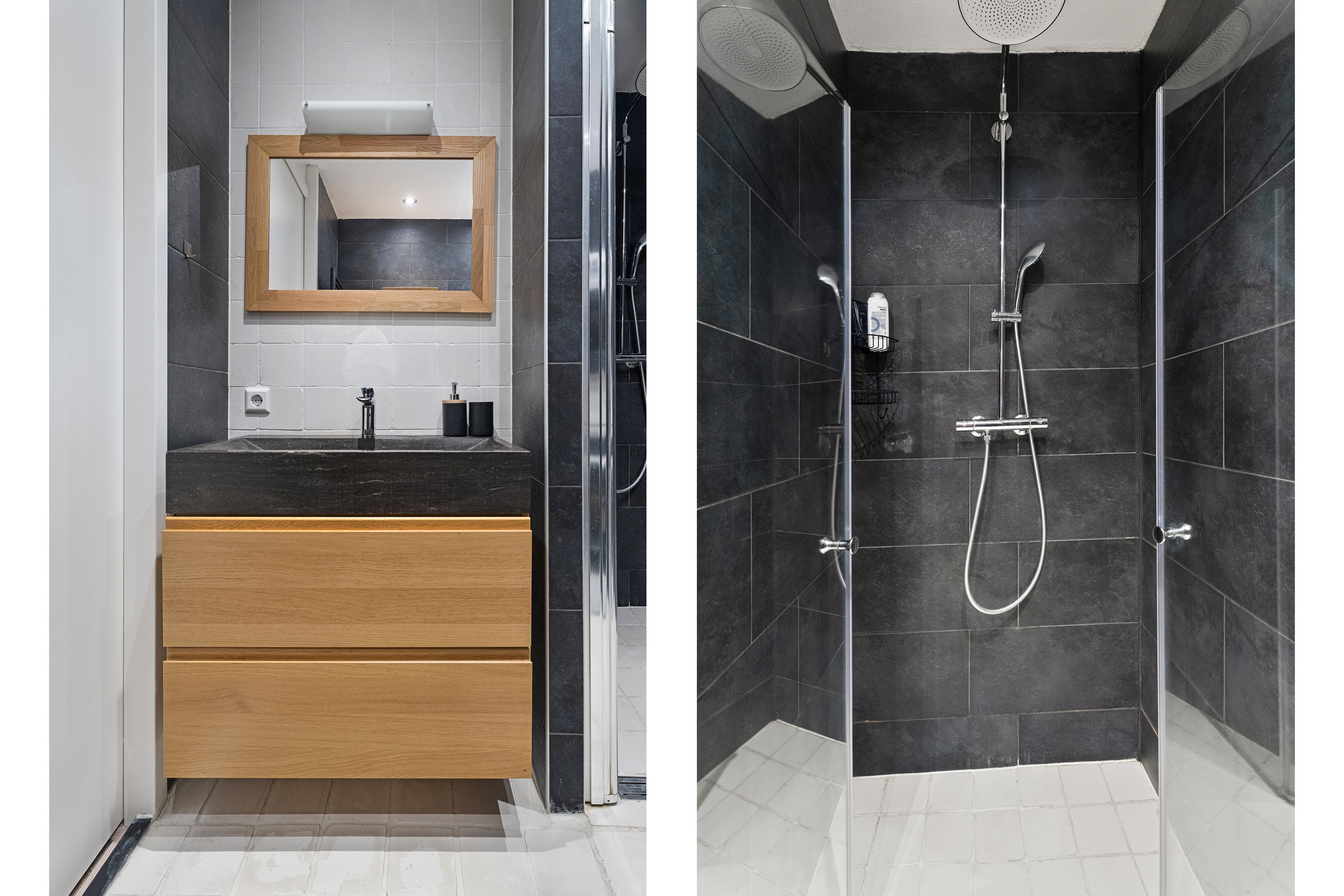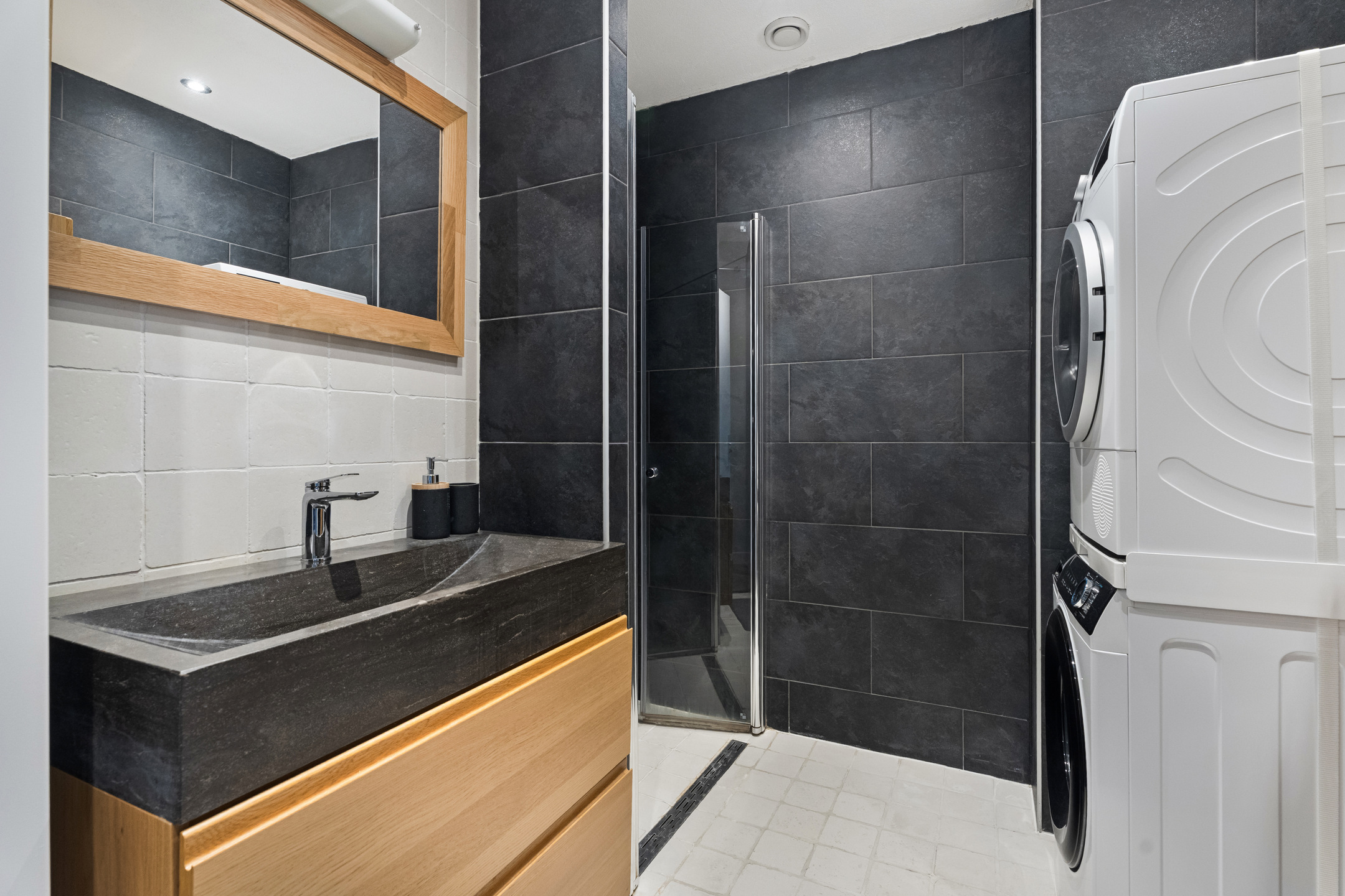 De badkamer is modern uitgevoerd met donkere wand- en vloertegels, een ruime inloopdouche en een stijlvol wastafelmeubel. Het toilet is apart gesitueerd, voorzien van fonteintje en uitgevoerd in dezelfde stijl. Tevens treffen we in de badkamer de aansluitingen aan voor de witgoedapparatuur.