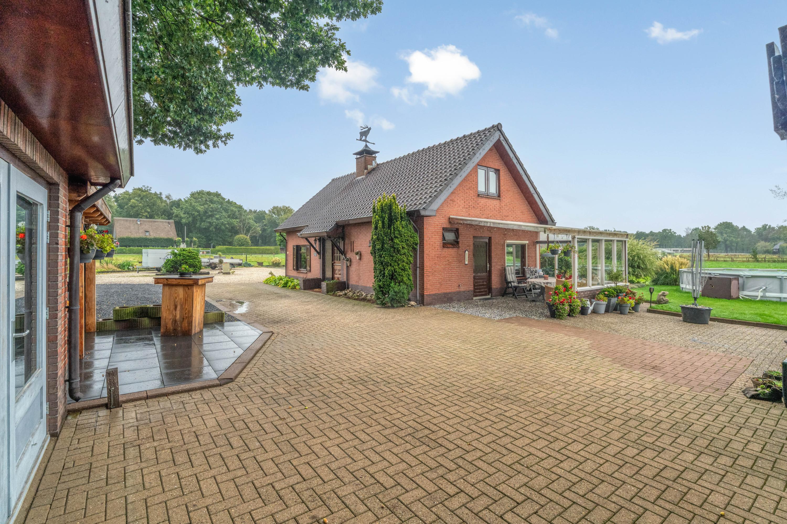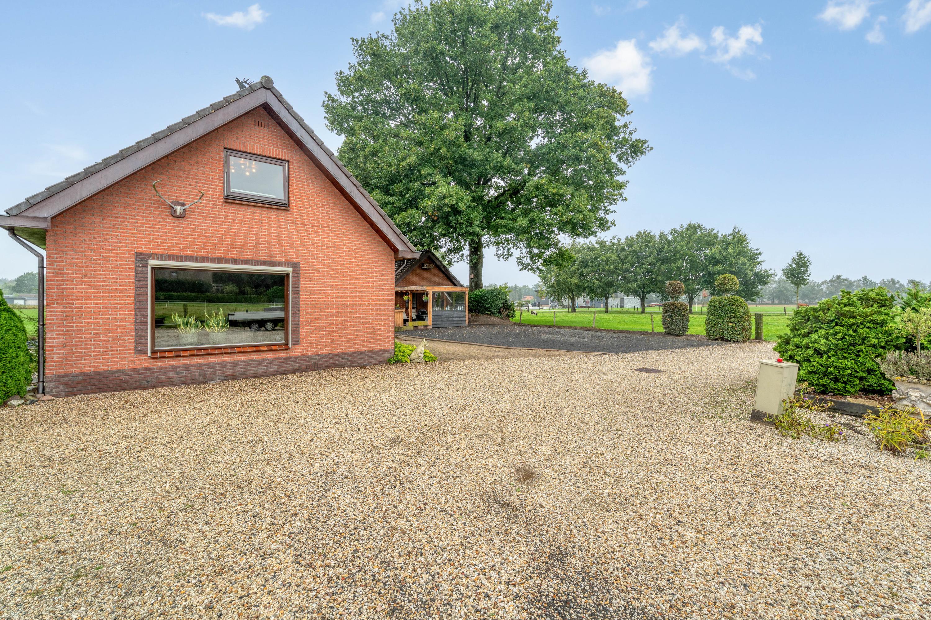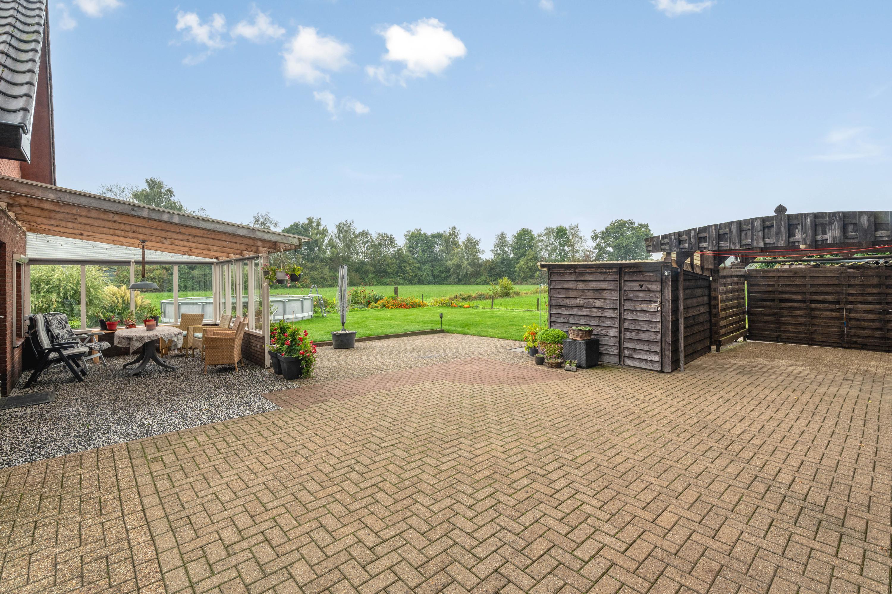 Aan de voorzijde is er ruimte om meerdere auto’s op eigen terrein te parkeren. De diepe achtertuin grenst aan open landerijen, wat een gevoel van vrijheid en privacy-volle buitenruimte geeft.