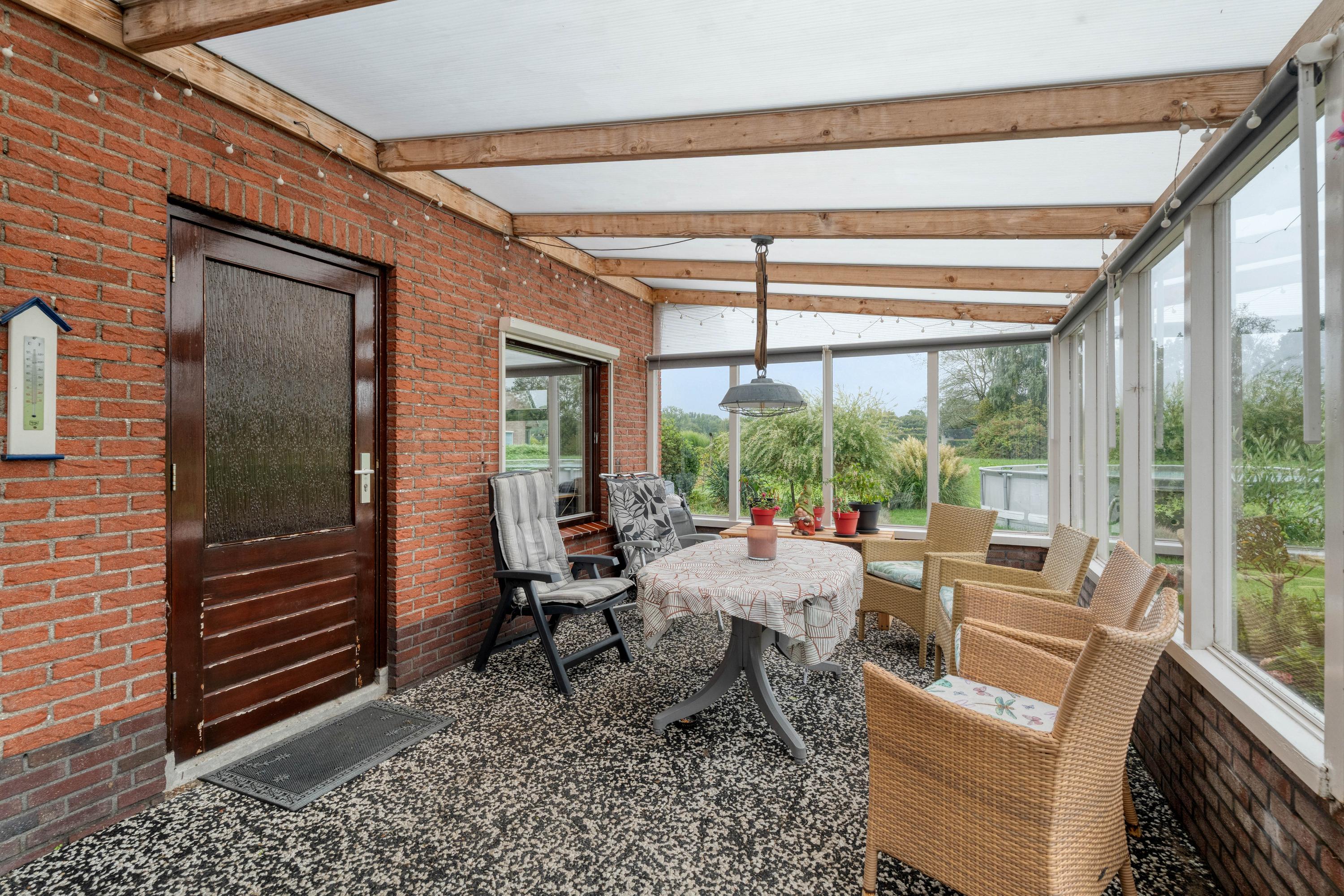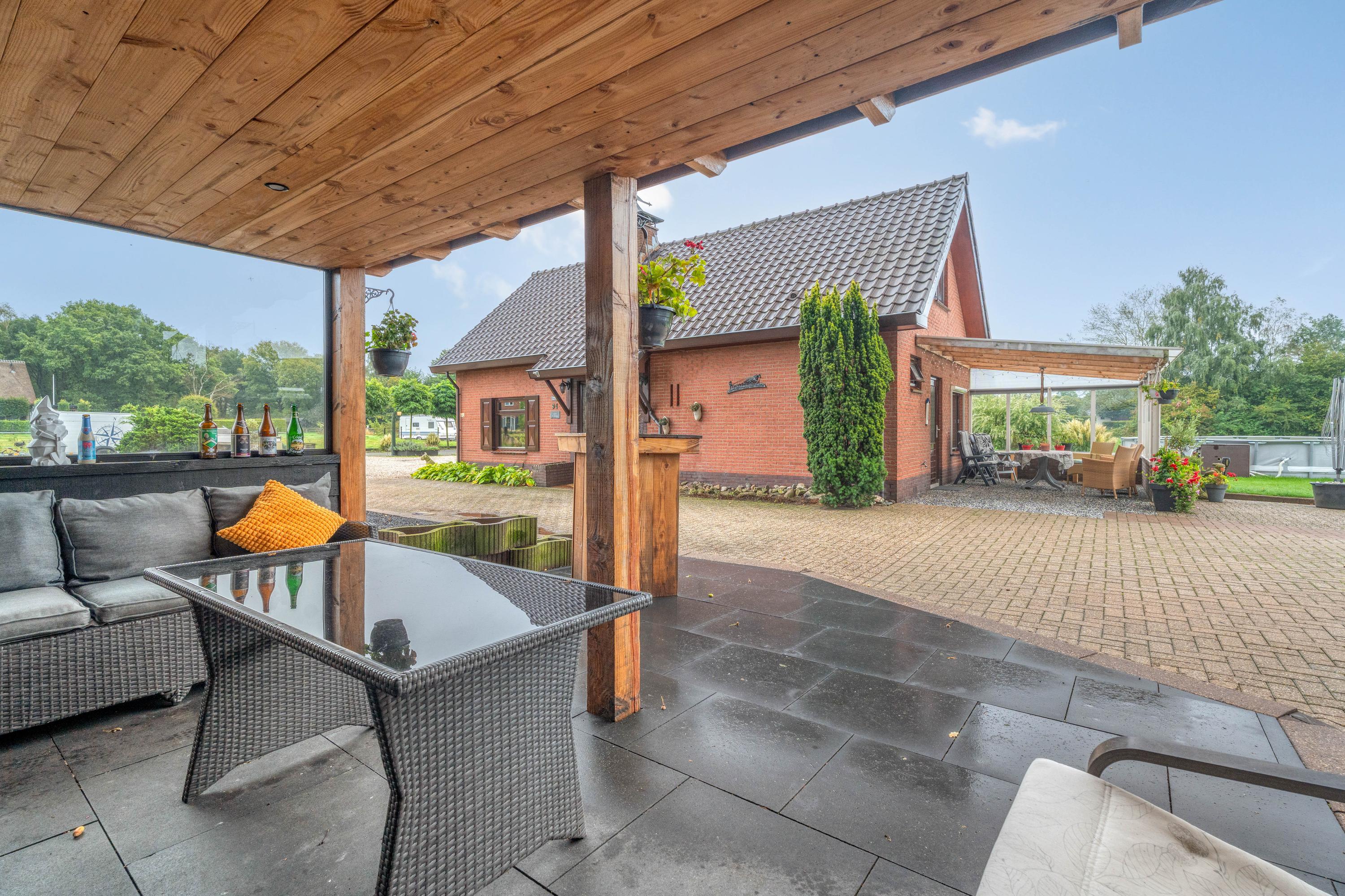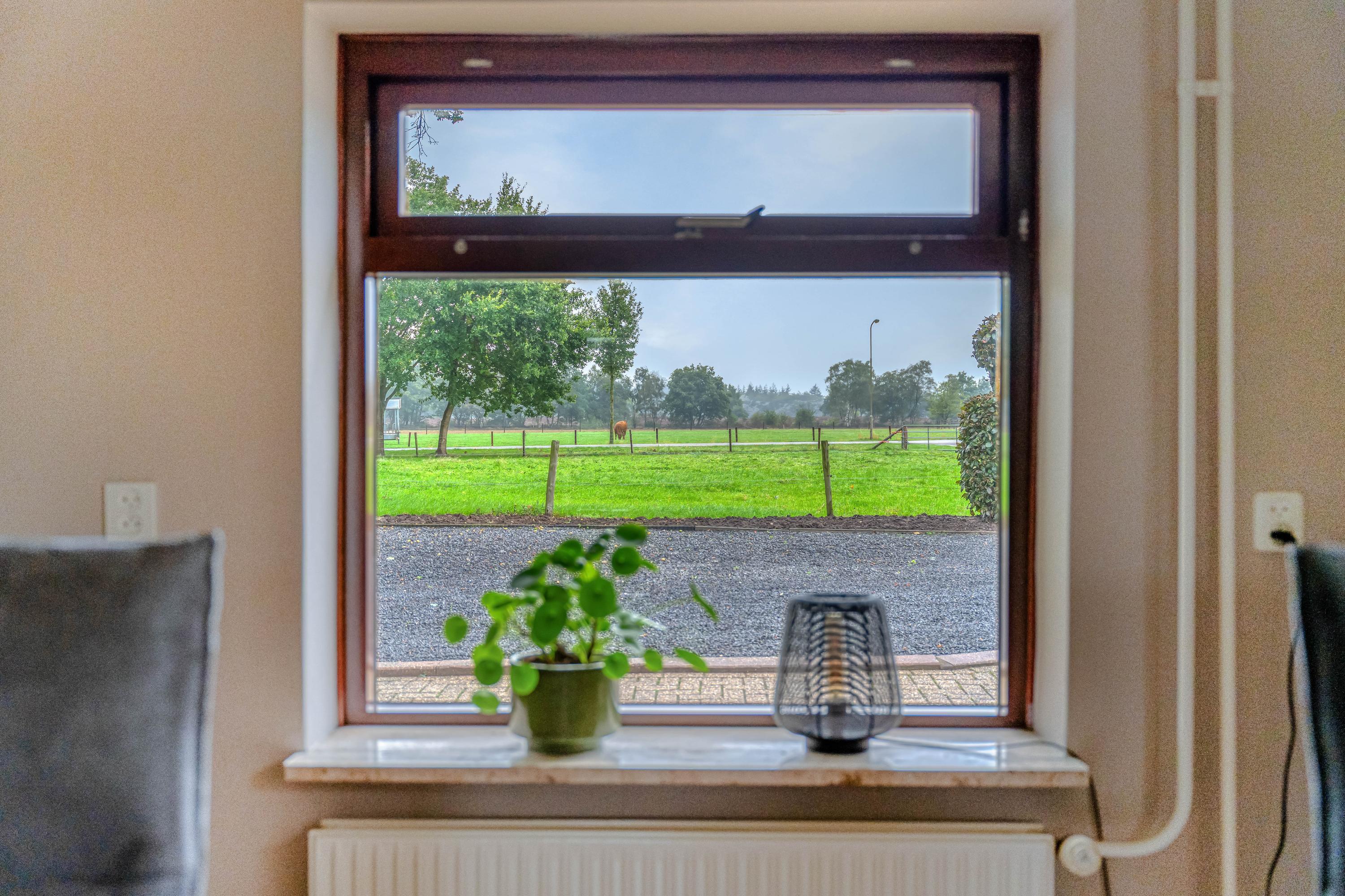 Aan de voorzijde is er ruimte om meerdere auto’s op eigen terrein te parkeren. De diepe achtertuin grenst aan open landerijen, wat een gevoel van vrijheid en privacy-volle buitenruimte geeft.