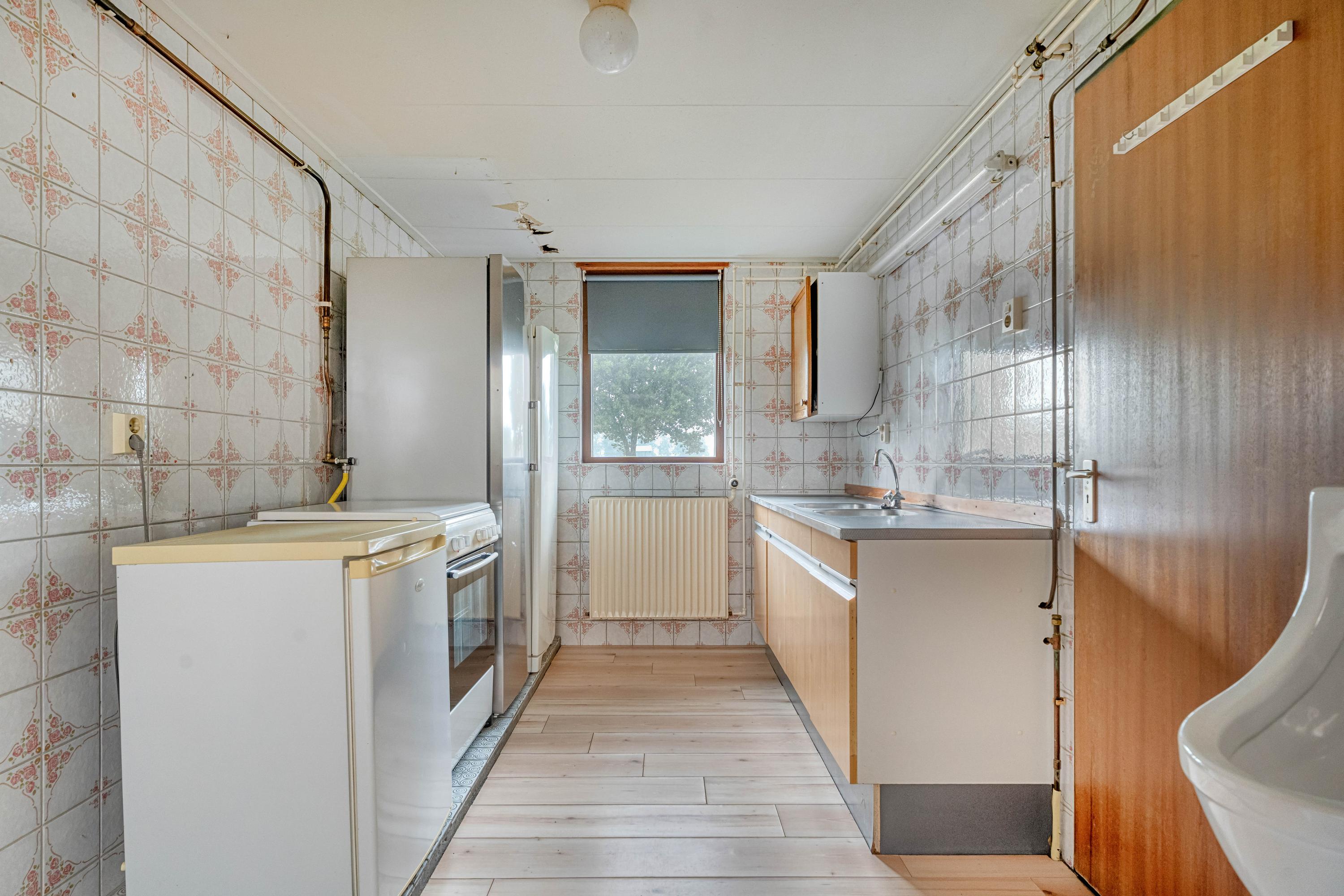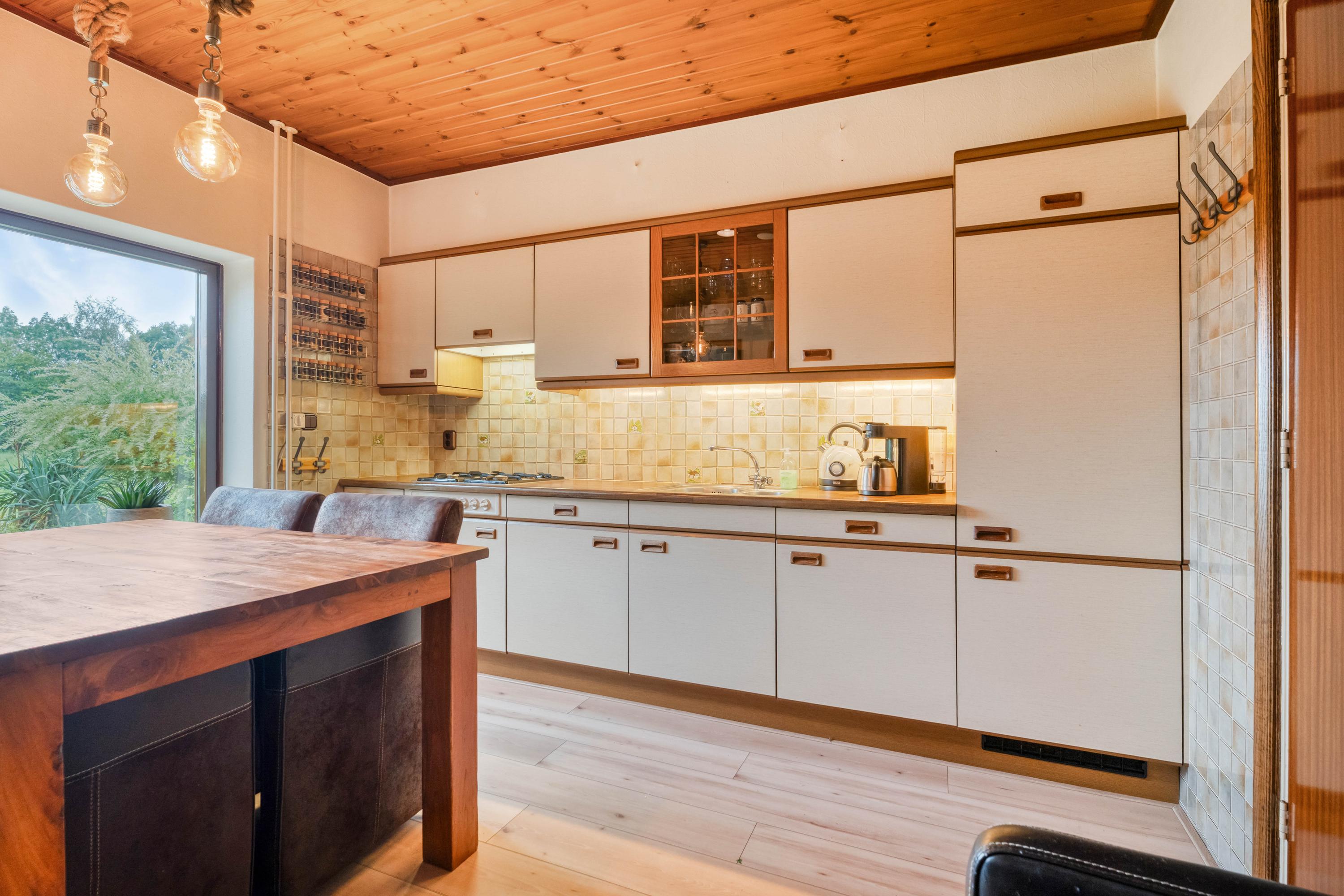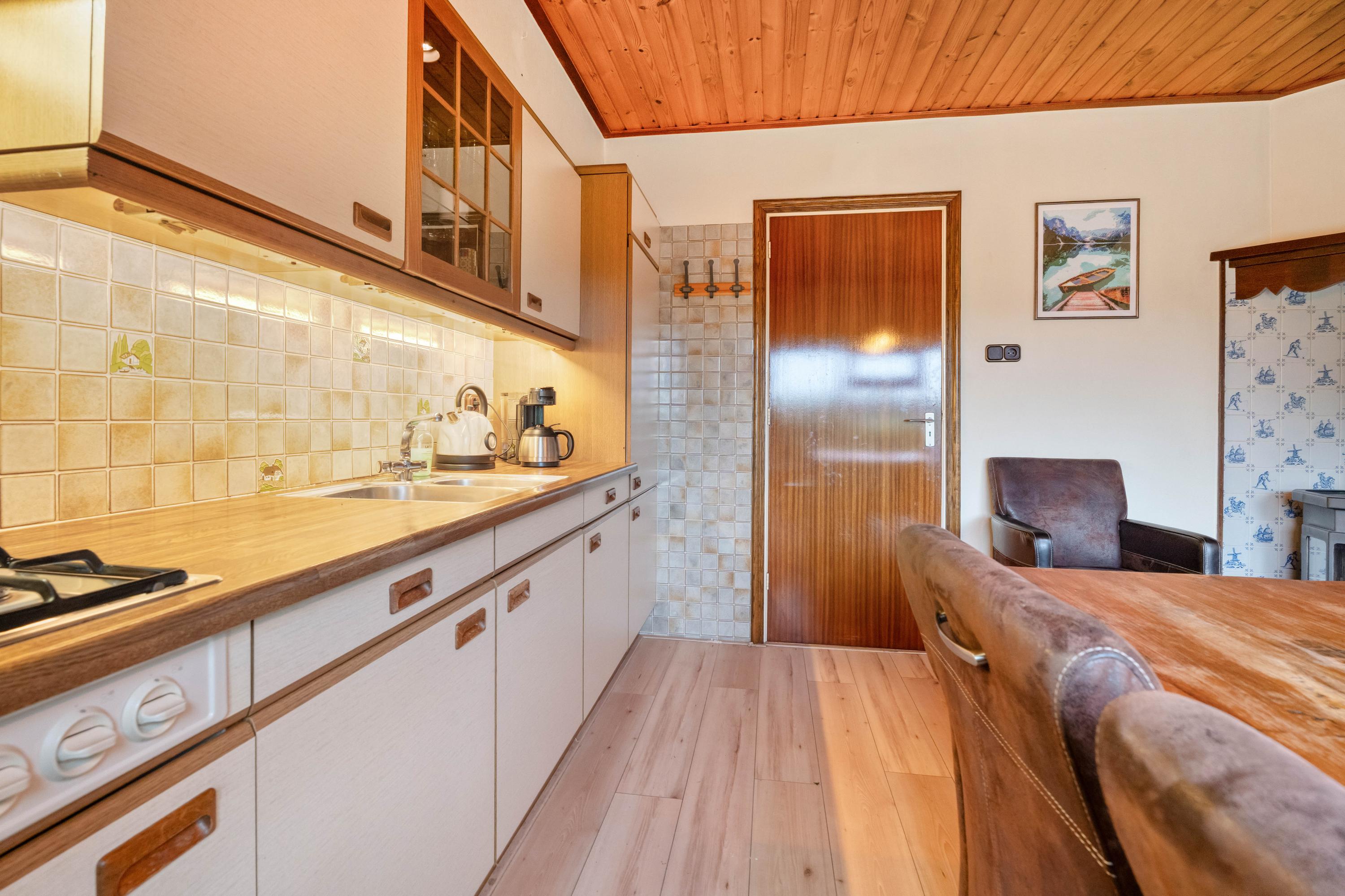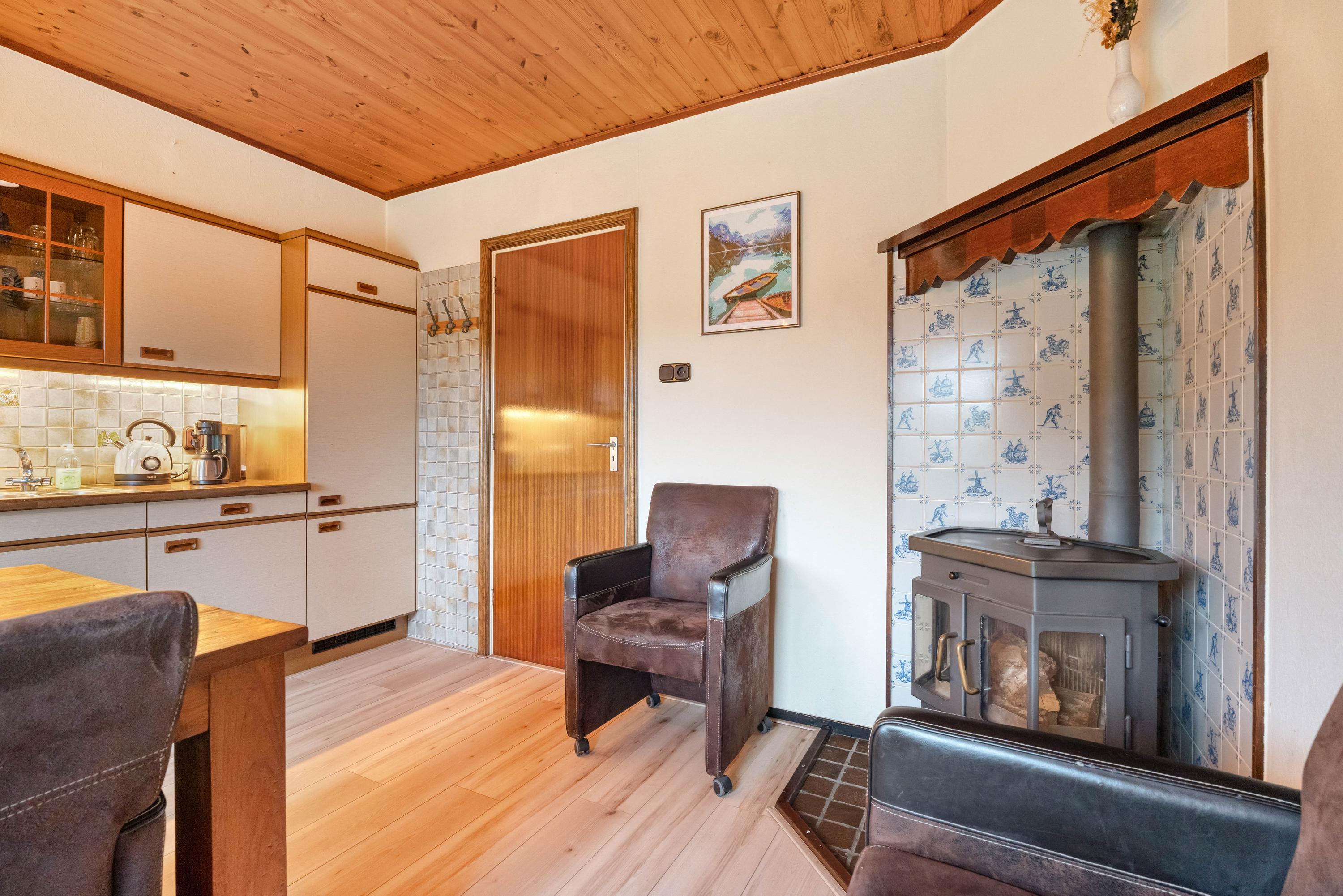 U komt binnen via de hal aan de zijkant van de woning. Hier treft u het toilet, de trapopgang en toegang tot de woonkeuken. In deze ruimte is een eenvoudige keukeninrichting aanwezig, een fijne houtkachel en ruimte voor een eethoek. Via de hal heeft u toegang tot de overkapping/tuin rondom de woning.
