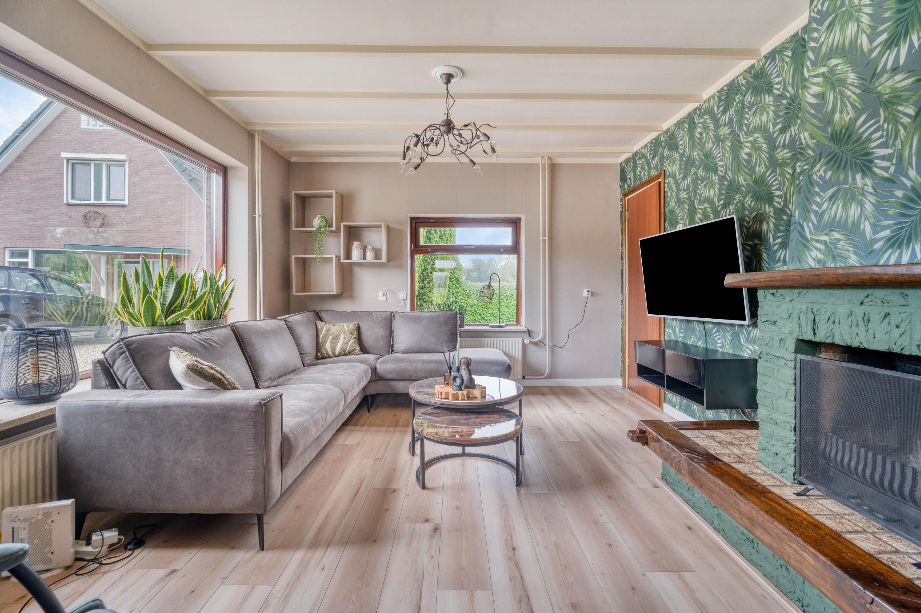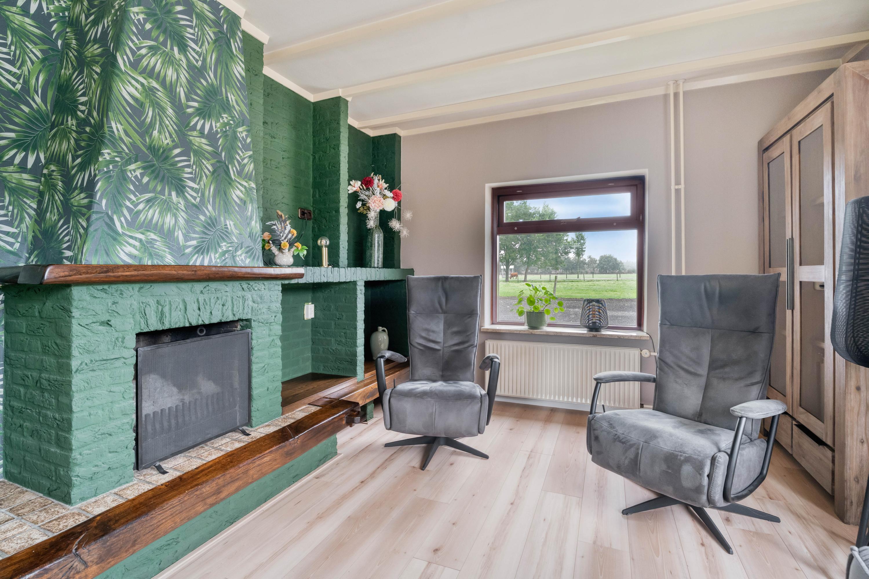 Aansluitend aan de woonkeuken ligt de woonkamer, deze is licht en ruim, met grote raampartijen die een prachtig uitzicht geven over het omliggende landschap. Een houtkachel zorgt ook hier voor extra sfeer en warmte in de koudere maanden.