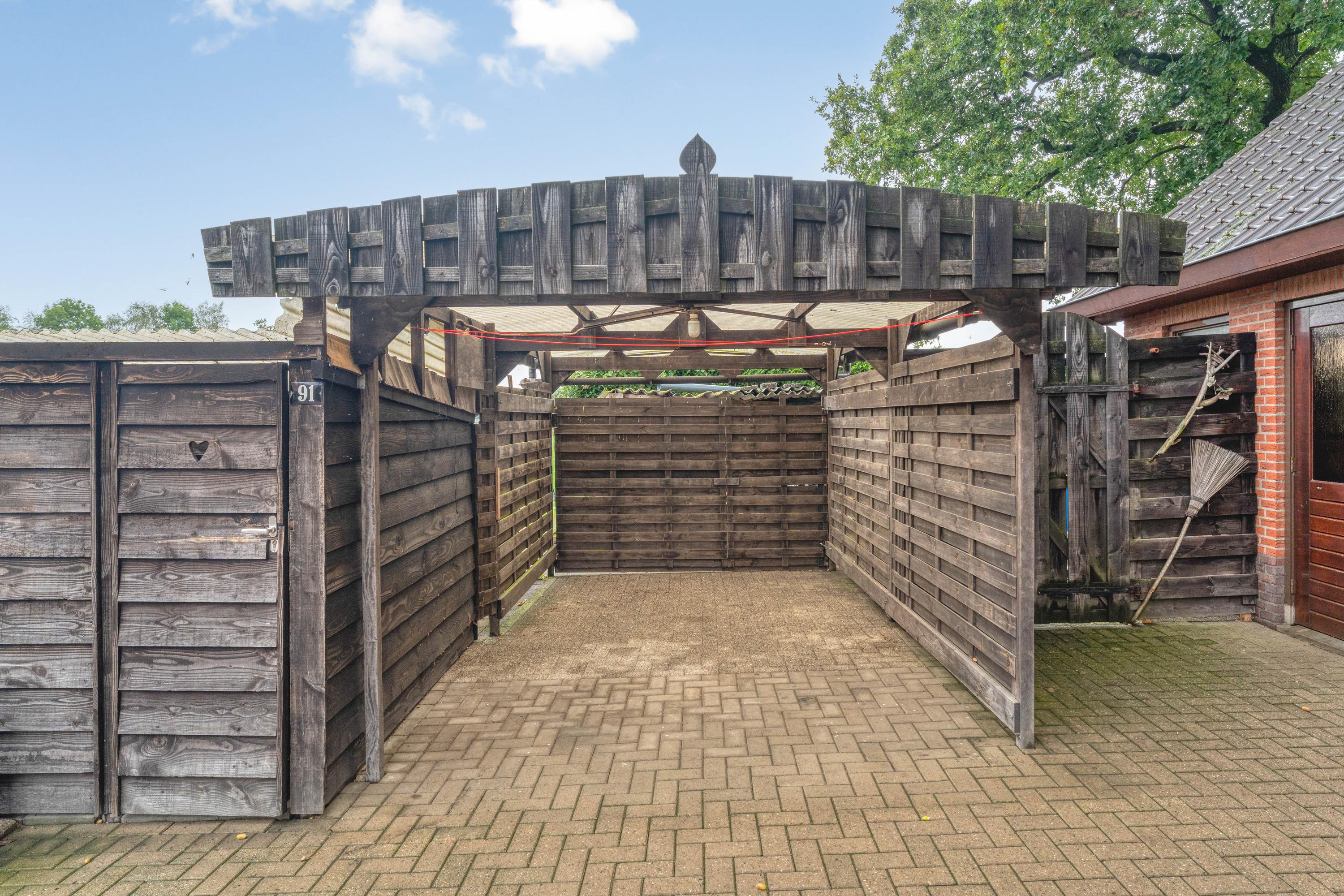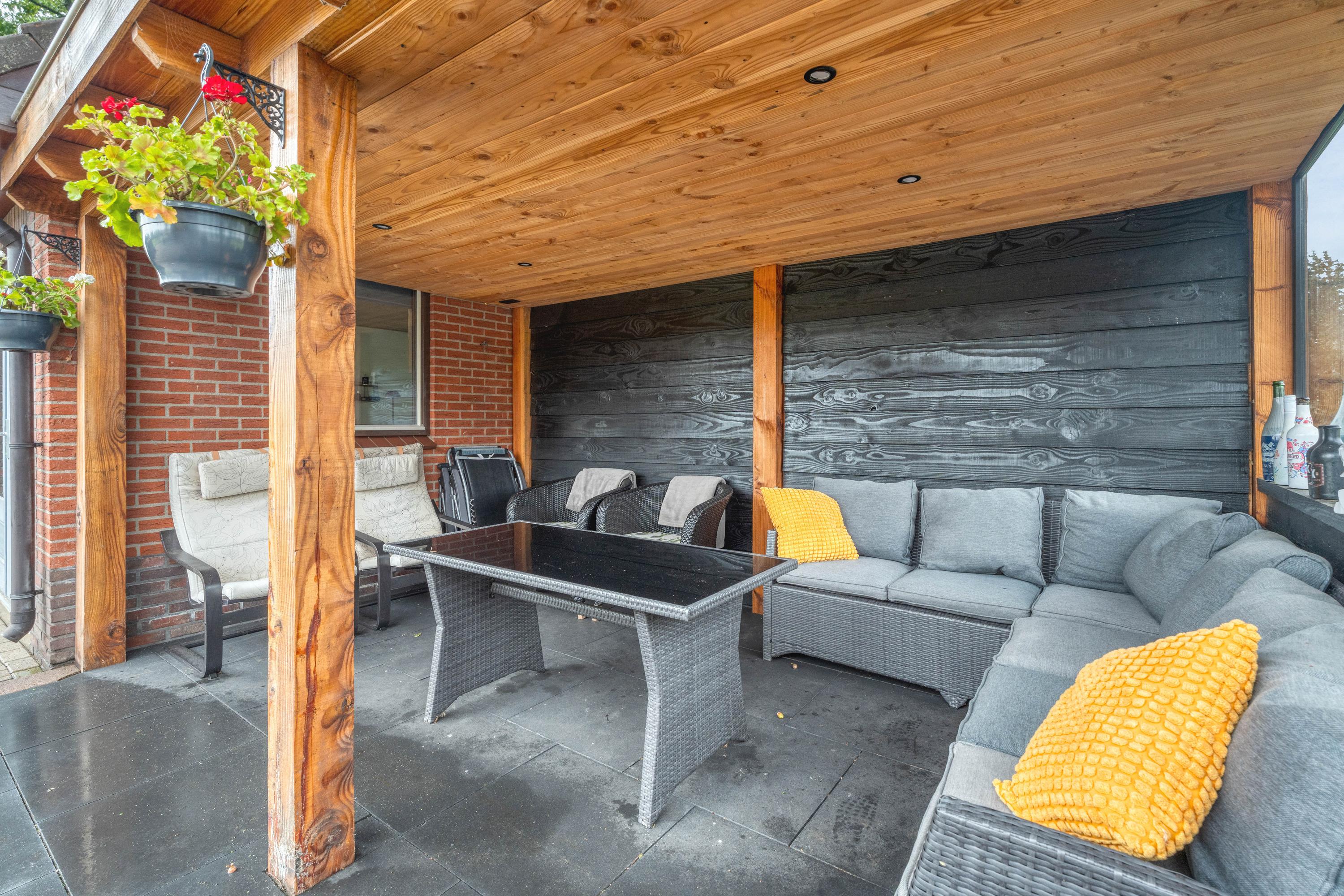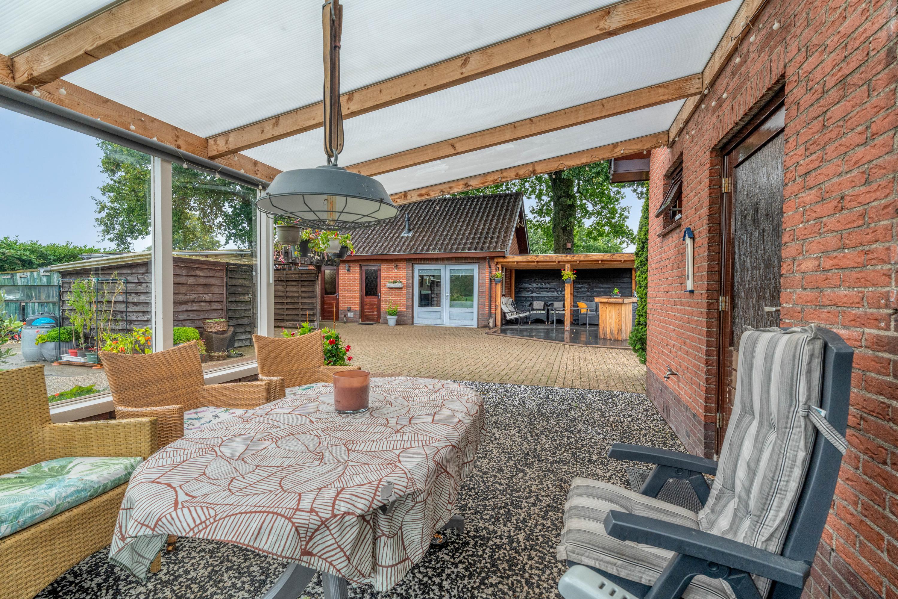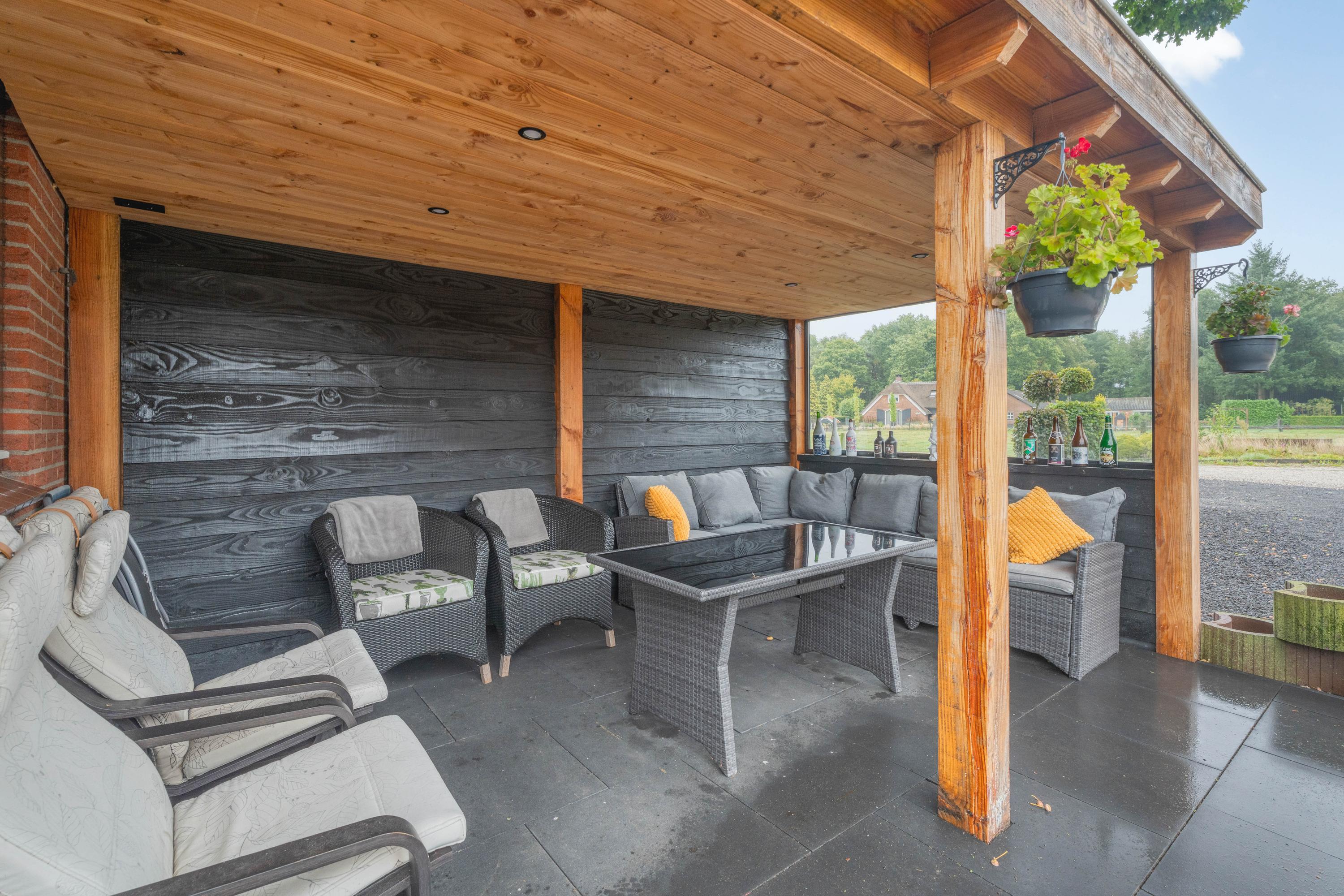 Daarnaast is er een eenvoudige carport en zowel aan de achterzijde van de woning alsook aan het bijgebouw een overkapping geplaatst, zodat er op verschillende plekken genoten kan worden van het buitenleven.