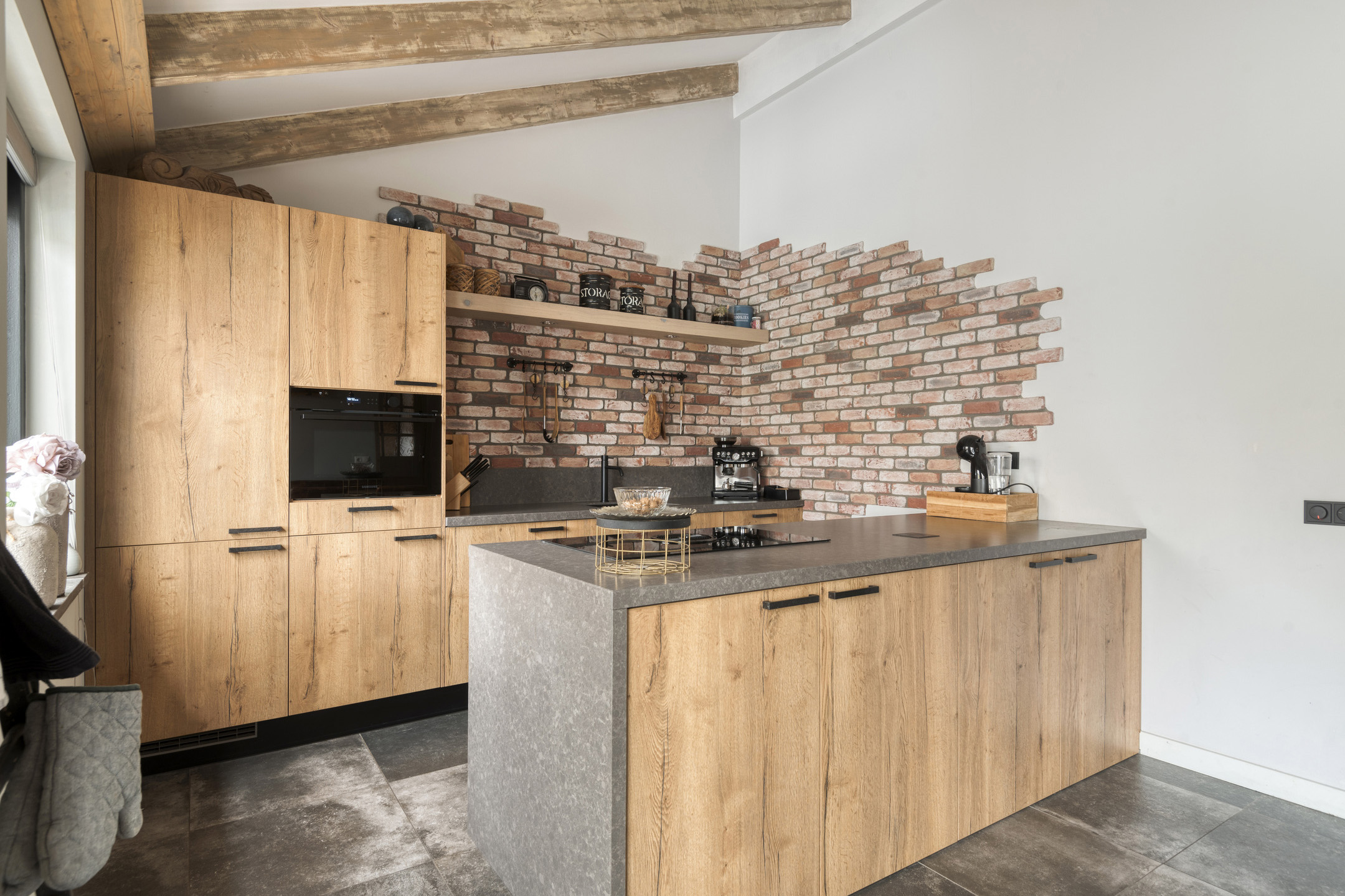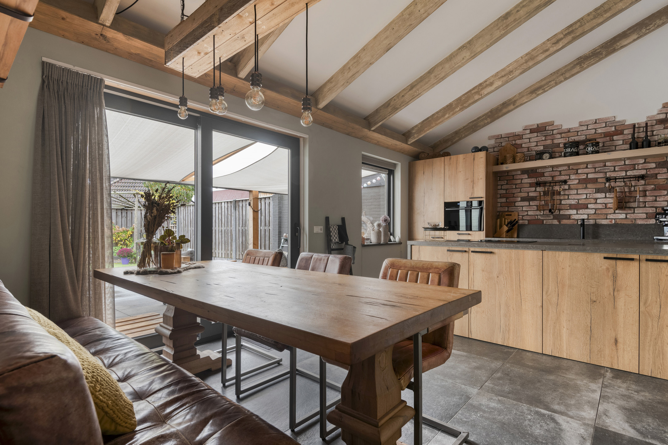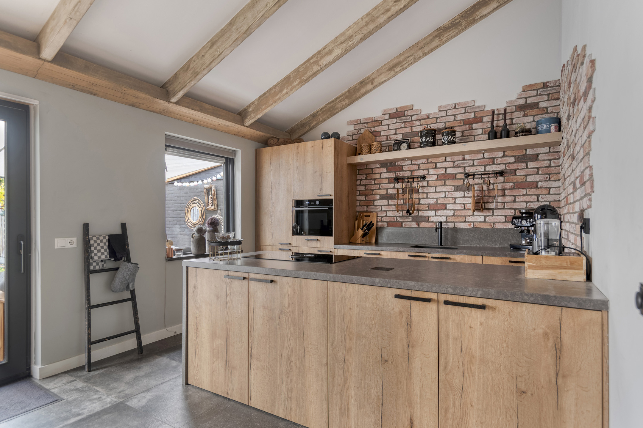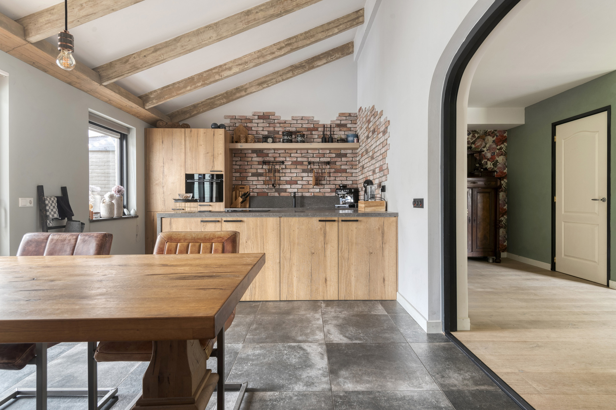 Het hart van het huis bevindt zich aan de achterzijde: een uitgebouwde, sfeervolle woonkeuken die met zijn houten balken, bakstenen wand en robuuste keukenopstelling een warme uitstraling heeft. Hier is ruimte om te koken, tafelen én lang na te praten. De keuken is voorzien van een royaal kookeiland, ingebouwde apparatuur en veel werk- en bergruimte. De schuifpui verbindt de keuken met het overdekte terras in de achtertuin.