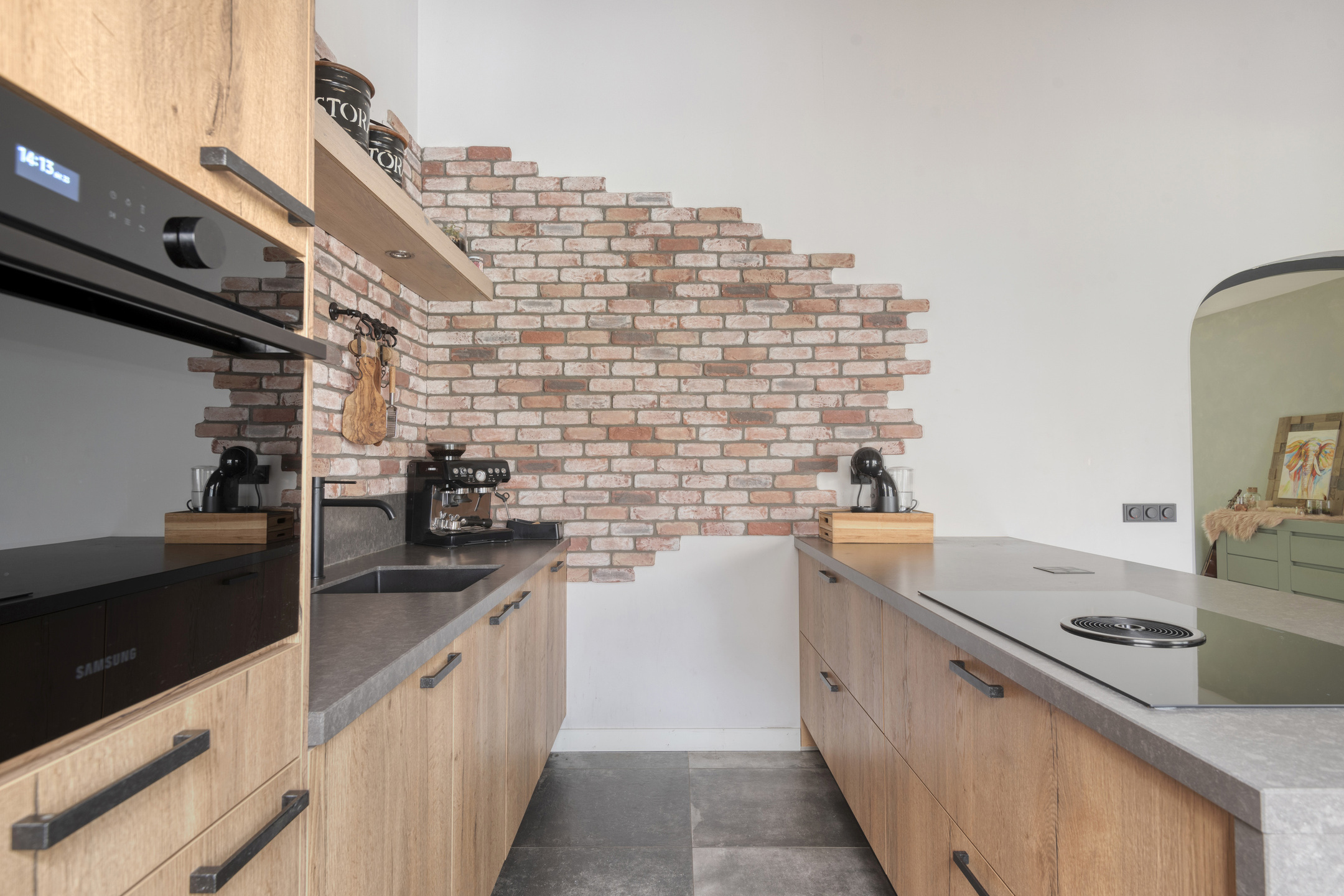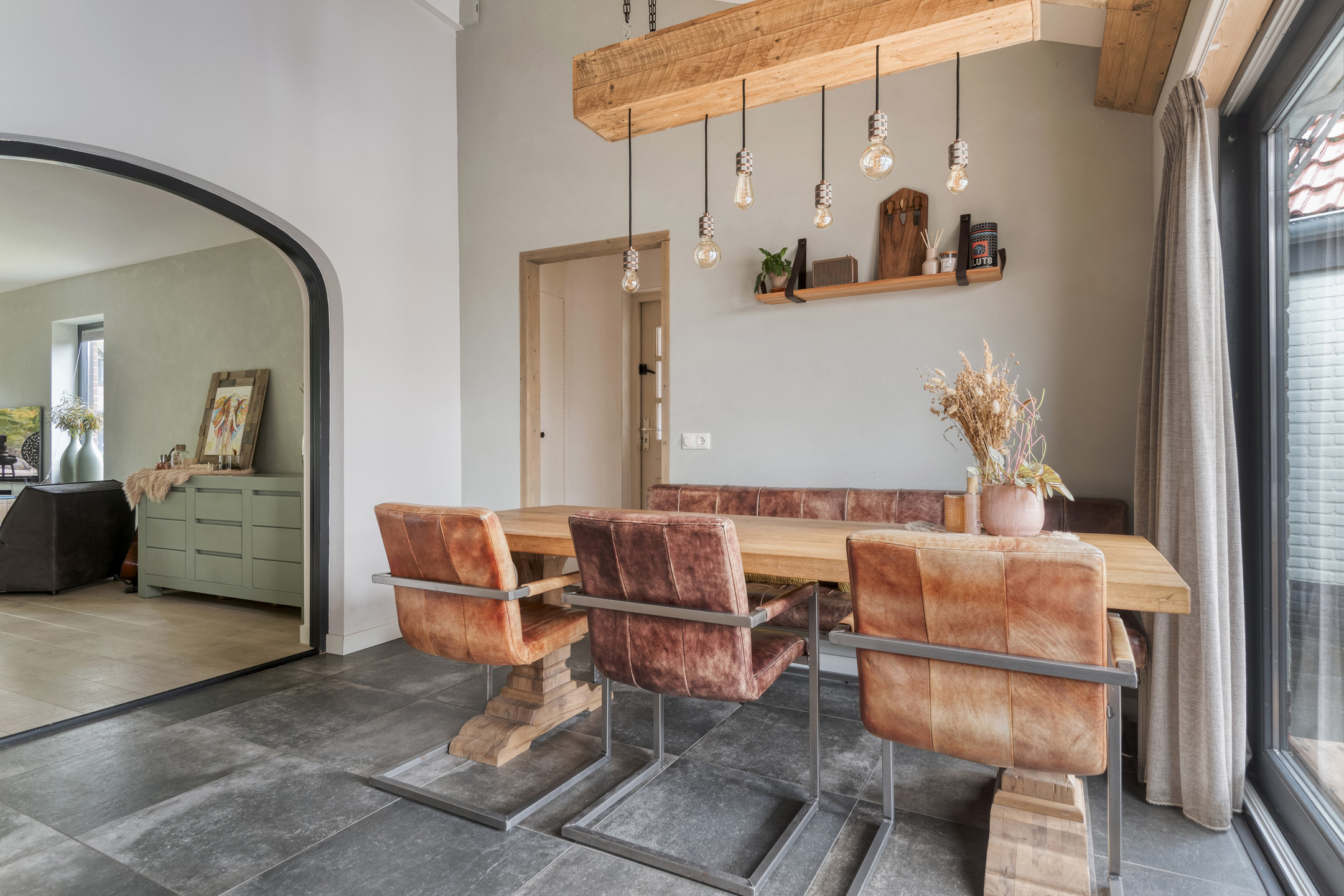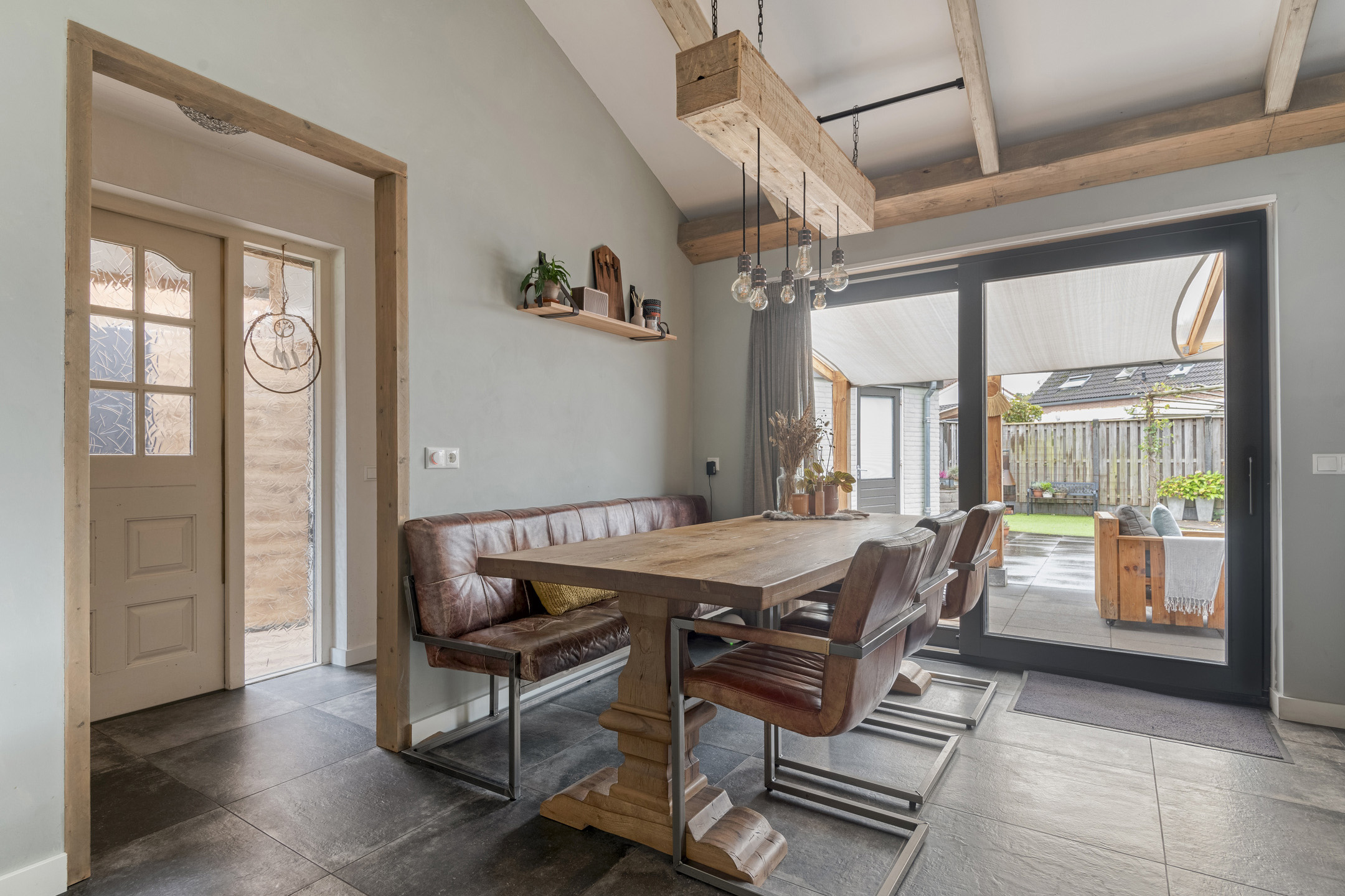 Het hart van het huis bevindt zich aan de achterzijde: een uitgebouwde, sfeervolle woonkeuken die met zijn houten balken, bakstenen wand en robuuste keukenopstelling een warme uitstraling heeft. Hier is ruimte om te koken, tafelen én lang na te praten. De keuken is voorzien van een royaal kookeiland, ingebouwde apparatuur en veel werk- en bergruimte. De schuifpui verbindt de keuken met het overdekte terras in de achtertuin.