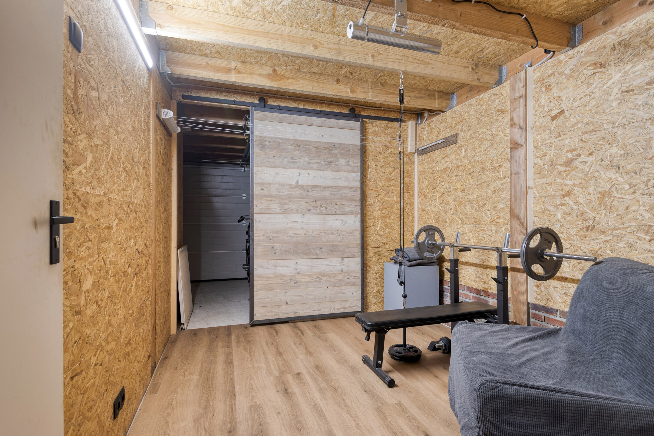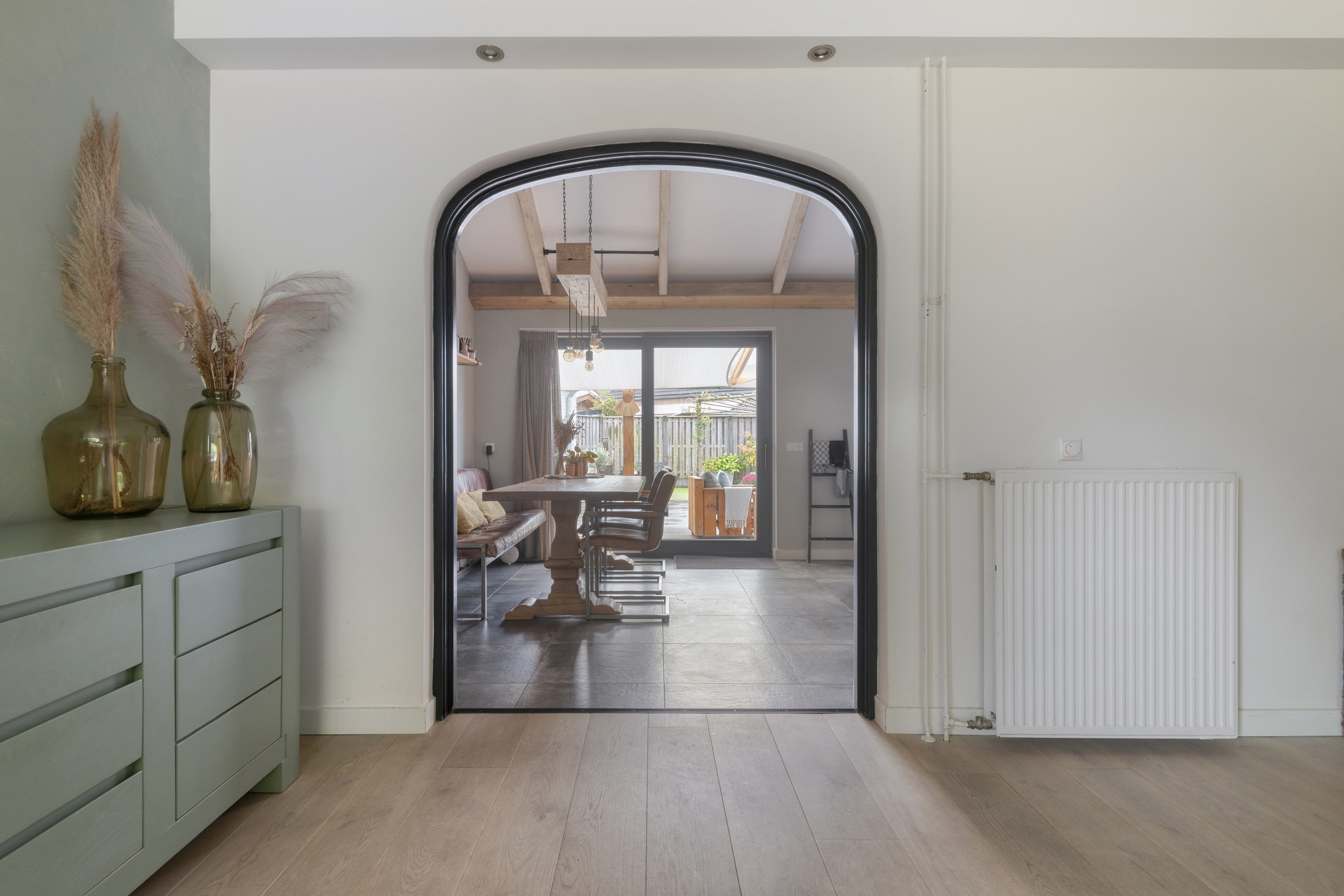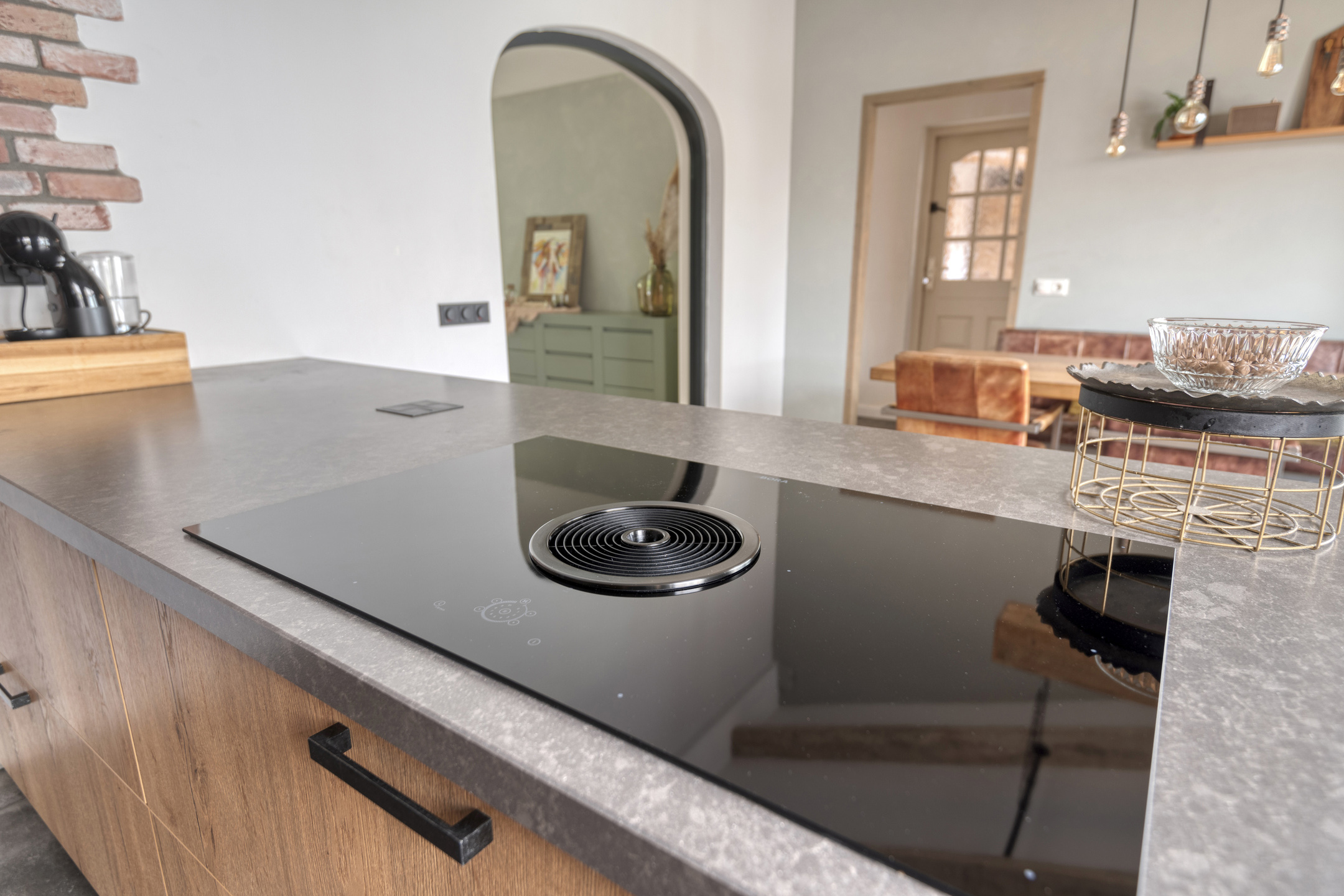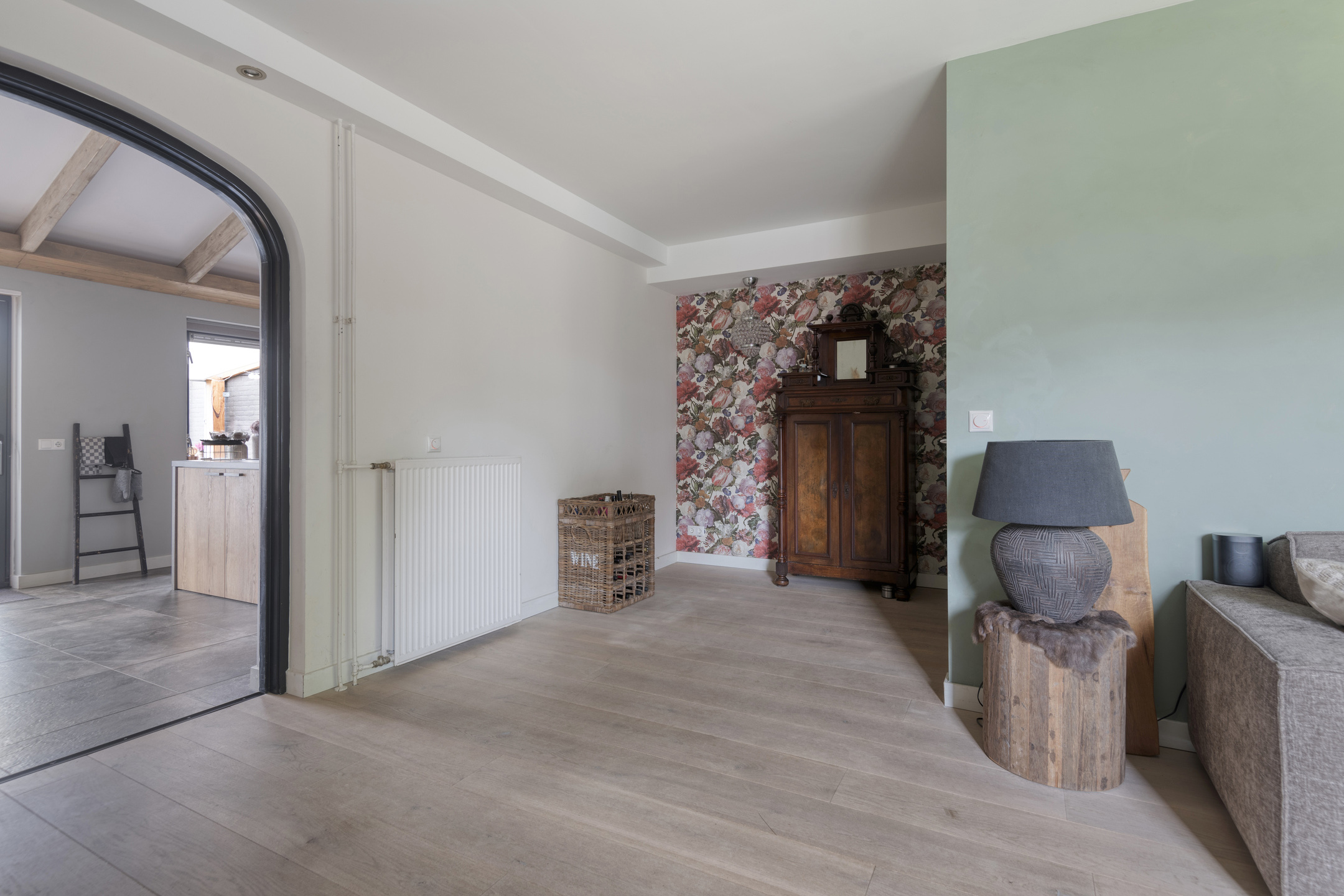 Het hart van het huis bevindt zich aan de achterzijde: een uitgebouwde, sfeervolle woonkeuken die met zijn houten balken, bakstenen wand en robuuste keukenopstelling een warme uitstraling heeft. Hier is ruimte om te koken, tafelen én lang na te praten. De keuken is voorzien van een royaal kookeiland, ingebouwde apparatuur en veel werk- en bergruimte. De schuifpui verbindt de keuken met het overdekte terras in de achtertuin.