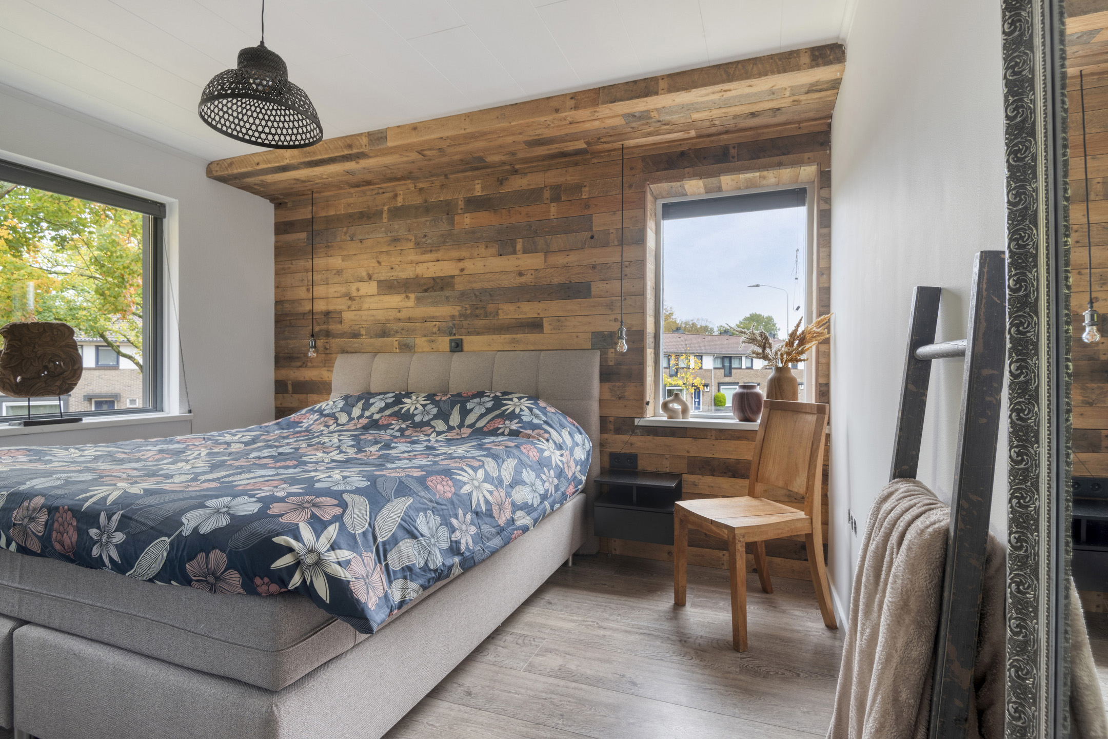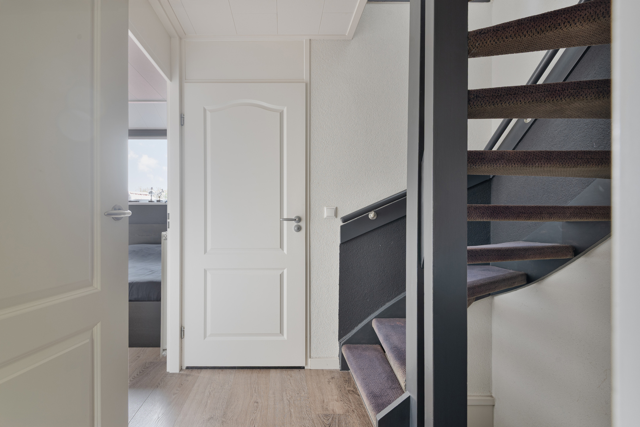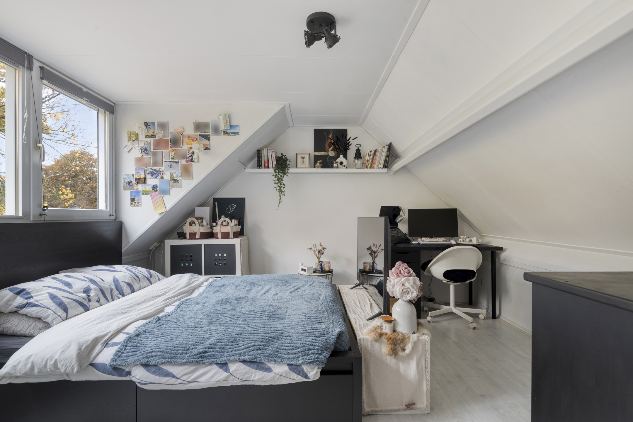 De vaste trap brengt je naar de tweede verdieping, waar een ruime vierde slaapkamer is gerealiseerd. Dankzij het brede dakkapel is deze ruimte verrassend licht en goed bruikbaar als slaapkamer, werk- of hobbyruimte. Op de overloop is de cv-installatie geplaatst en er is volop bergruimte aanwezig achter de knieschotten.