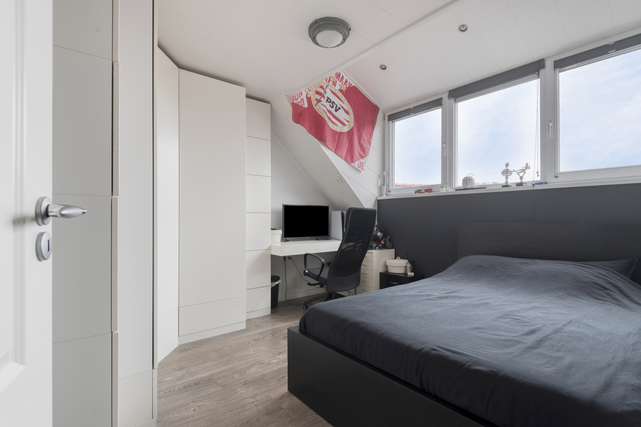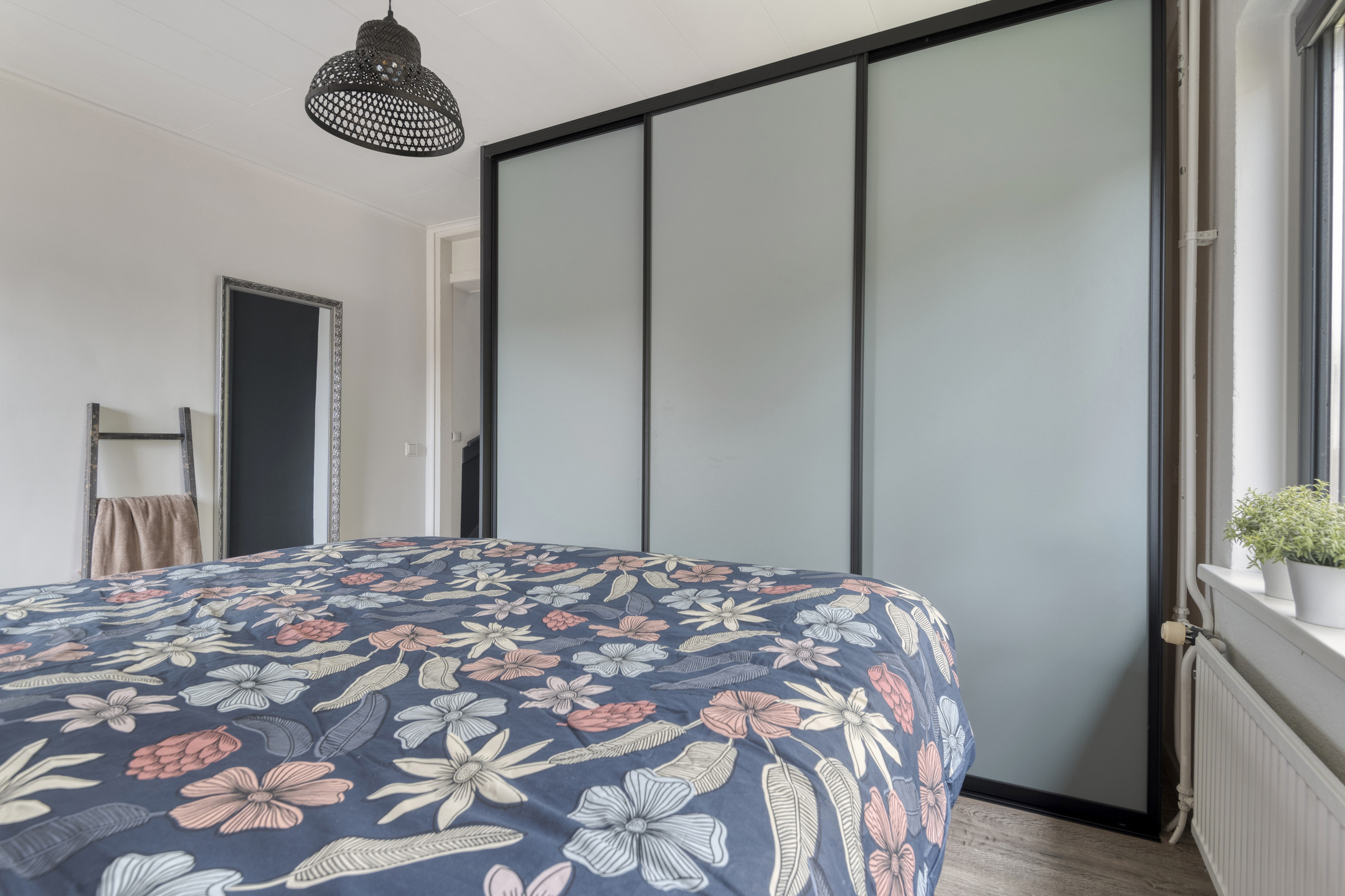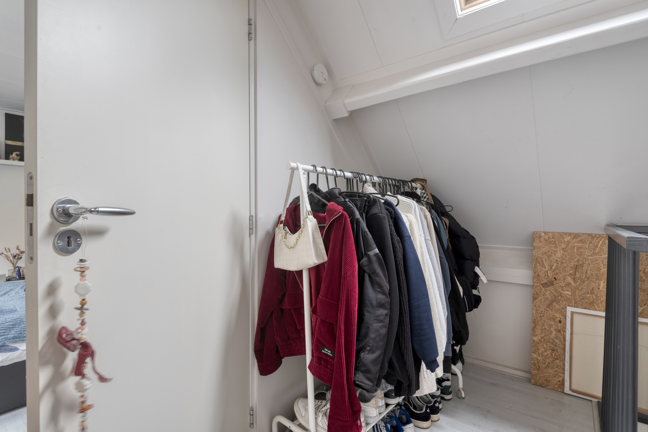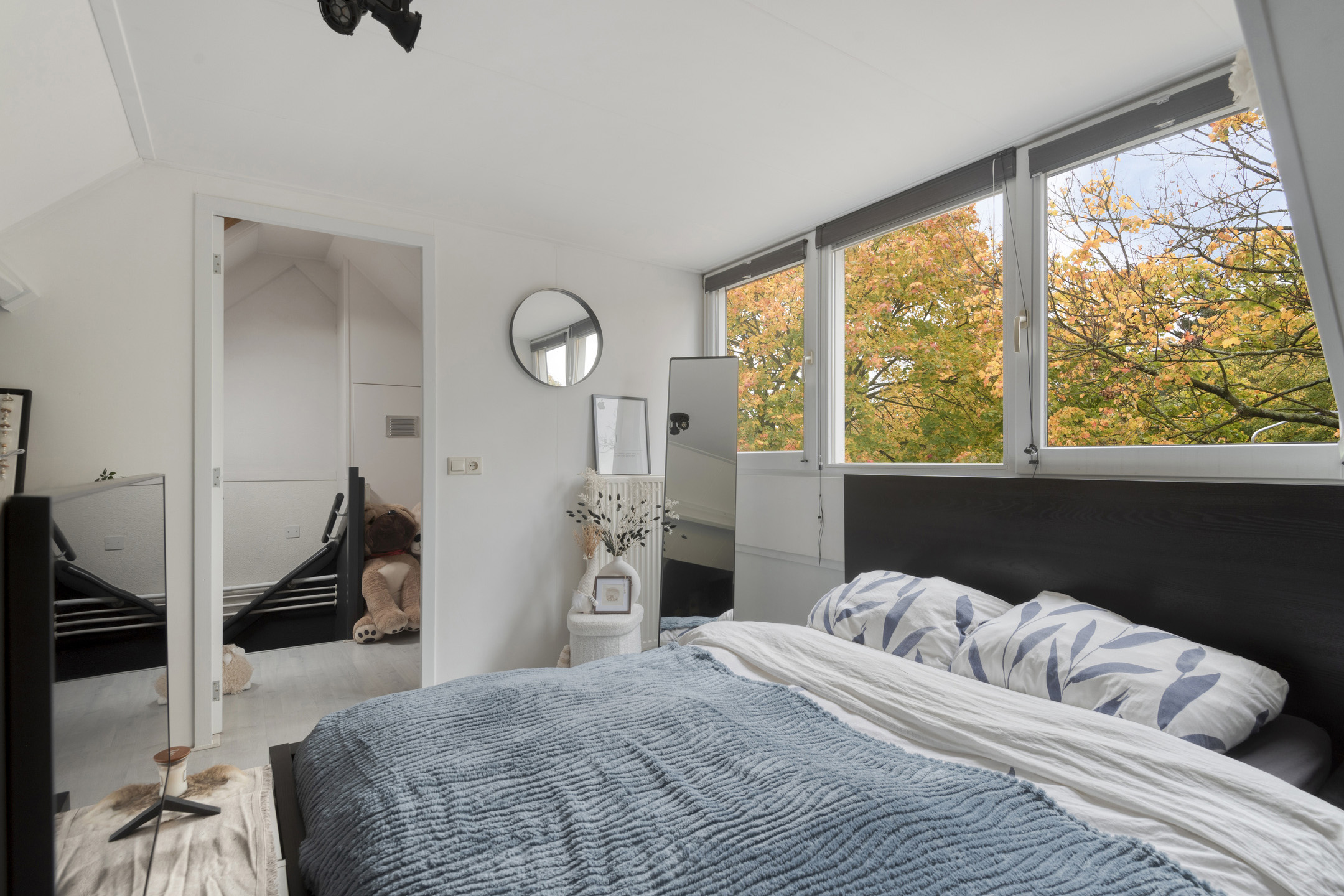 De vaste trap brengt je naar de tweede verdieping, waar een ruime vierde slaapkamer is gerealiseerd. Dankzij het brede dakkapel is deze ruimte verrassend licht en goed bruikbaar als slaapkamer, werk- of hobbyruimte. Op de overloop is de cv-installatie geplaatst en er is volop bergruimte aanwezig achter de knieschotten.