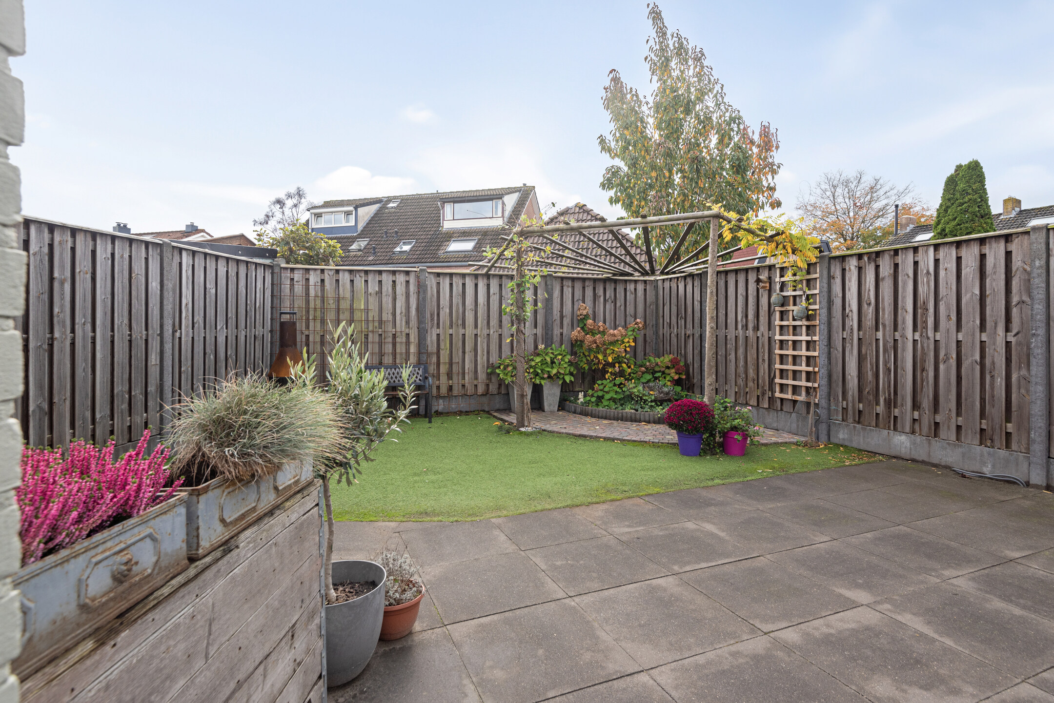 De tuin is een echt pluspunt van deze woning. Zowel de voor- als achtertuin zijn royaal, maar vooral de achtertuin valt op door zijn grootte en indeling. Direct achter de woning is een groot terras met een fraaie, houten veranda waar je tot laat op de avond buiten zit. Verder is er ruimte genoeg voor speeltoestellen, een gazon of bloeiende borders. De tuin is grotendeels onderhoudsvriendelijk ingericht, met speelse elementen en voldoende privacy.