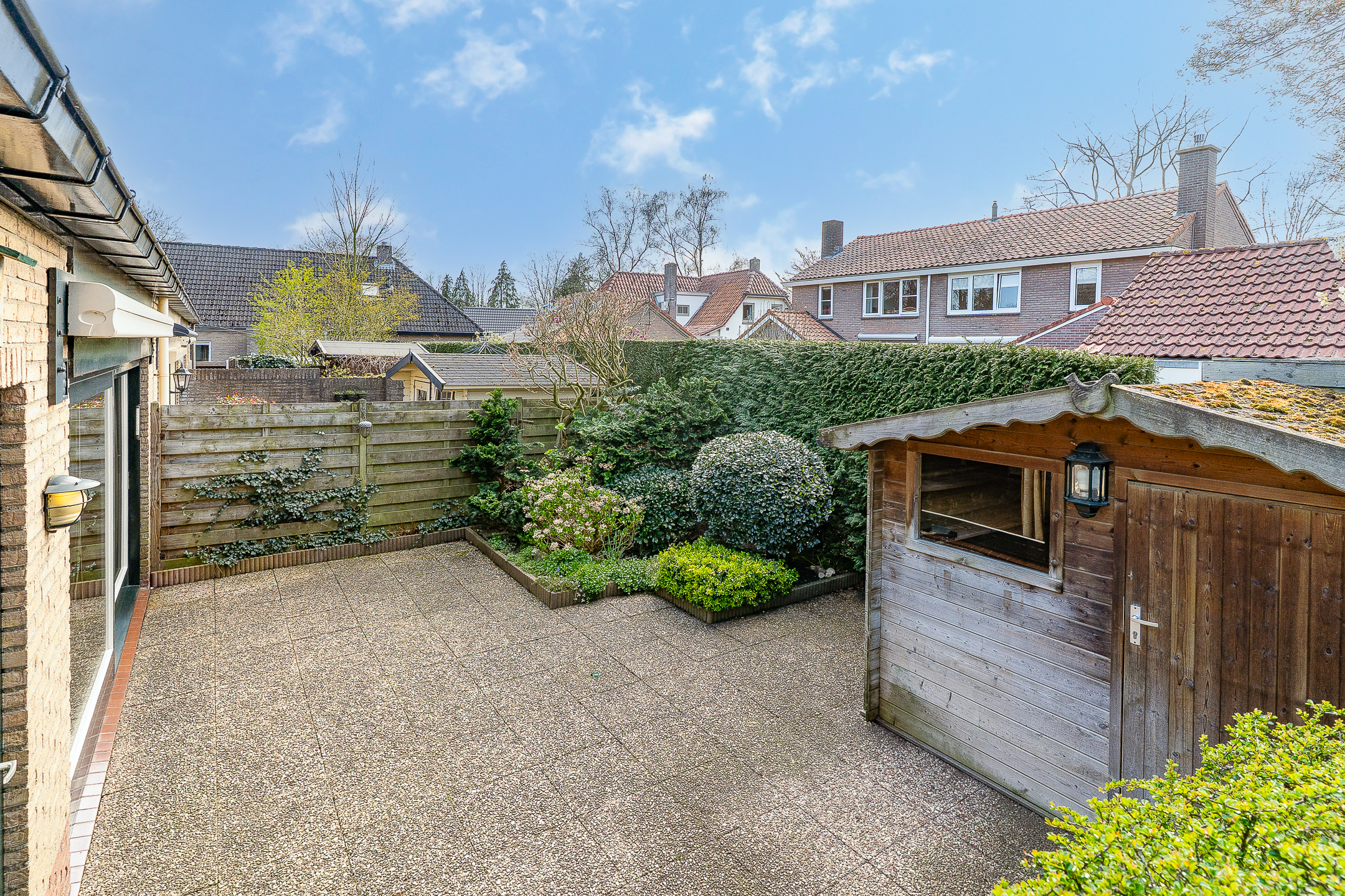 De achtertuin is onderhoudsvriendelijk aangelegd en biedt een fijne plek om buiten te zitten. Dankzij de hoekligging ervaar je net wat extra ruimte rondom de woning. Achterin de tuin staat een praktische berging voor fietsen en tuingereedschap. De achtertuin is gunstig gelegen op het zuidwesten, waardoor je hier vanaf de middag tot in de avond heerlijk van de zon kunt genieten.