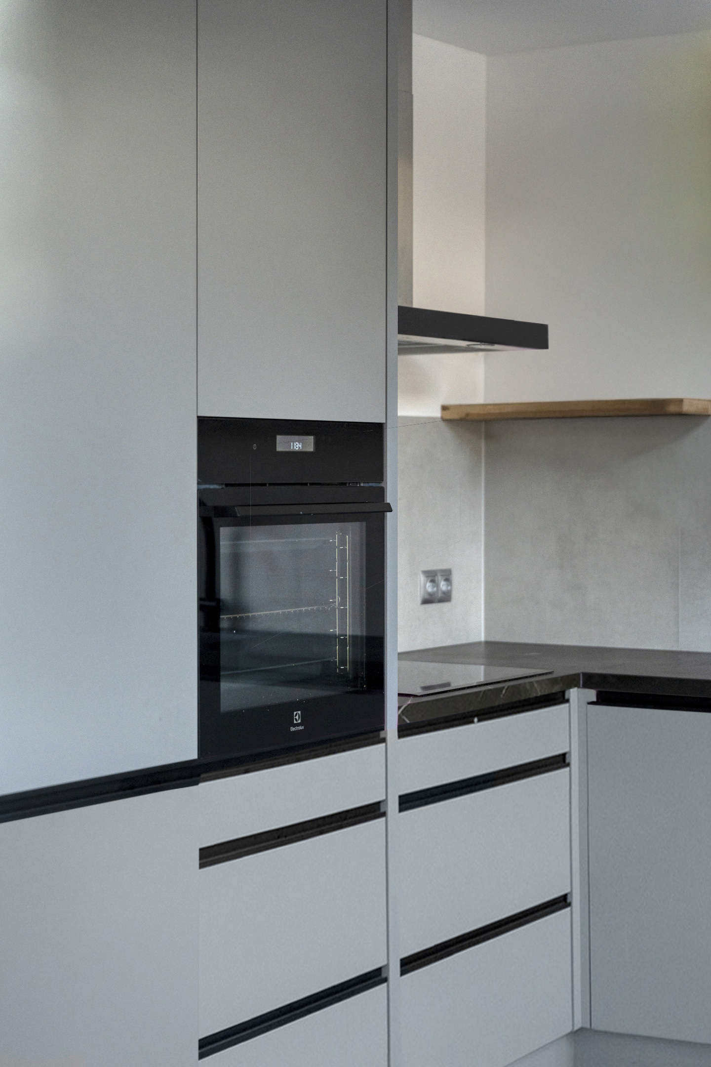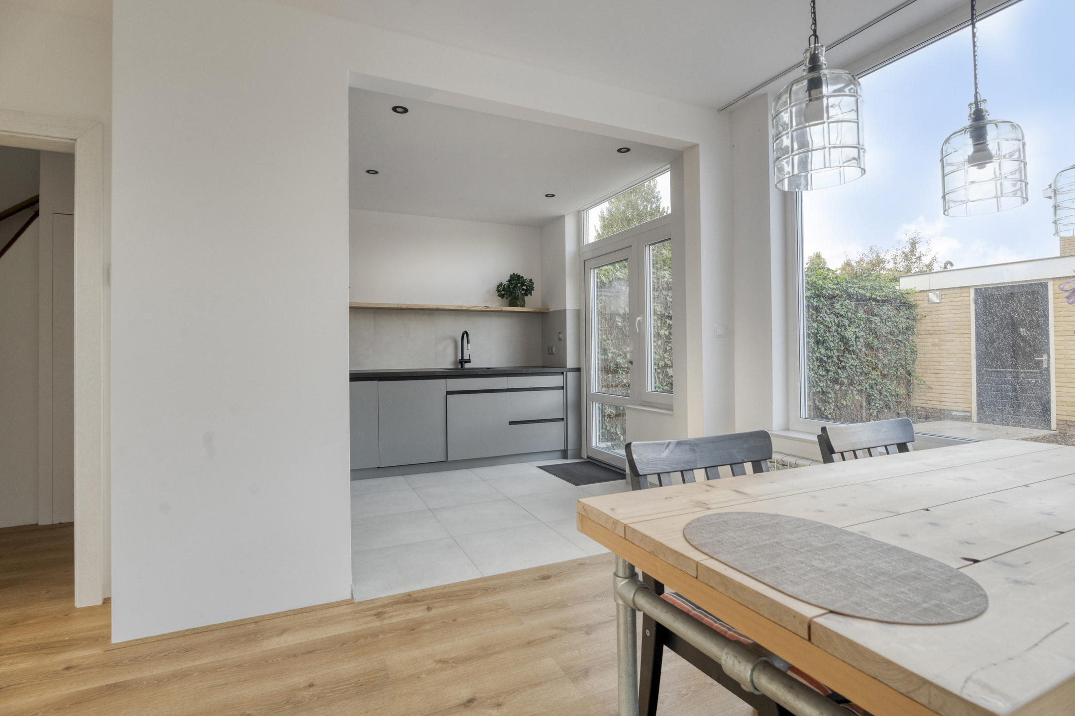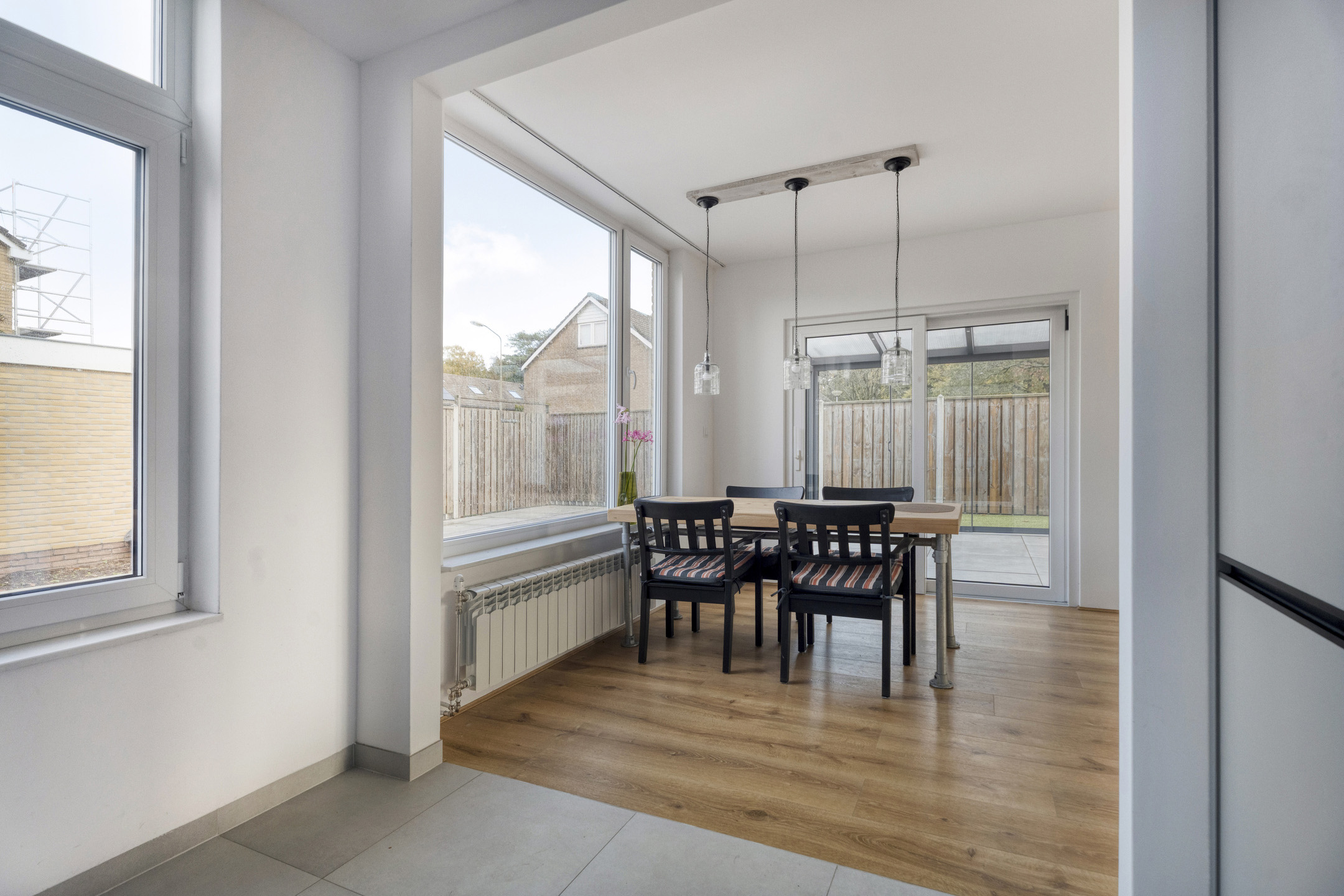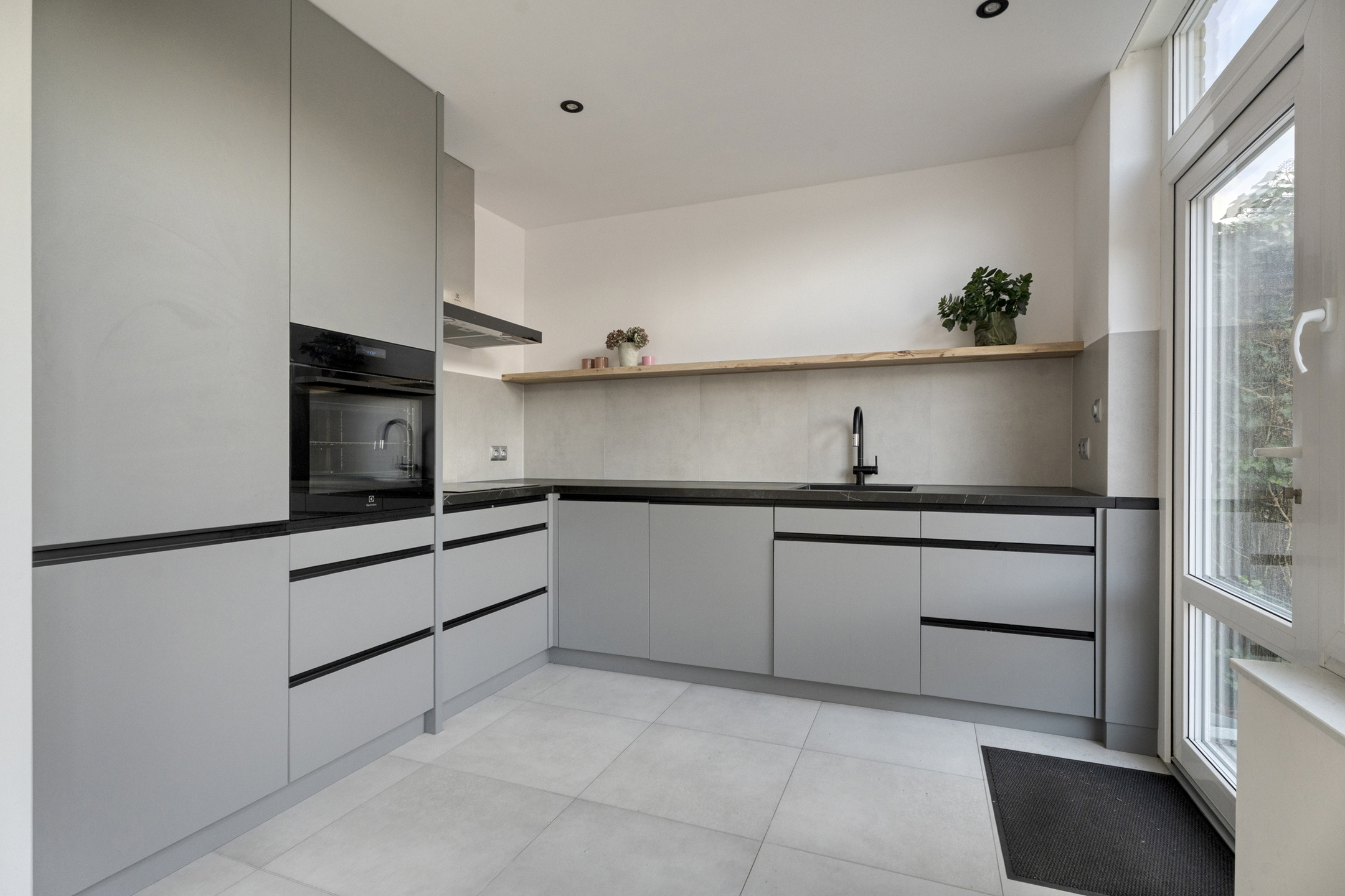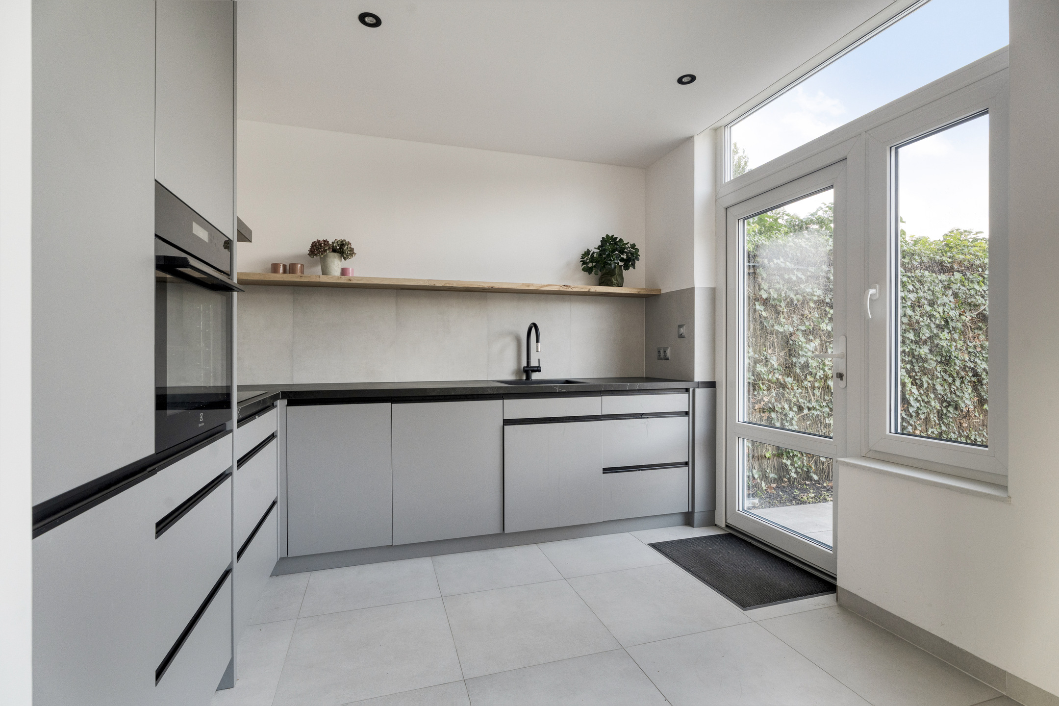 Aan de achterzijde is in 2022 een moderne keuken geplaatst in een strakke U-opstelling. De grijze kasten en het zwarte werkblad zorgen voor een stijlvolle uitstraling en je hebt hier de beschikking over alle gewenste inbouwapparatuur. Vanuit de keuken loop je direct de achtertuin in met aan de zijkant een fantastische serre. Ideaal als verlengstuk van je woonkamer of als plek om lang na te tafelen in het voor- en najaar.