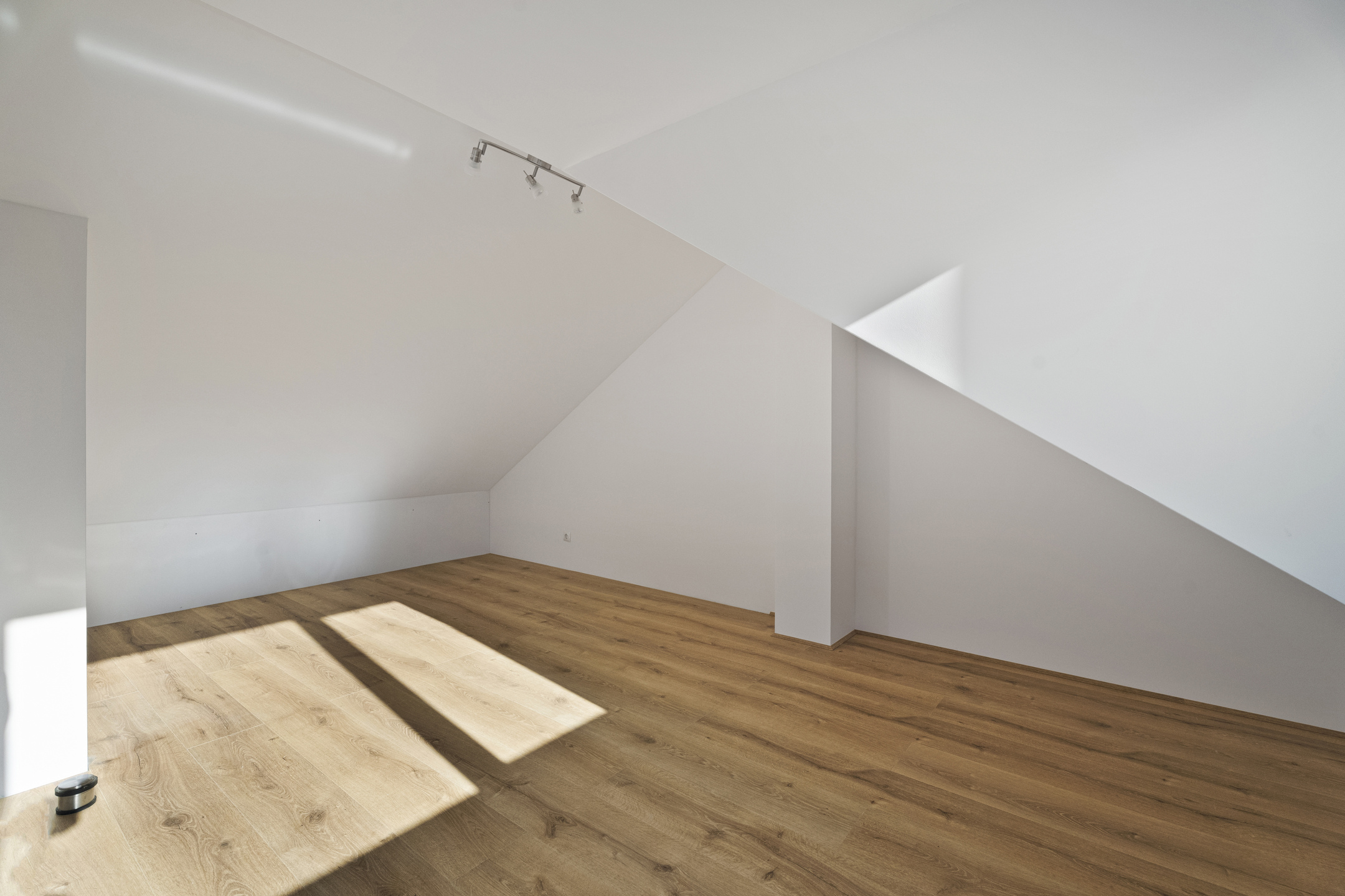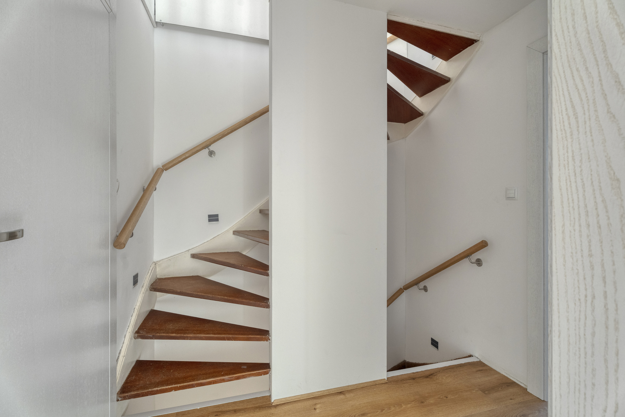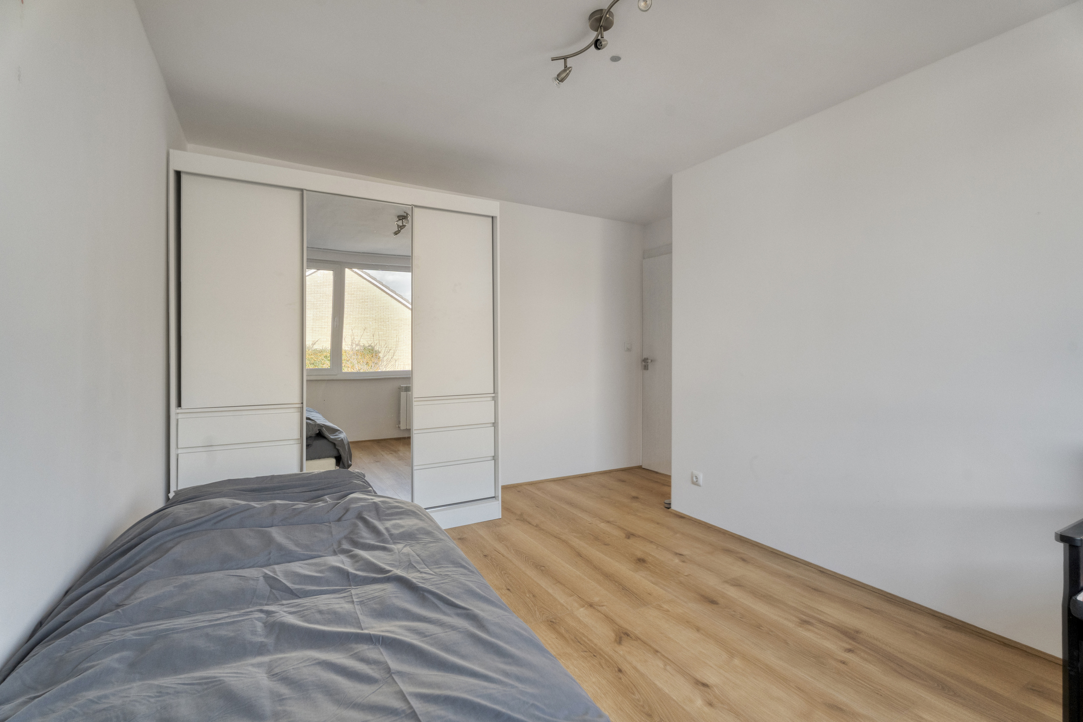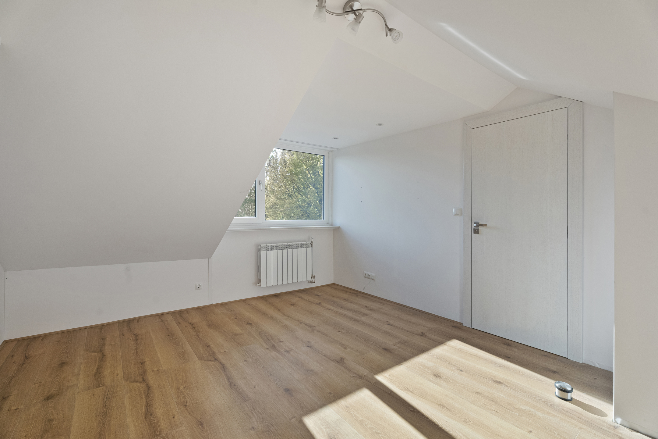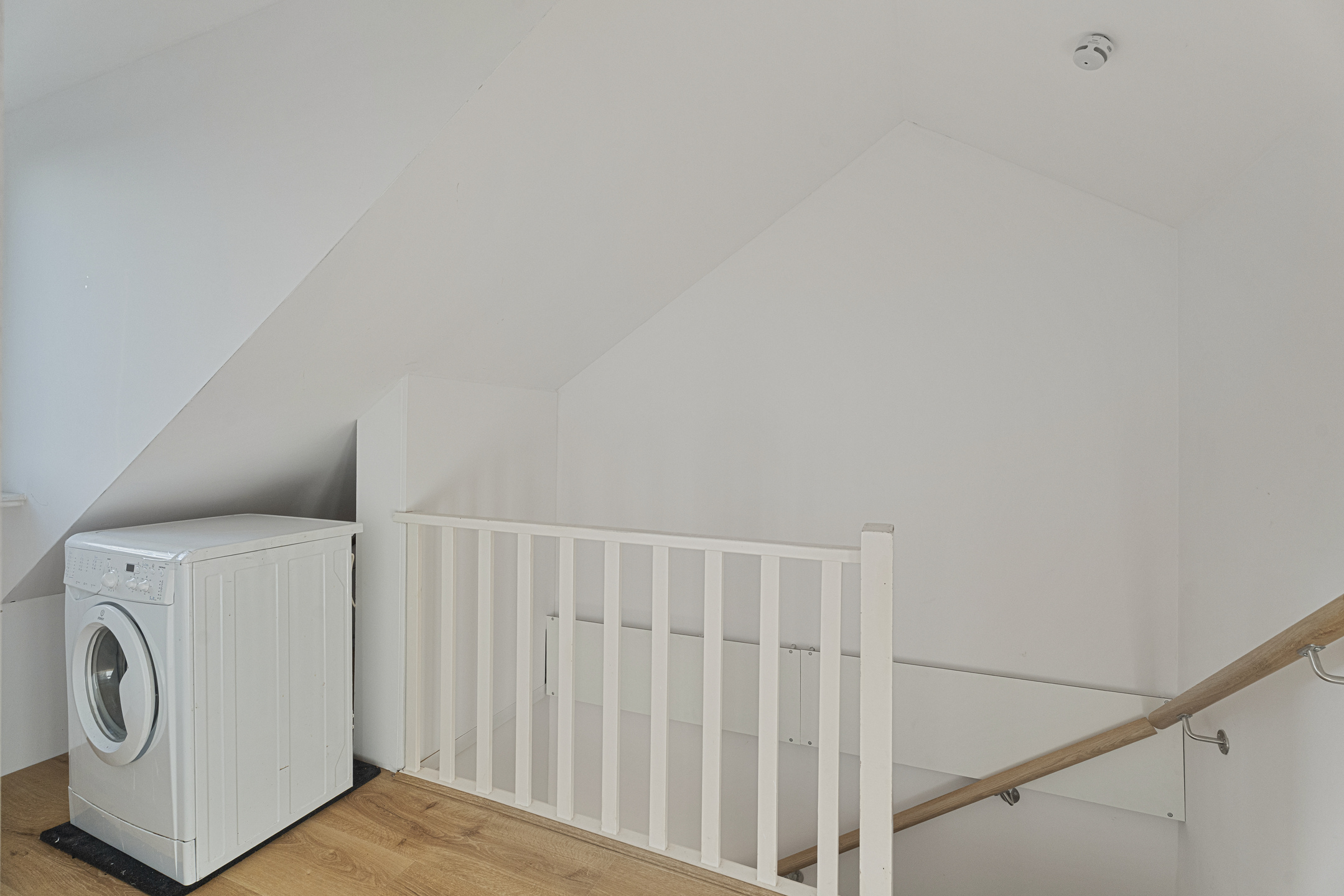 De vaste trap brengt je naar de tweede verdieping, waar een vierde slaapkamer is gerealiseerd. Dankzij de dakkapel is dit een volwaardige kamer geworden, perfect slaapkamer of werkkamer. Op de overloop is bovendien veel bergruimte beschikbaar en vind je ook de aansluiting voor het witgoedapparatuur.