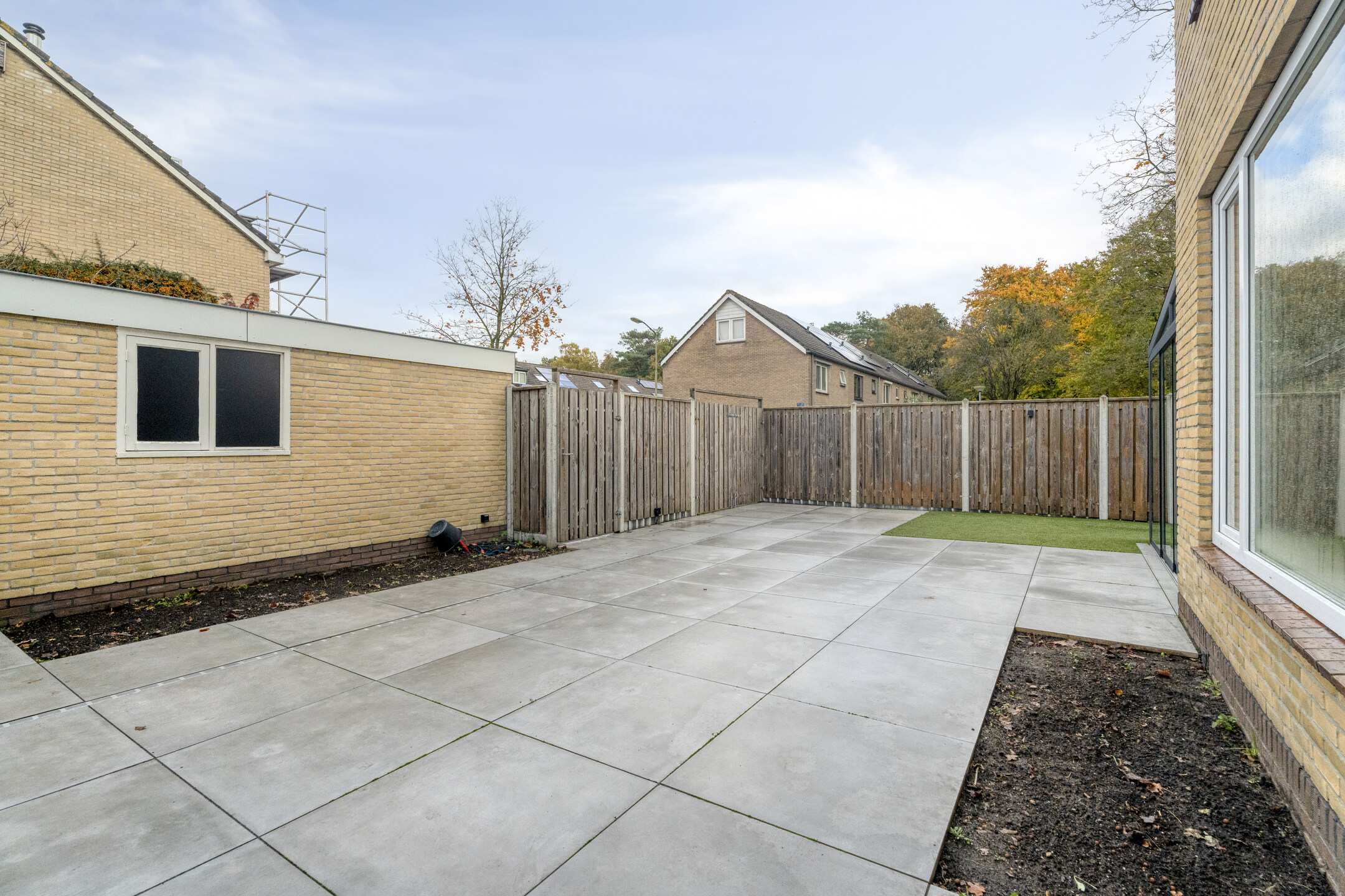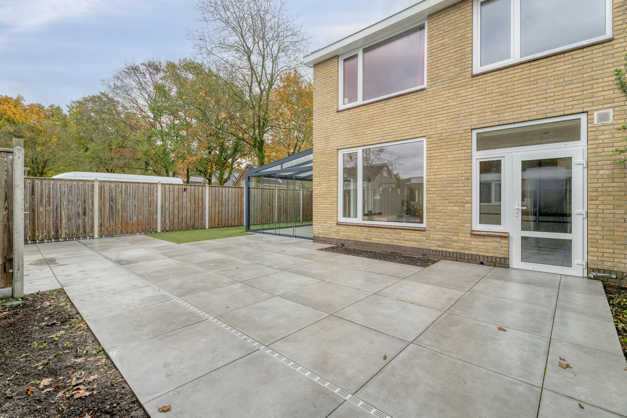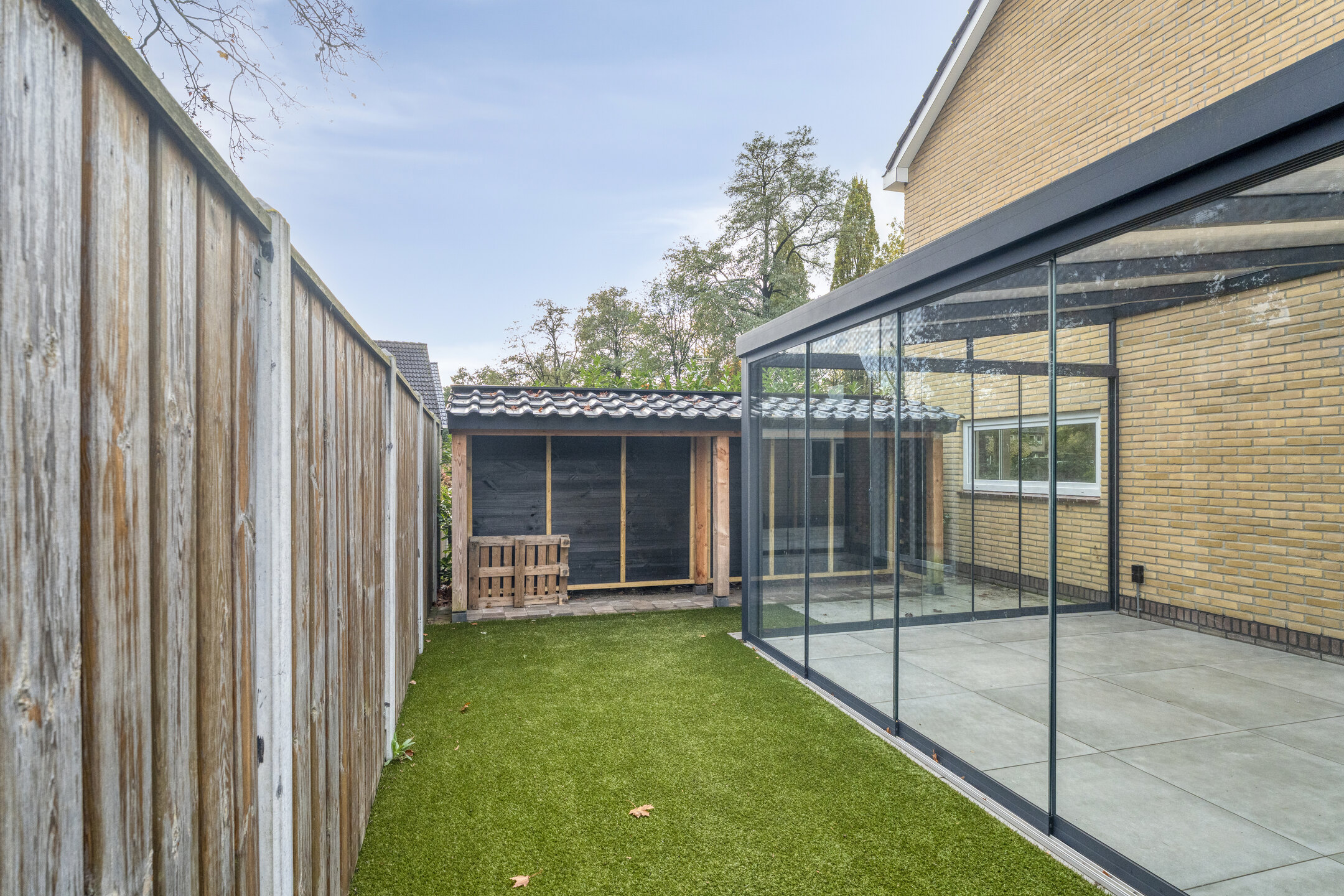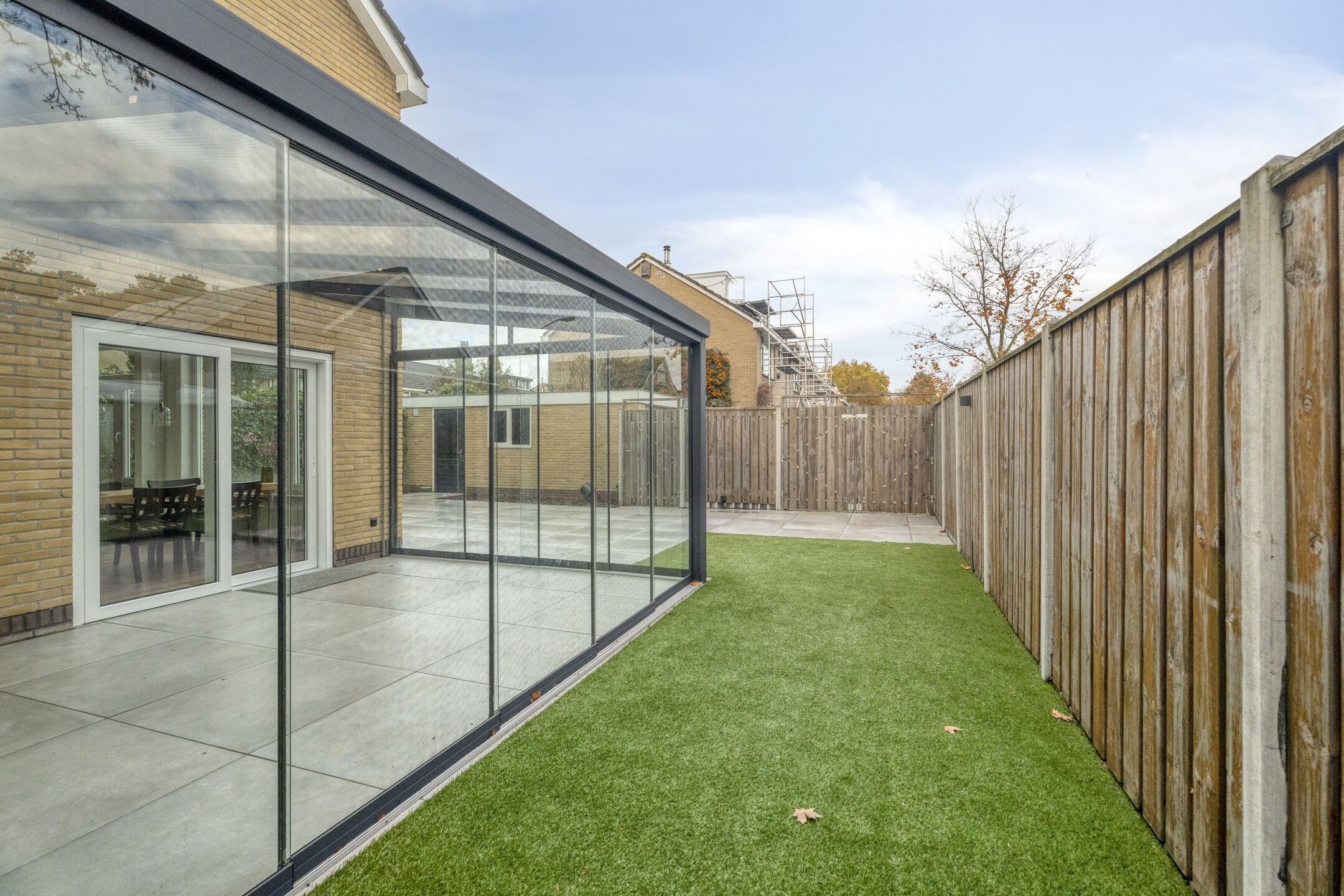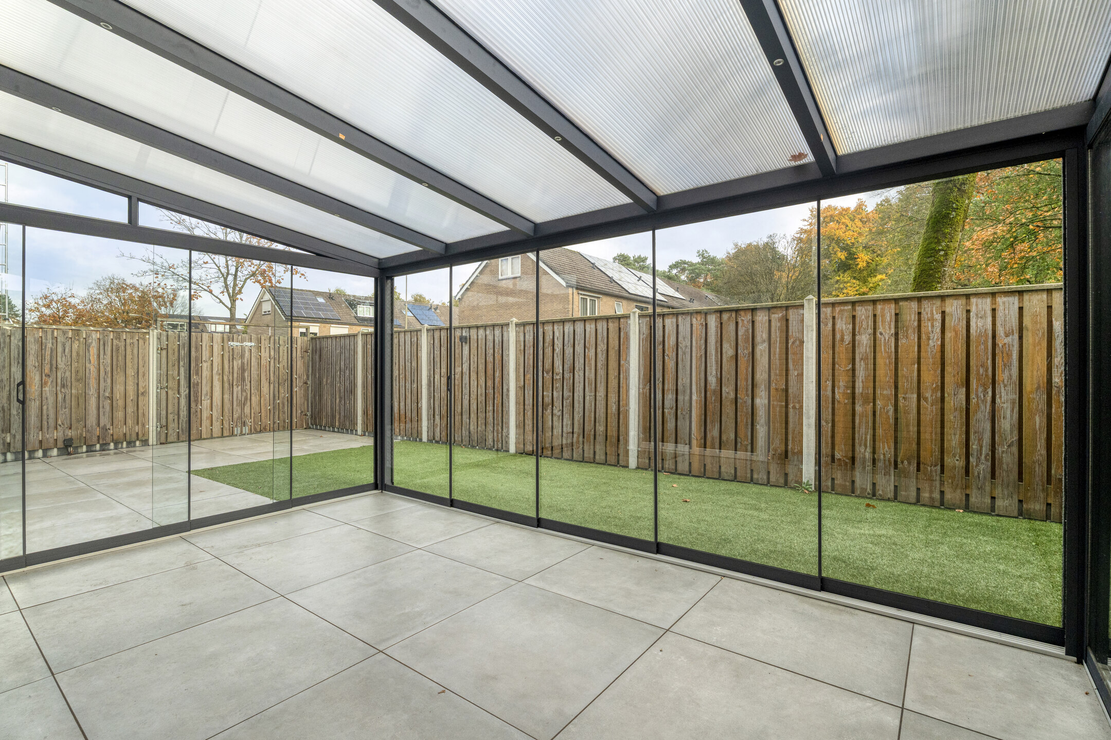 De achtertuin is volledig opnieuw aangelegd met fraaie keramische tegels en voorzien van een nette schutting. Aan de zijkant van het huis ligt een groenstrook met een slimme bewateringsoplossing via druppelslangen, gevoed door een ondergrondse kunststof regenwatertank met een elektrisch pompsysteem. Ideaal voor wie een onderhoudsarme tuin wil met een verzorgd uiterlijk. De serre grenst direct aan het terras, waardoor je makkelijk binnen en buiten met elkaar verbindt.