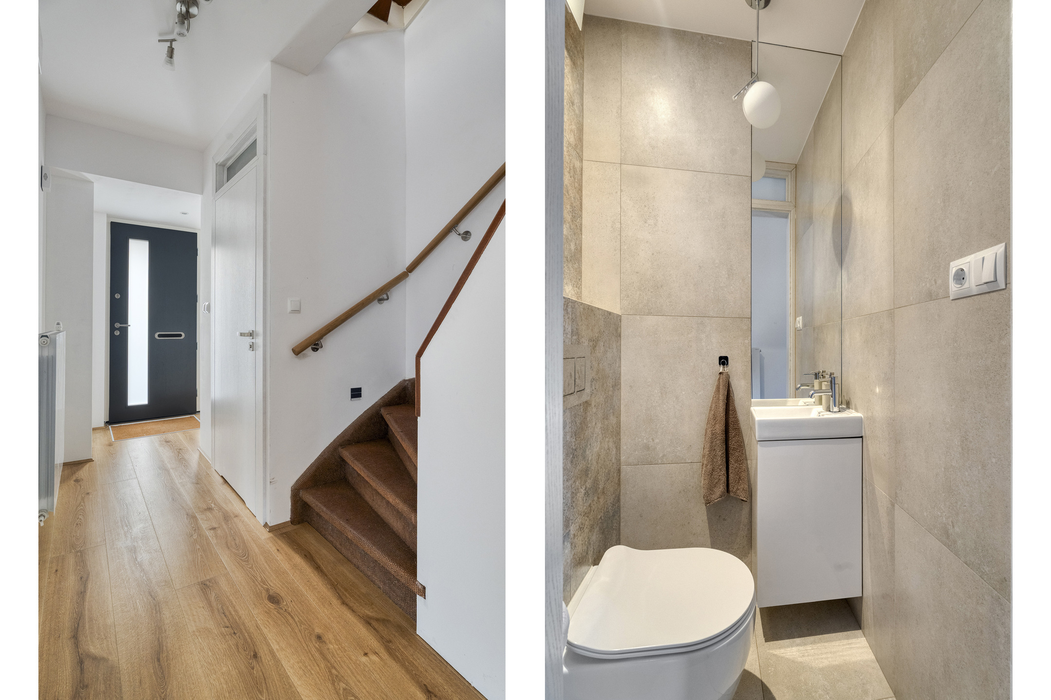 Via de voortuin kom je bij de overdekte entree. Je stapt binnen in de hal, waar zich het toilet, de meterkast en de trapopgang bevinden. Vervolgens kom je in de lichte doorzonwoonkamer met grote raampartijen aan twee zijden en aan de zijkant een schuifpui. De vloer is strak afgewerkt met een warme houtlook vloer en dankzij de ligging aan de kopzijde kijk je prettig vrij de straat in.