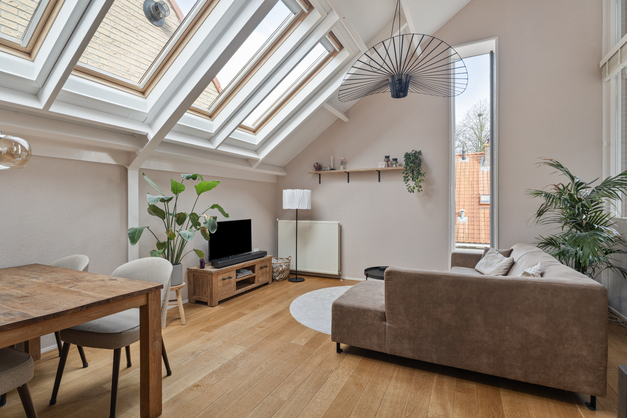 De woonkamer is een bijzonder aangename ruimte dankzij de hoge kap met zichtbare dakconstructie en meerdere dakramen. Dit zorgt voor een prettige lichtinval en een ruimtelijk karakter. Er is voldoende plaats voor zowel een zit- als een eethoek.