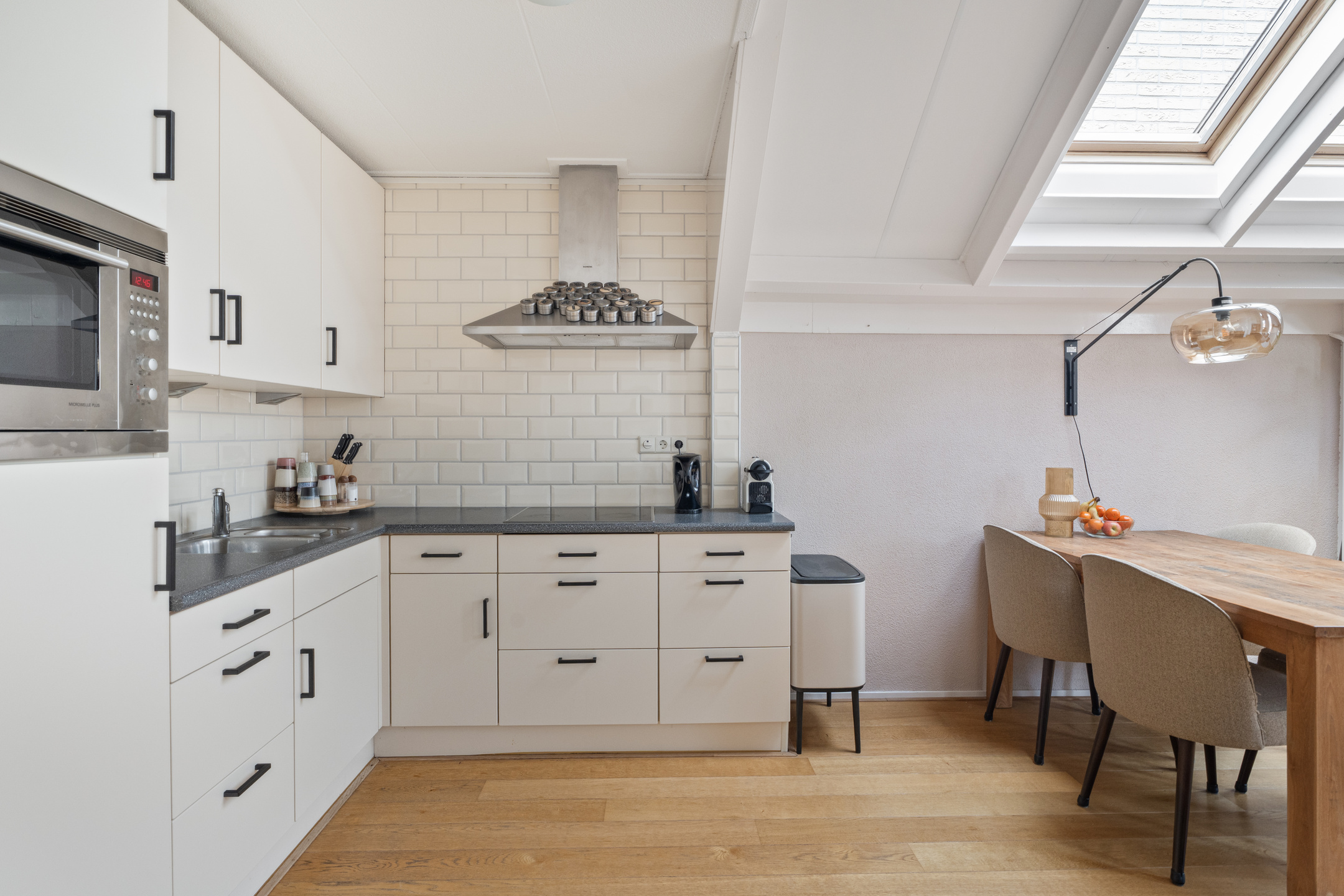 De open keuken is opgesteld in een praktische hoekopstelling en voorzien van diverse inbouwapparatuur en voldoende kastruimte.