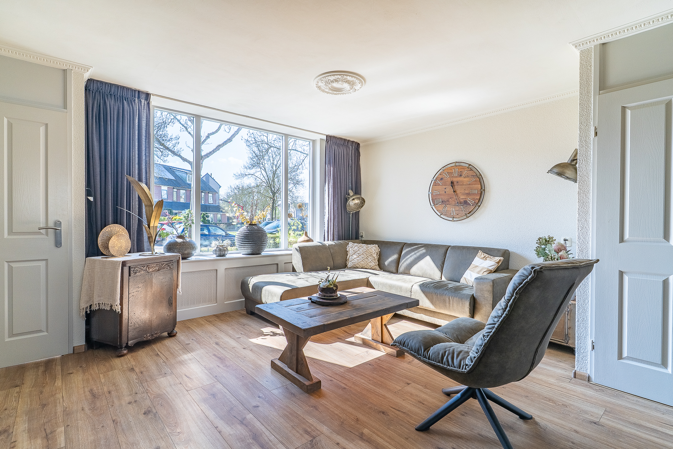 Via de voortuin kom je bij de entree aan de voorzijde van de woning. Hier stap je direct de woonkamer binnen. De kamer is heerlijk licht dankzij de grote raampartijen aan zowel de voor- als achterzijde. Aan de voorzijde is ruimte voor een gezellig zitgedeelte met uitzicht op de straat, terwijl aan de achterzijde plek is voor een eettafel.