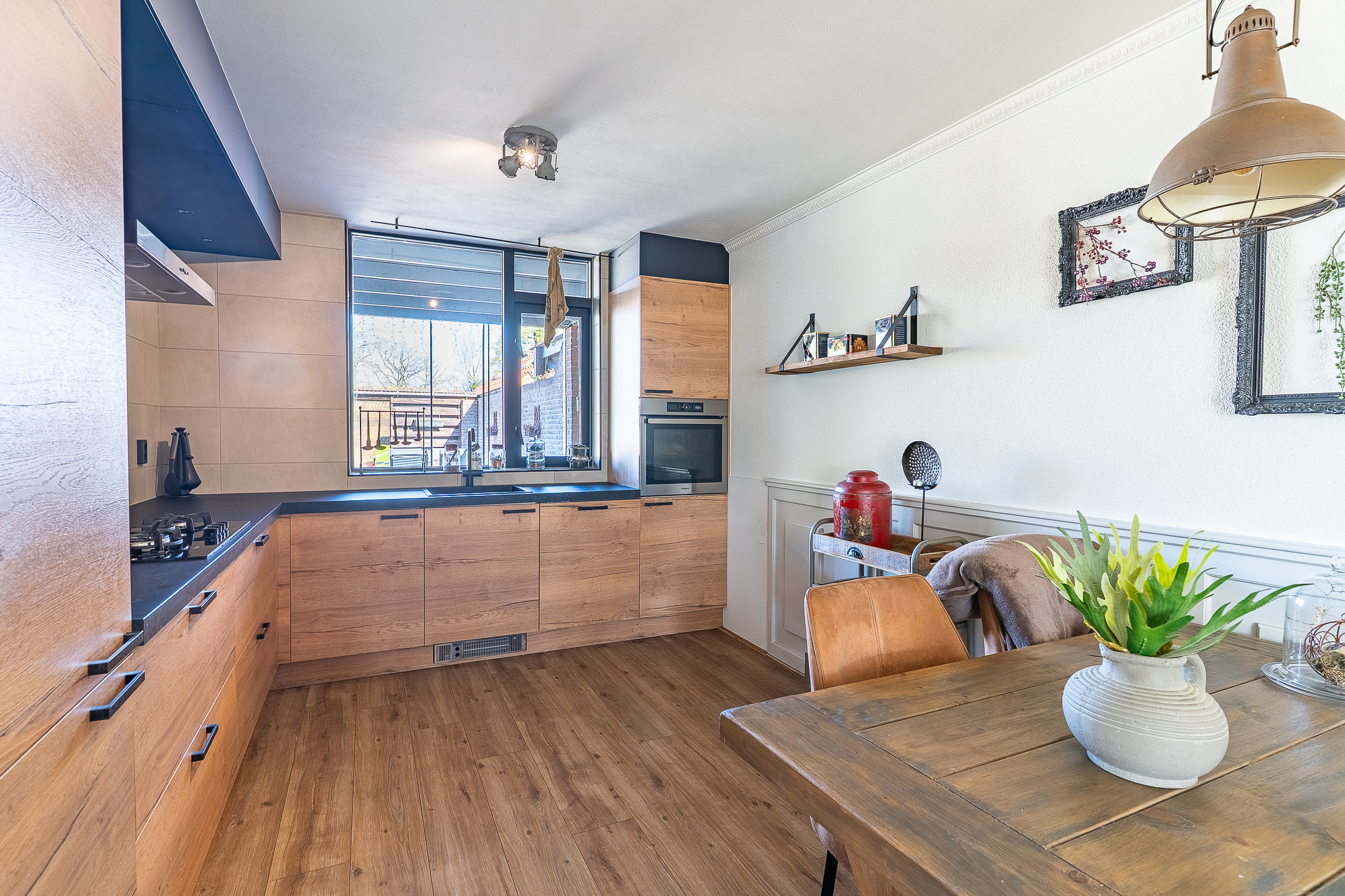 De keuken is in 2021 vernieuwd en heeft een moderne, warme uitstraling met veel kastruimte en diverse inbouwapparatuur.