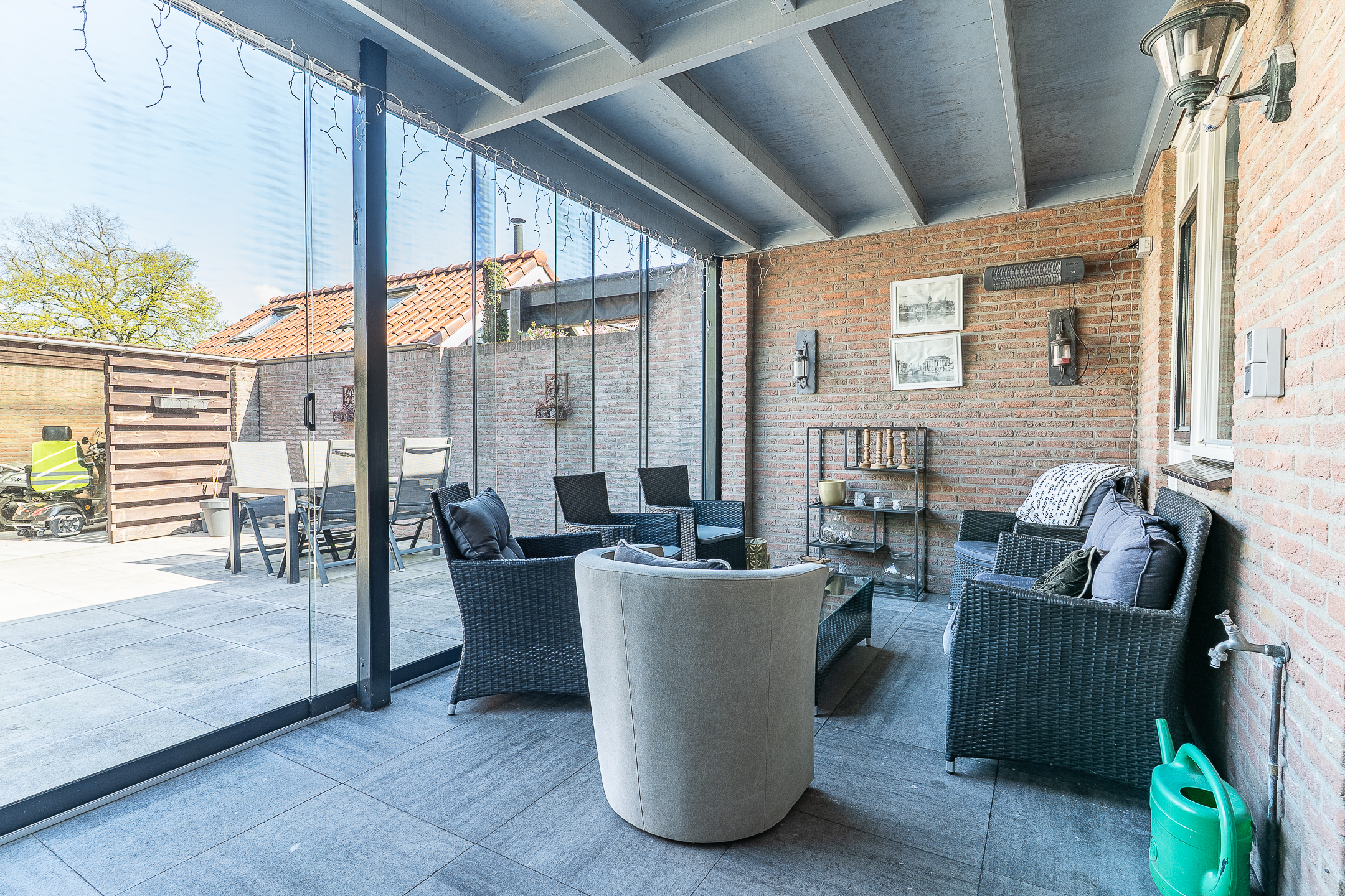 De achtertuin is onderhoudsvriendelijk aangelegd en biedt meerdere fijne plekken om buiten te zitten. Direct achter de woning bevindt zich de serre/overkapping, waar je beschut kunt genieten van het buitenleven.