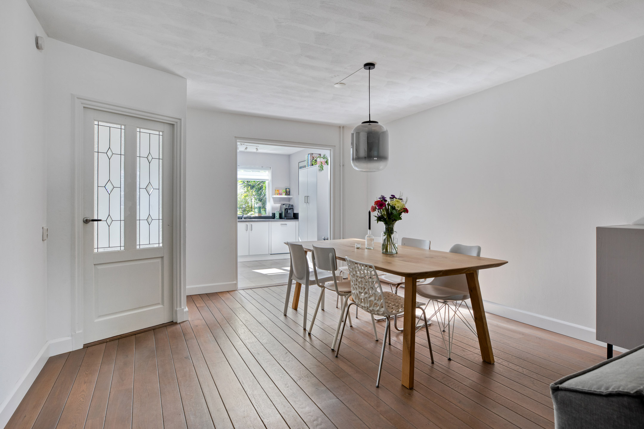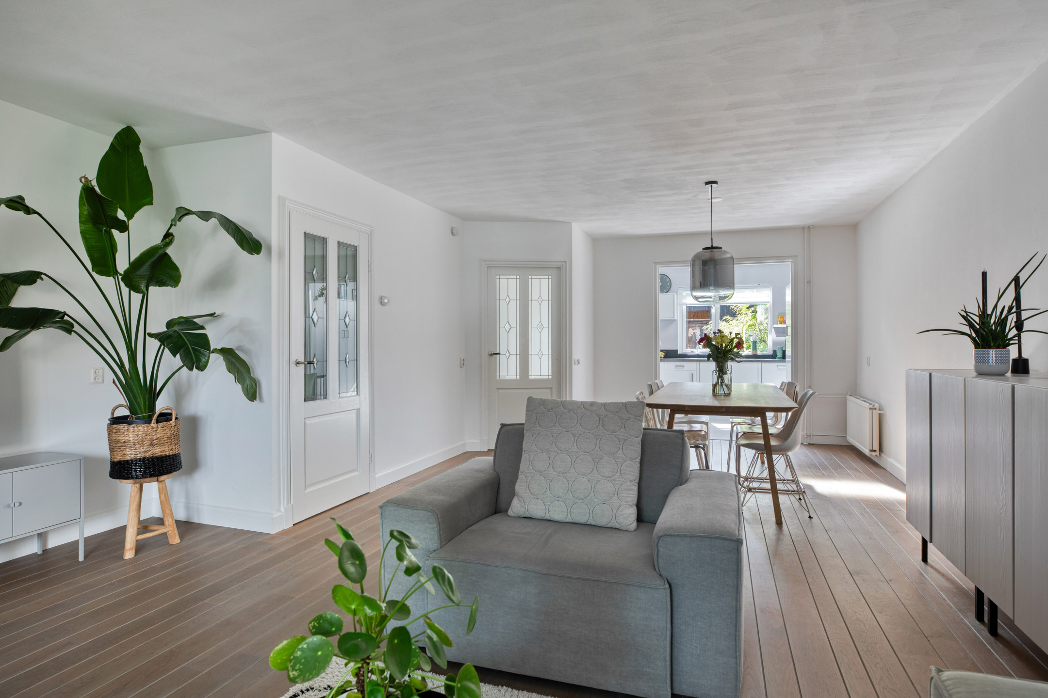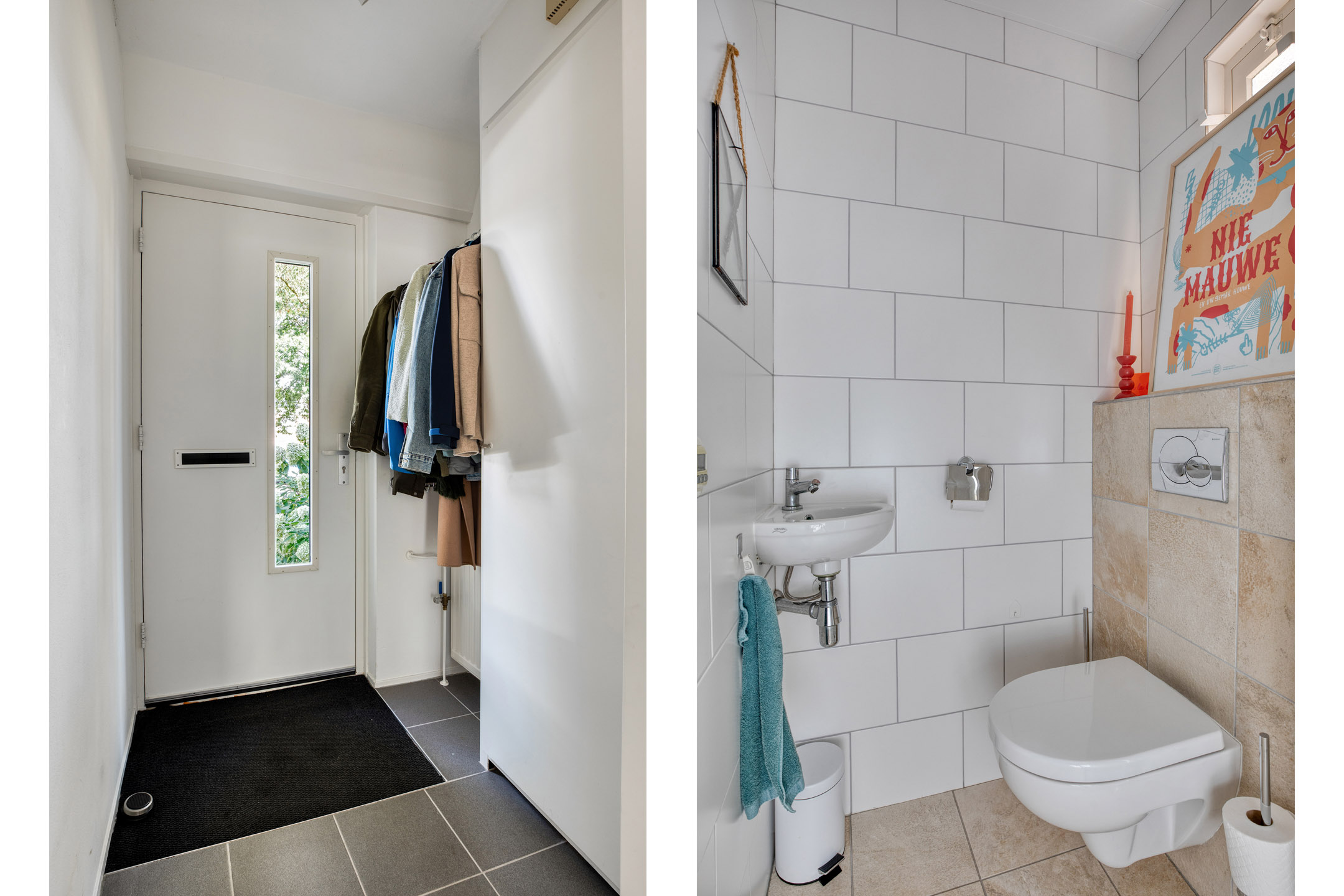 Via de verzorgde voortuin stap je binnen in de hal met meterkast. Vanuit hier kom je in de ruime woonkamer, die dankzij de uitbouw aan de voor- en achterzijde veel extra leefruimte biedt. De houten vloer en lichte wanden zorgen voor een rustige, warme sfeer en het grote raam aan de voorzijde geeft een mooi zicht op het groen in de straat. Daarnaast is er nog een ruime bergkast aanwezig.