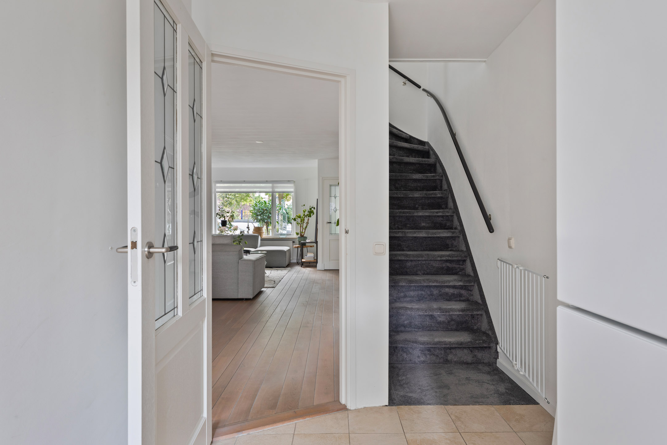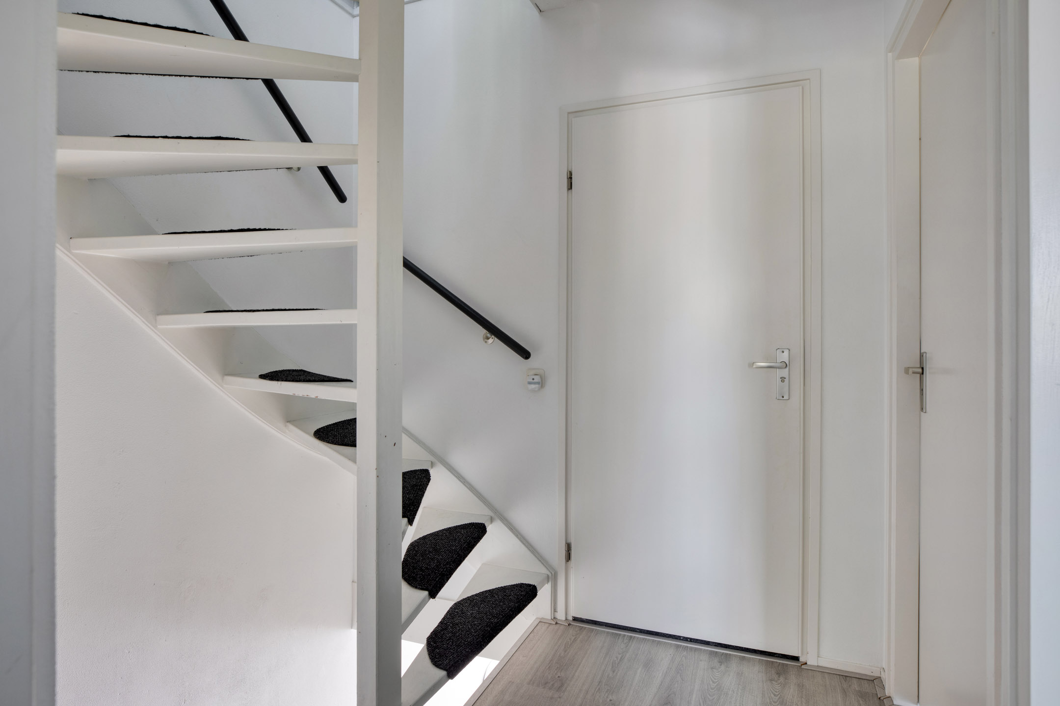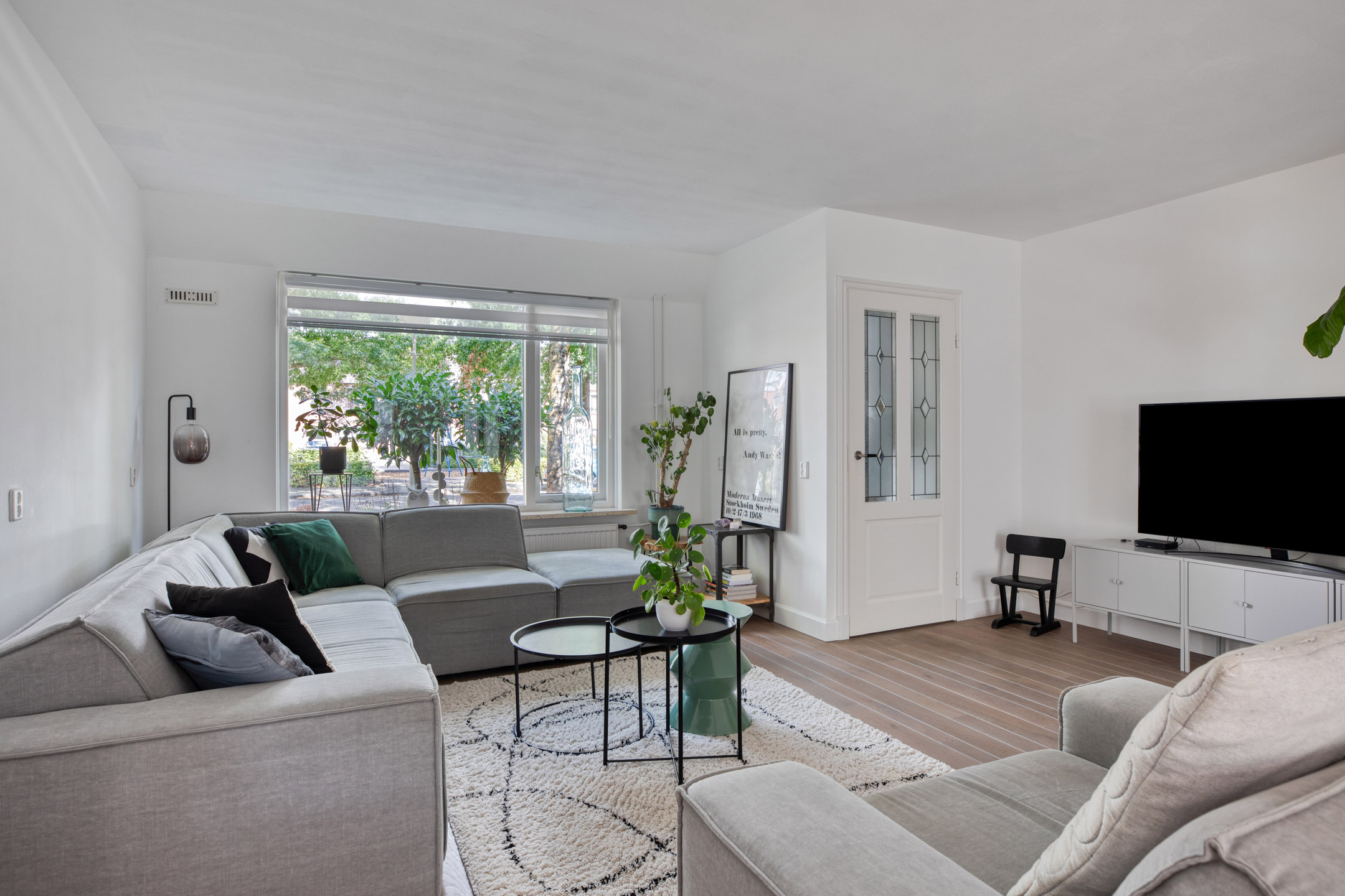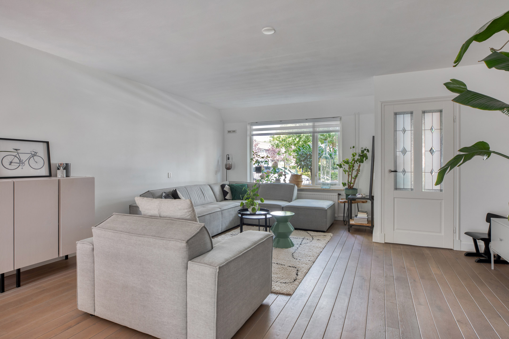 Via de verzorgde voortuin stap je binnen in de hal met meterkast. Vanuit hier kom je in de ruime woonkamer, die dankzij de uitbouw aan de voor- en achterzijde veel extra leefruimte biedt. De houten vloer en lichte wanden zorgen voor een rustige, warme sfeer en het grote raam aan de voorzijde geeft een mooi zicht op het groen in de straat. Daarnaast is er nog een ruime bergkast aanwezig.