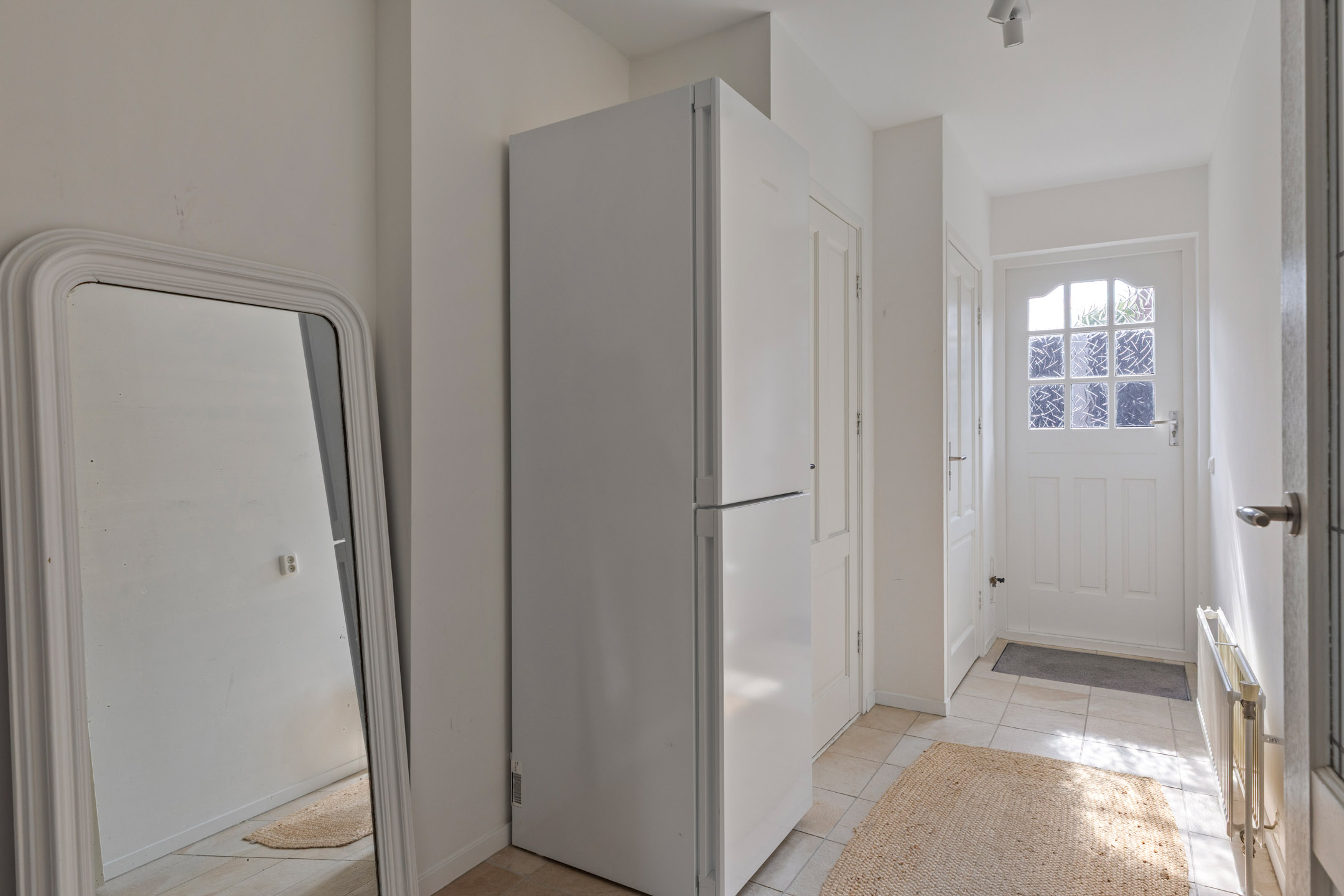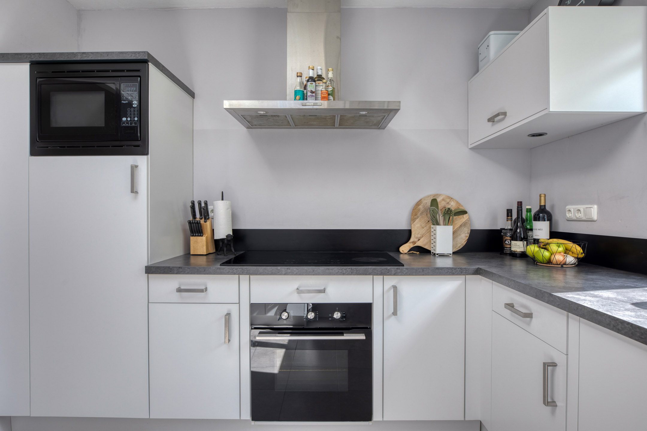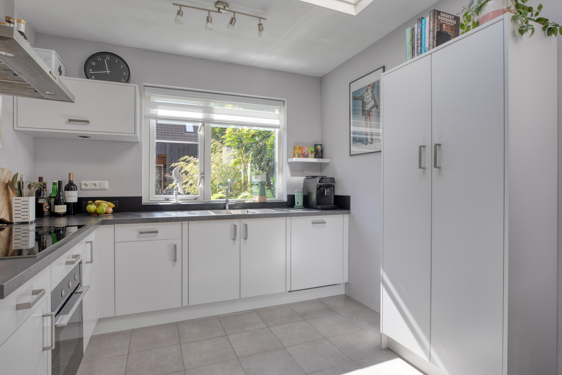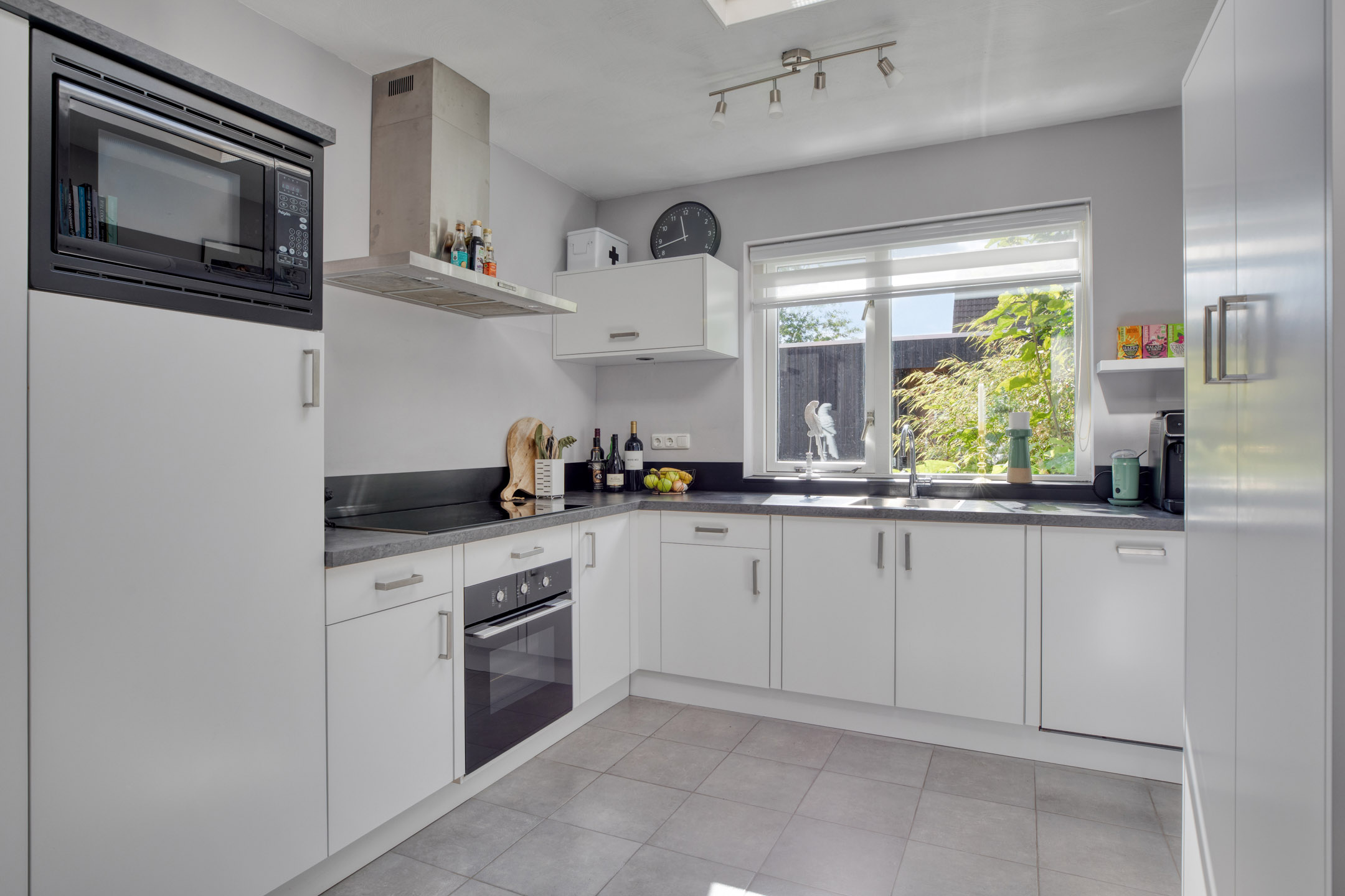 De open keuken ligt aan de achterzijde en is uitgevoerd in een praktische hoek-opstelling. Hier beschik je over veel werk- en bergruimte, een oven, magnetron, inductiekookplaat, koelkast, vaatwasser en een prettig uitzicht op de tuin. Vanuit de woonkamer is er toegang tot de hal aan de achterzijde waar ook het toilet, een bergkast en de trapopgang naar de verdieping zijn gesitueerd. Hiervandaan is er toegang tot de achtertuin.