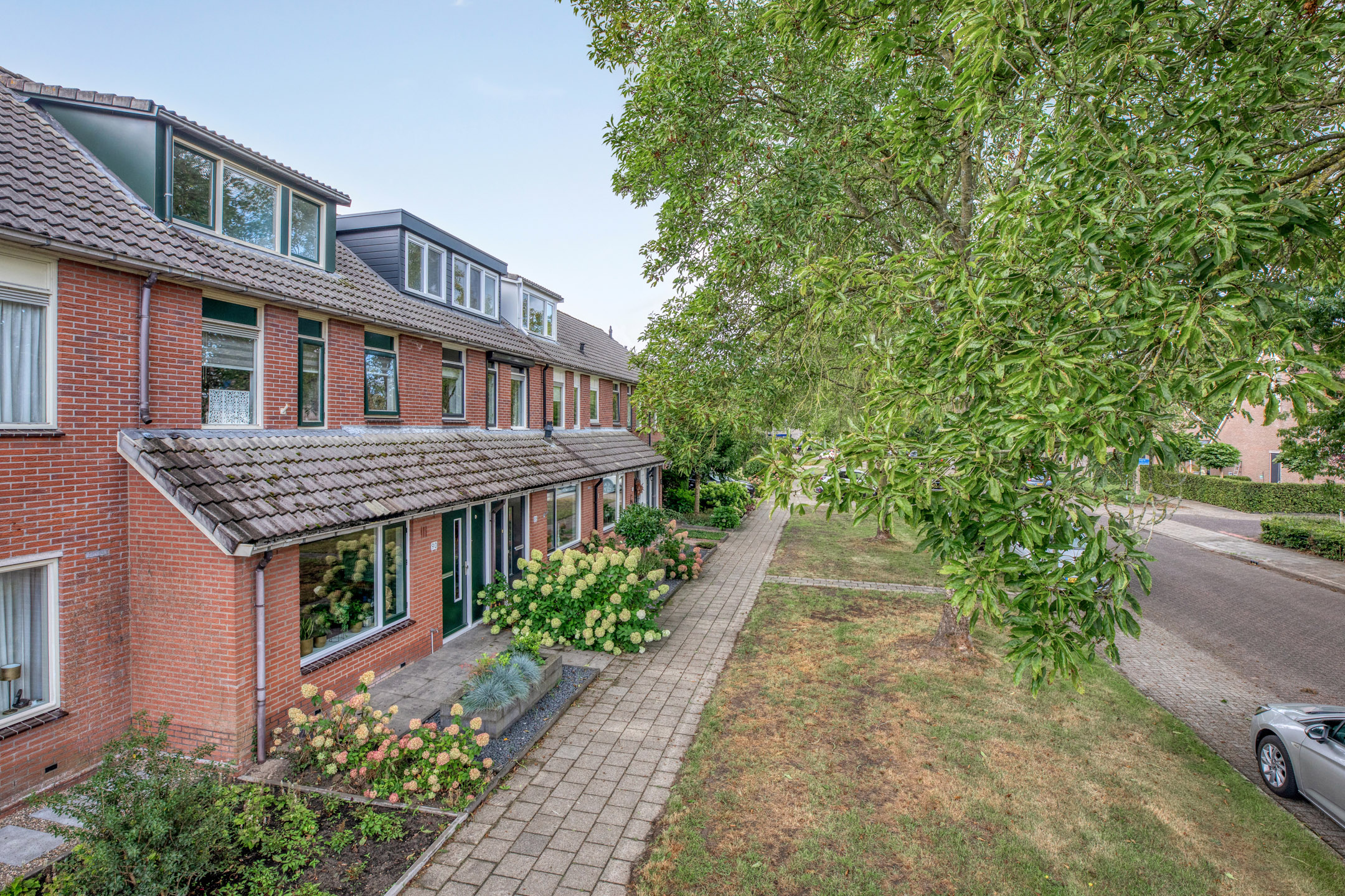 De achtertuin ligt op het zuidoosten en is ingericht met grote tegels, borders en een royaal terras. Hier geniet je van ochtend- en middagzon, met veel privacy dankzij de groene erfafscheiding en schuttingen. Achterin de tuin staat een stenen berging met overkapping welke met fraaie houten delen is bekleed wat zorgt voor een eigentijdse uitstraling. Daarnaast is er een achterom aanwezig. De voortuin is netjes aangelegd en draagt bij aan de verzorgde uitstraling van de woning.