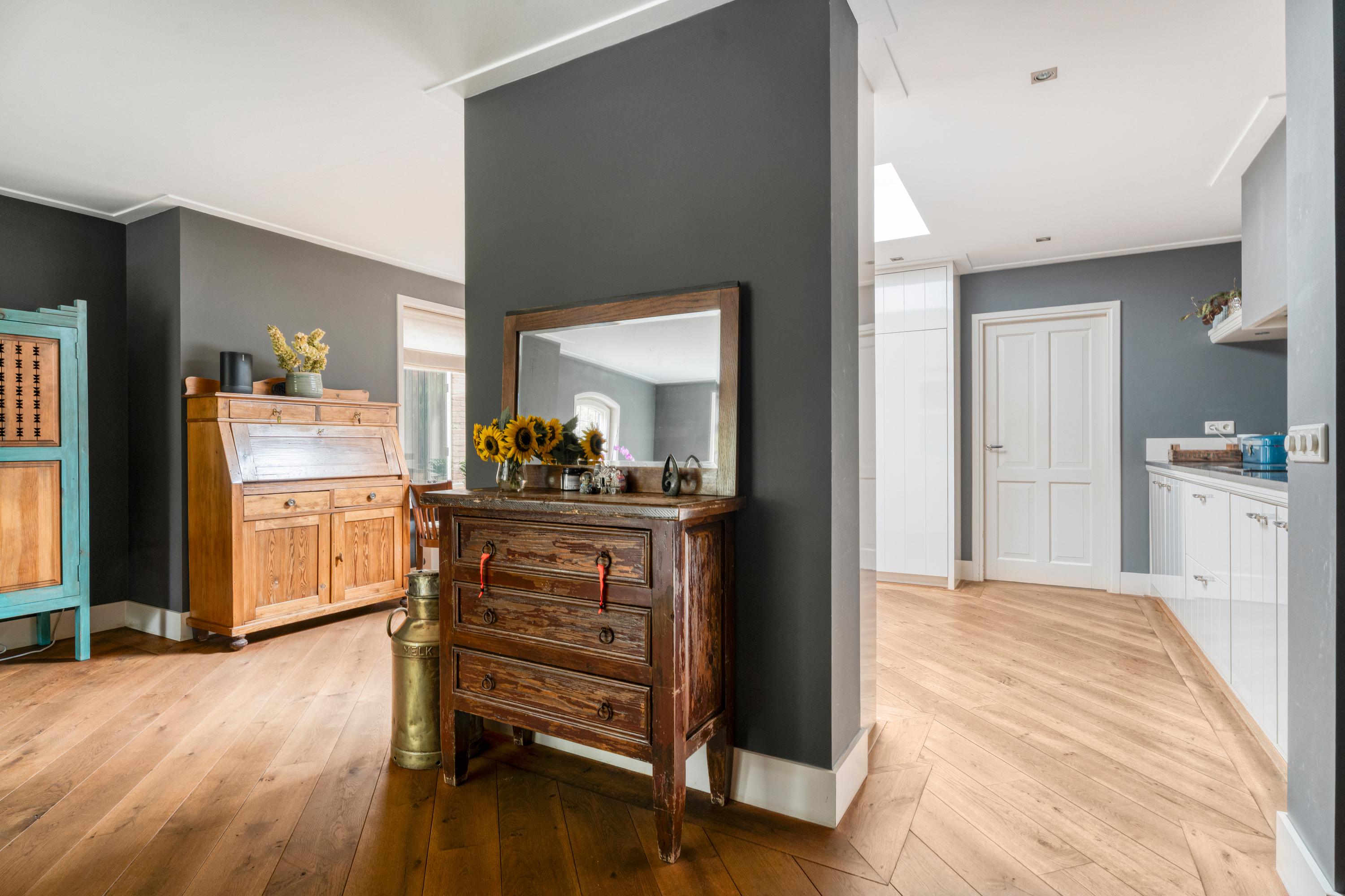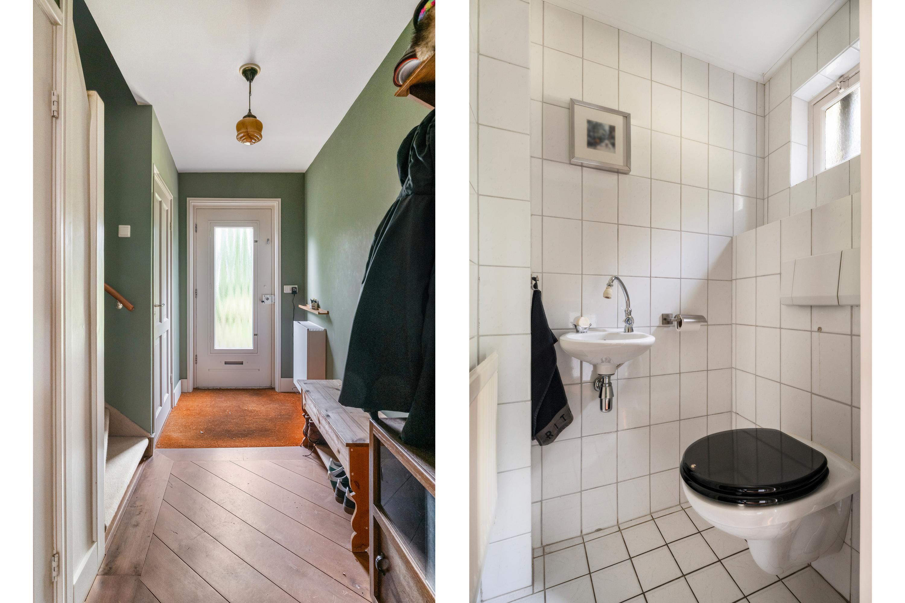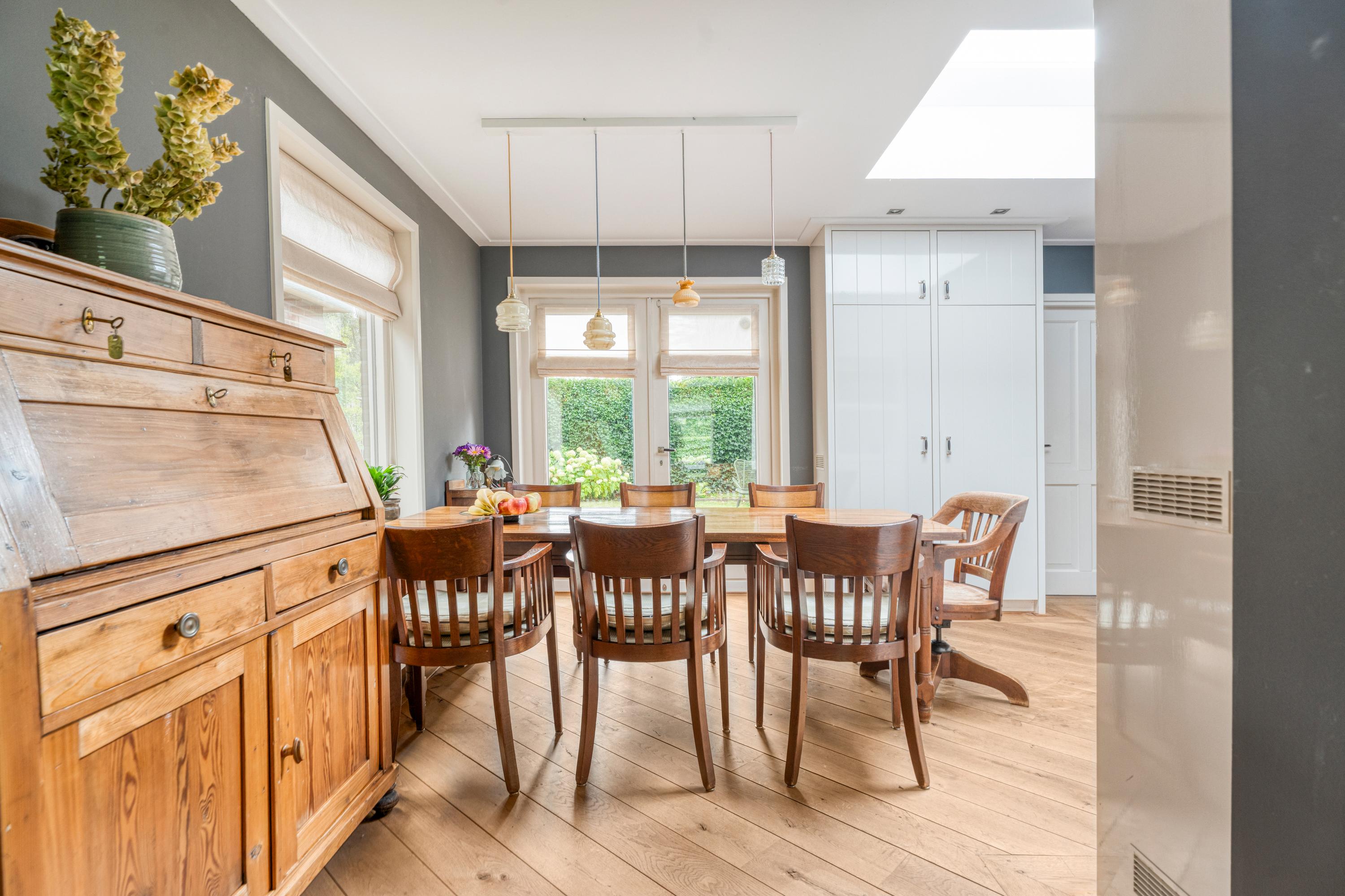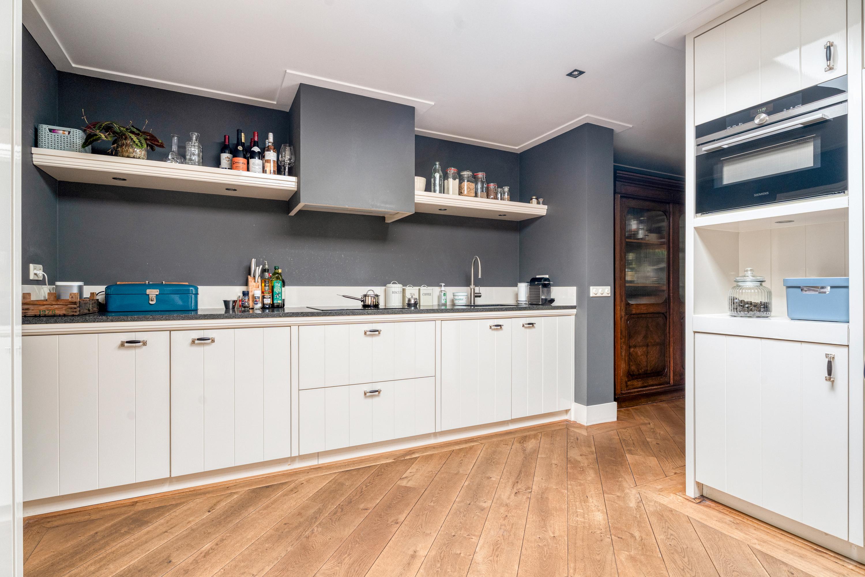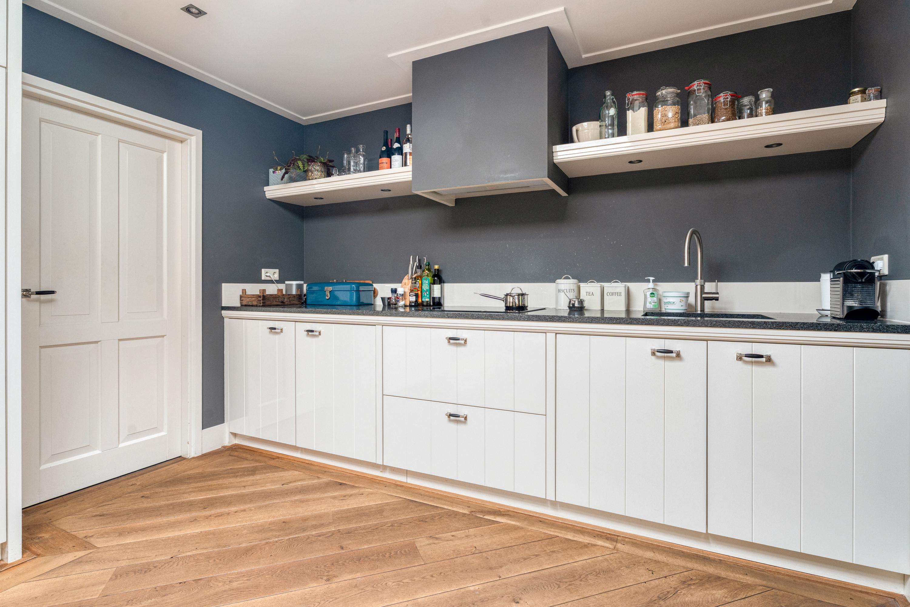 Achter de keuken ligt een praktische bijkeuken met witgoedaansluitingen en de opstelling van de CV-ketel en warmtepomp. Ook vanuit hier is de tuin bereikbaar.