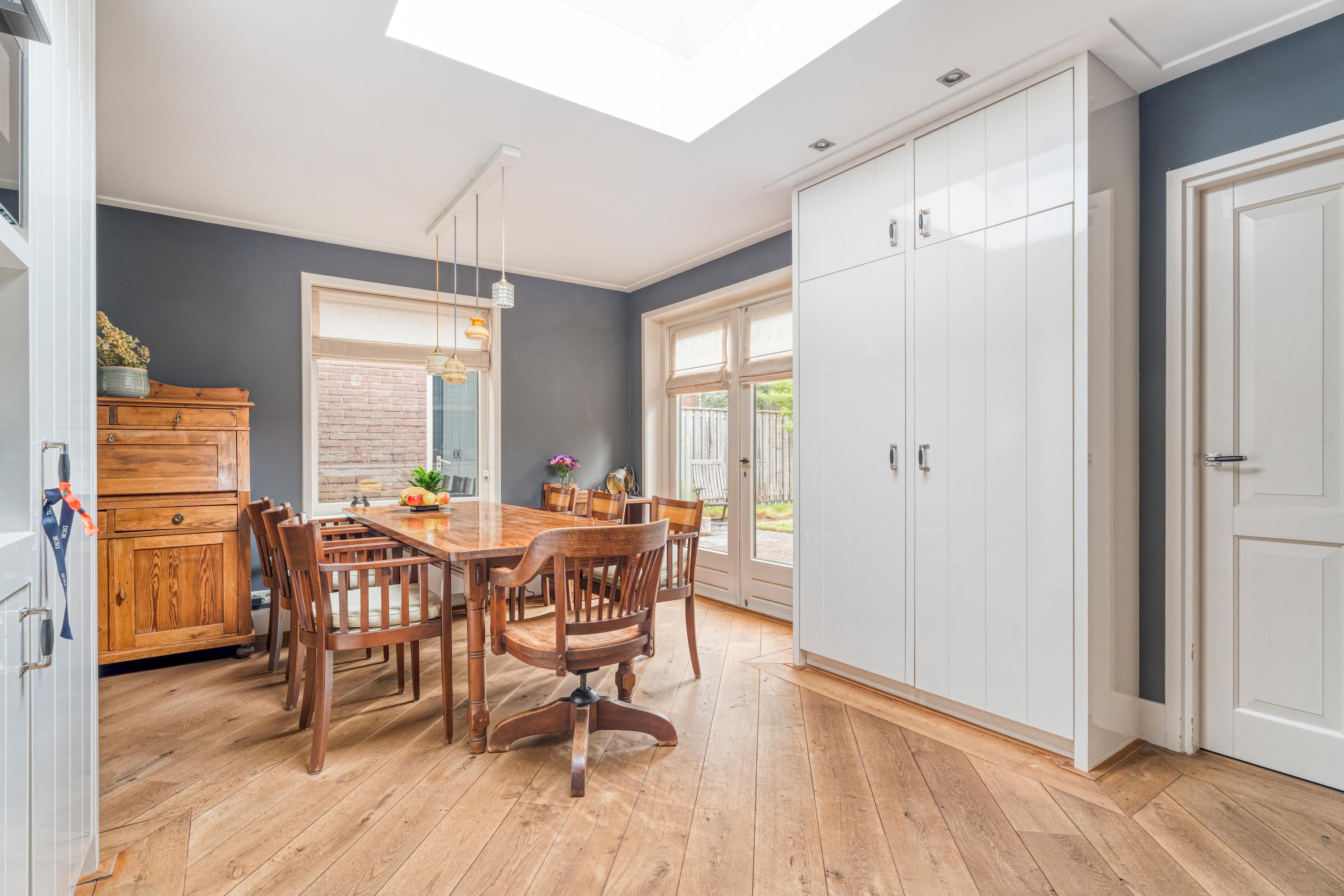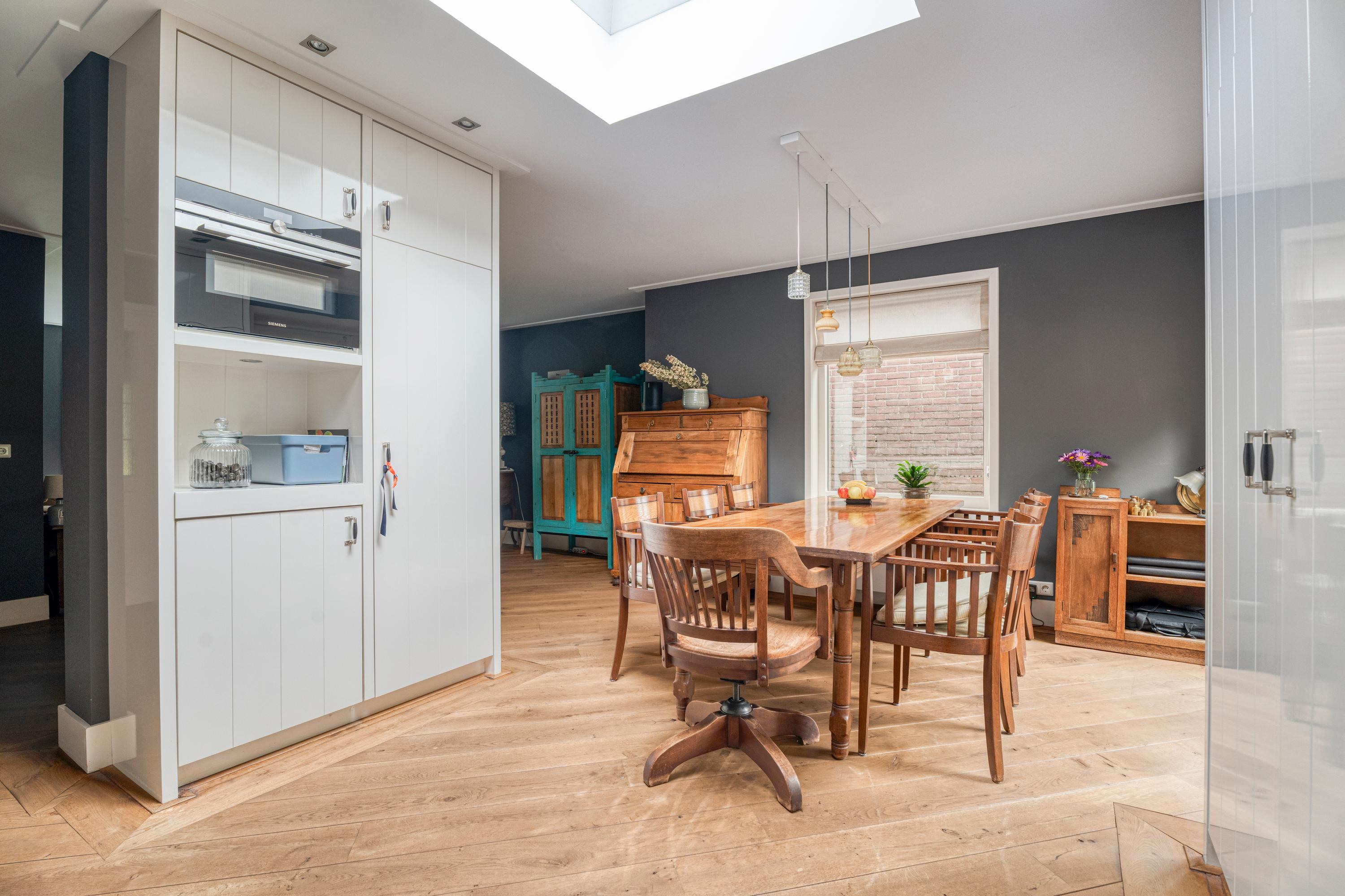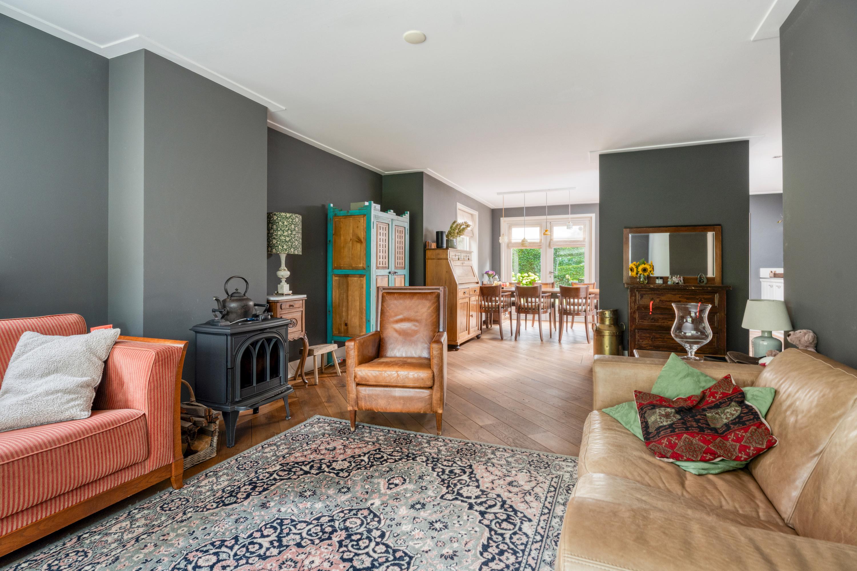 Je komt binnen in de hal met toegang tot de kelder, het toilet, de trapopgang en de sfeervolle woonkamer. De woonkamer heeft een gezellige L-vorm, een warme houten vloer en een schouw met houtkachel (ter overname). Door de uitbouw met lichtkoepel aan de achterzijde is er een royale woonkeuken ontstaan, met ruimte voor een grote eettafel en openslaande deuren naar de tuin.