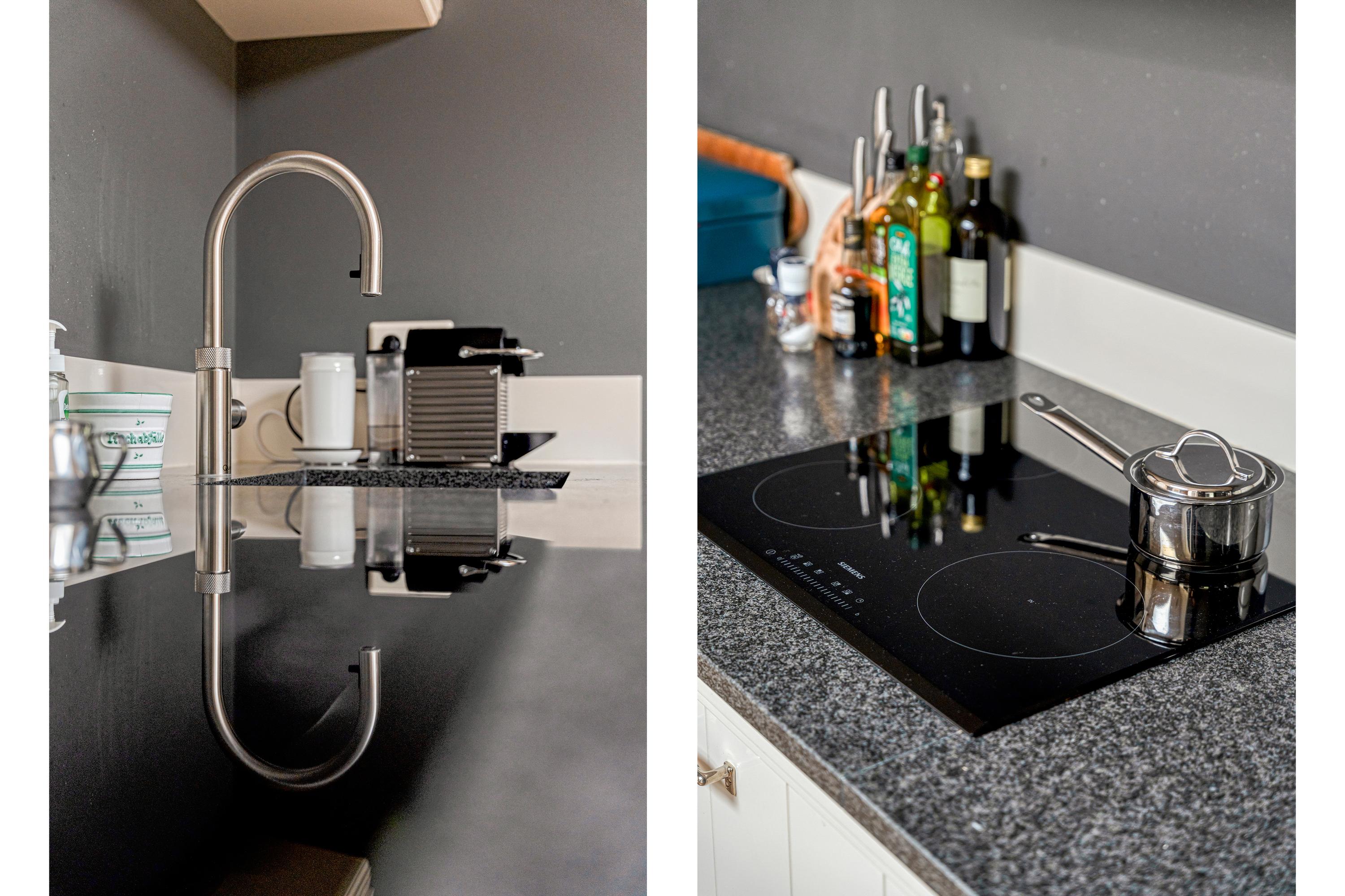De keuken is een echte blikvanger: handgemaakt, met granieten werkblad, verdiepte onderkasten en een combinatie van vaste en losse elementen. Hier vind je onder andere een elektrische kookplaat (2022), cooker (2022, ter overname), afzuigkap, vaatwasser, combimagnetron en koelkast met vriesvak.