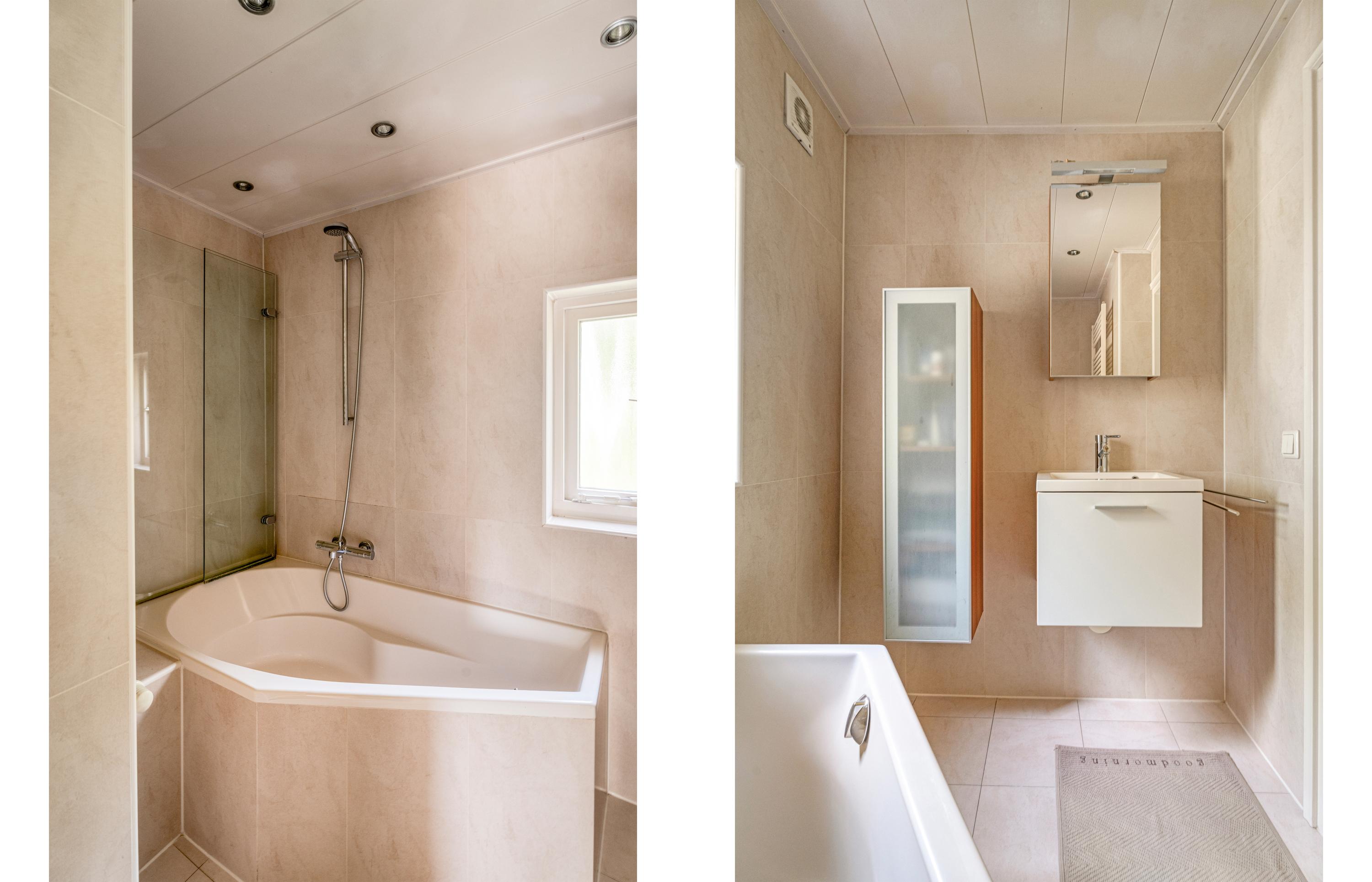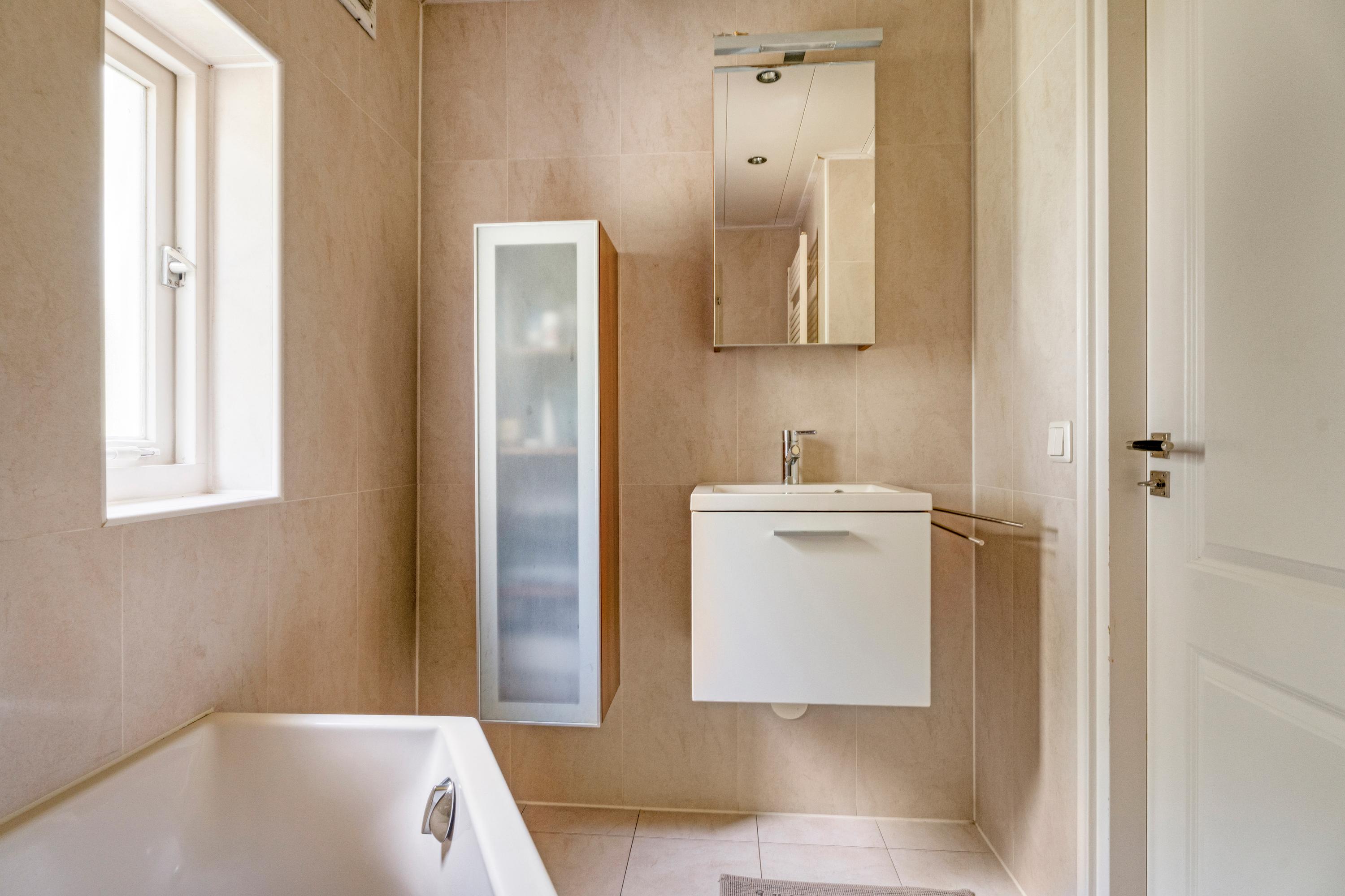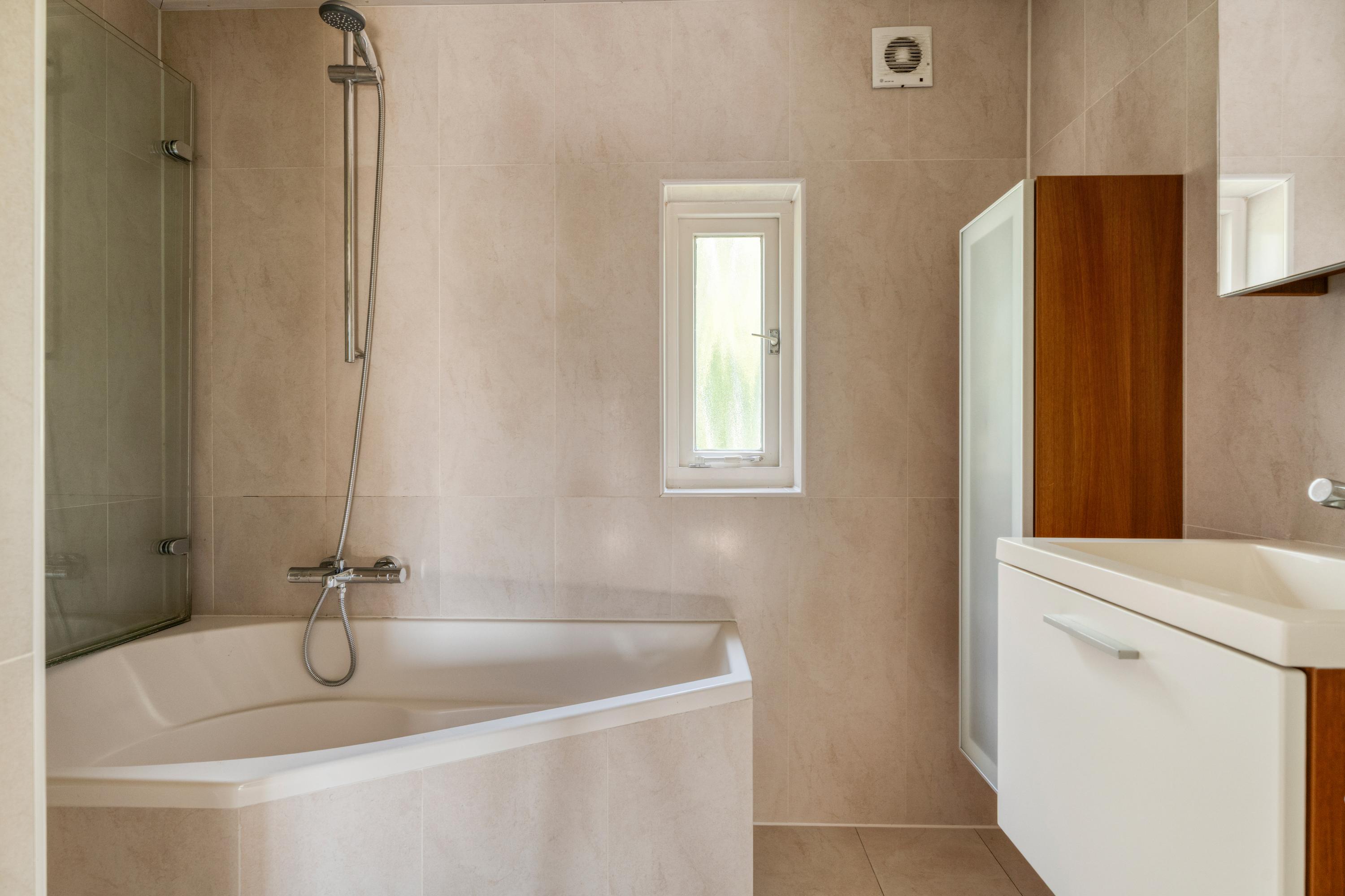 Op de eerste verdieping zijn drie slaapkamers, waarvan twee met prettige afmetingen en één iets compacter. De badkamer is volledig betegeld en voorzien van een ligbad met douchegedeelte, wastafelmeubel, mechanische ventilatie en een designradiator.
