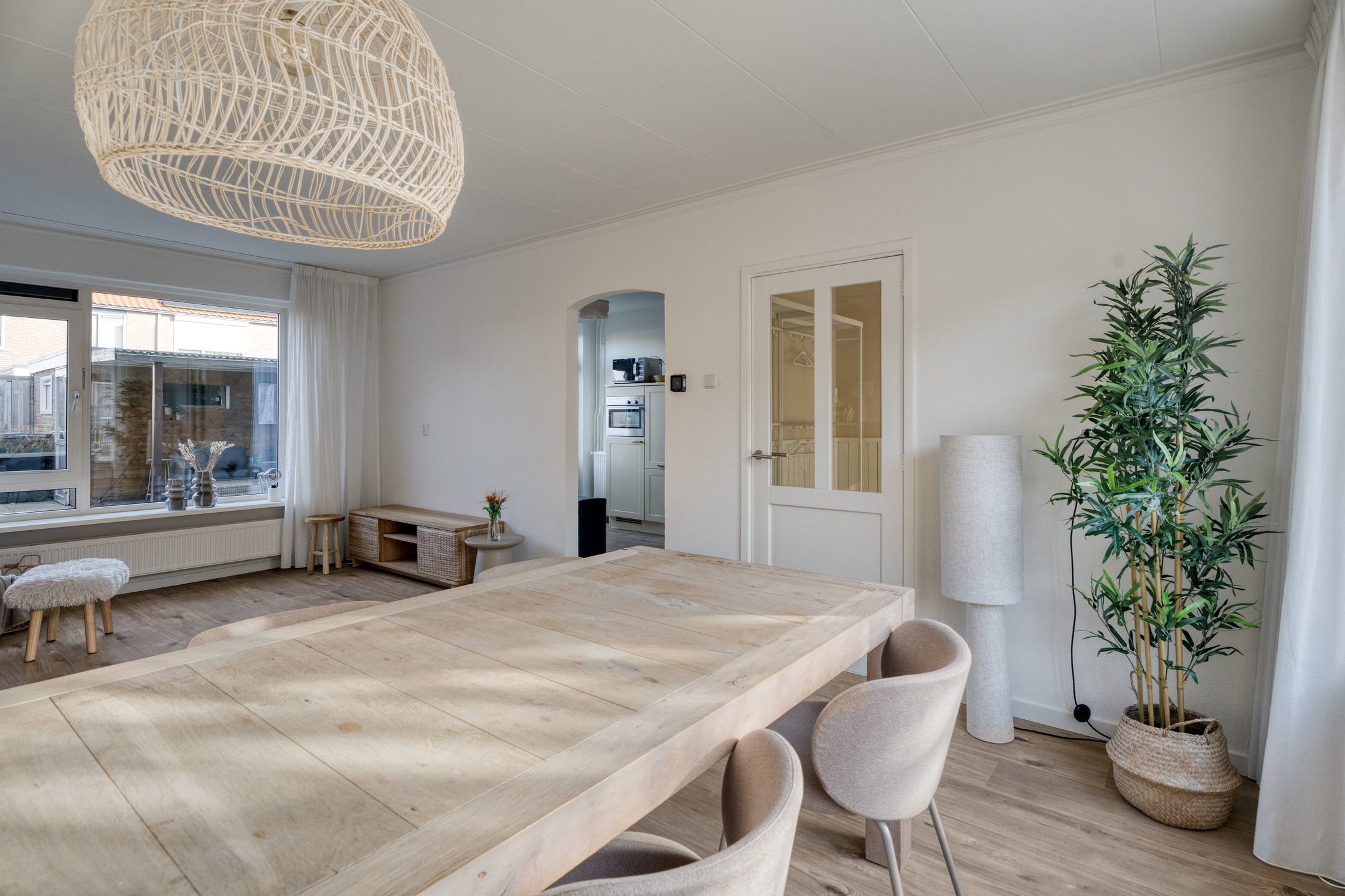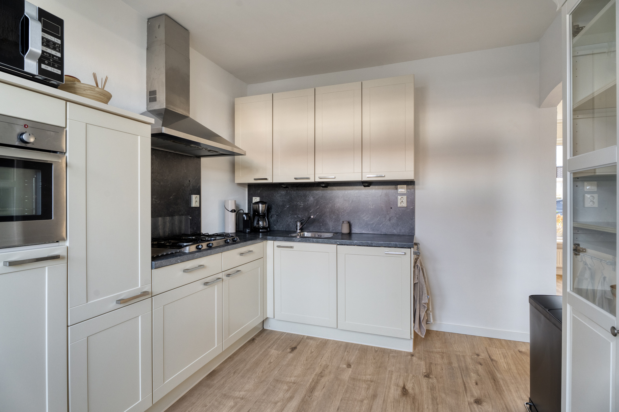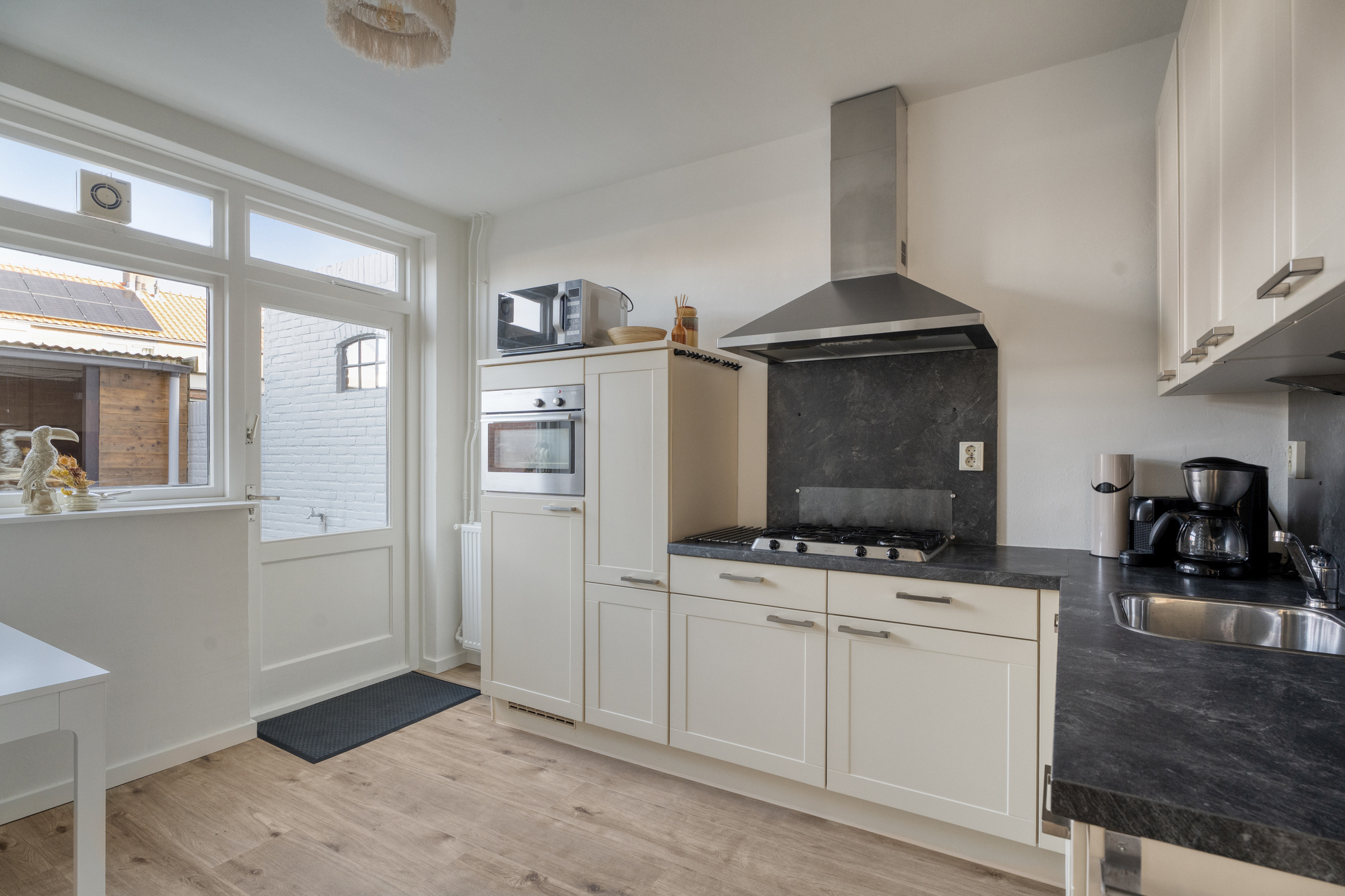 Aan de achterzijde tref je de keuken in hoekopstelling, met zowel boven- als onderkasten en een loopdeur naar de tuin.
