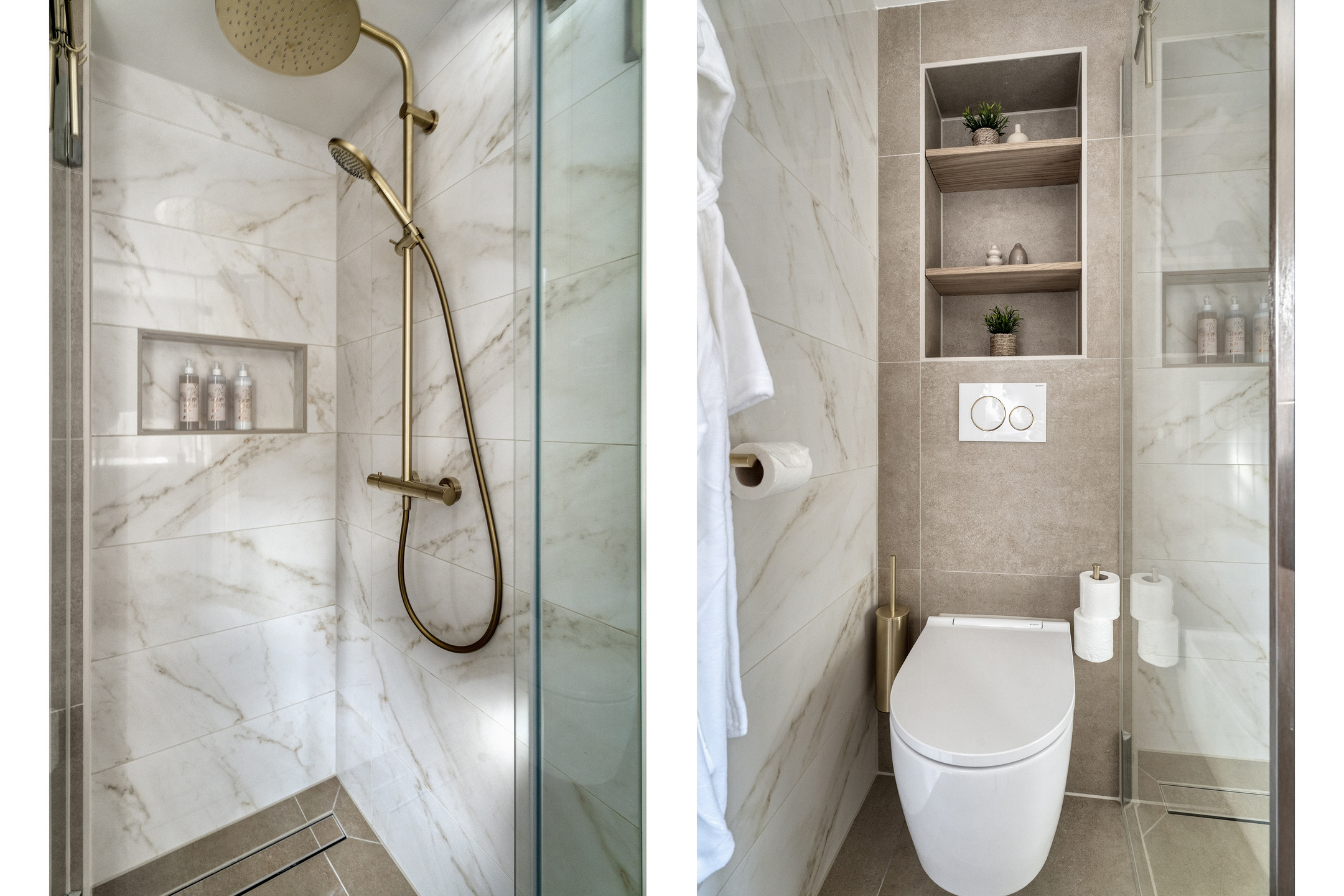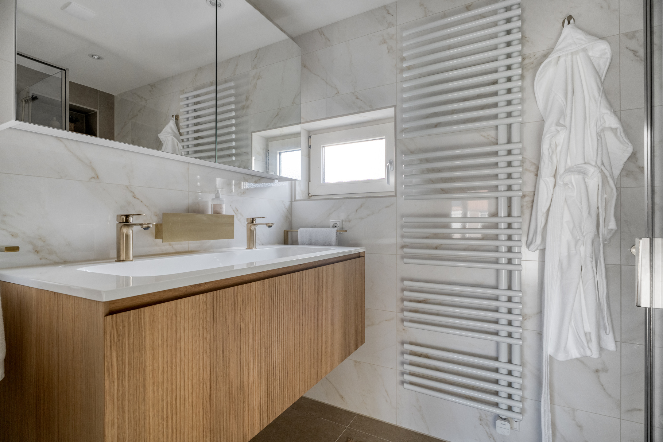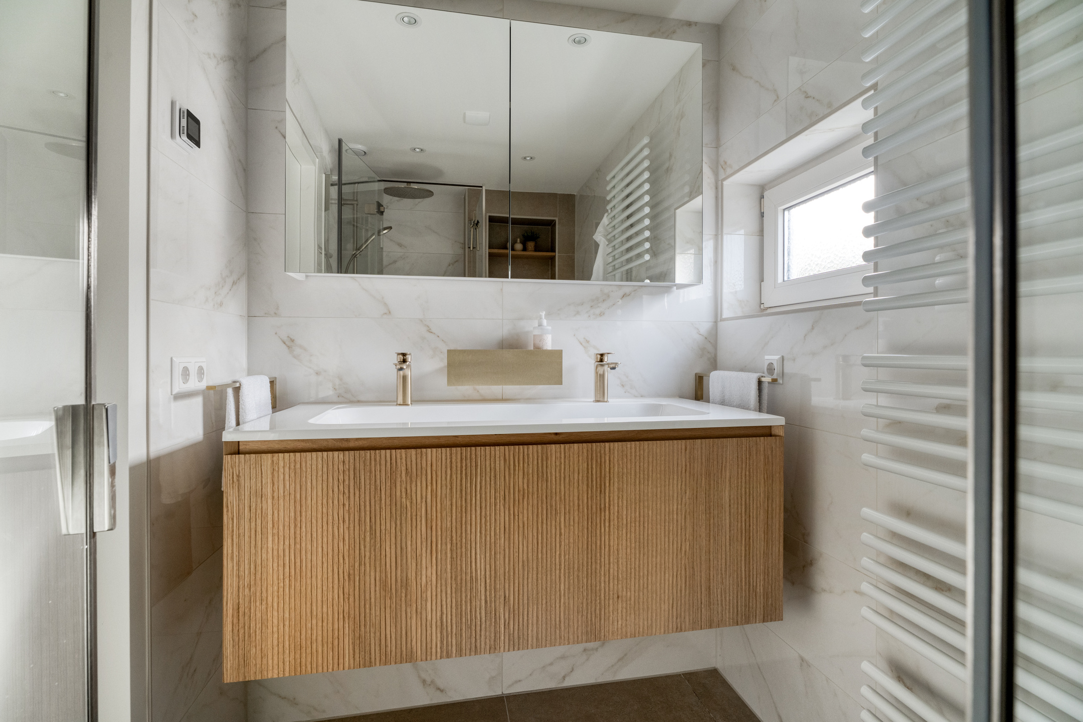 Op de eerste verdieping zijn drie slaapkamers aanwezig, allemaal voorzien van kunststof kozijnen. Ook vind je hier de schitterende en stijlvol afgewerkte badkamer, die is uitgerust een ruime inloopdouche, toilet en wastafelmeubel. Vanaf de overloop is er toegang tot een vaste kast en de vaste trap naar de tweede verdieping.