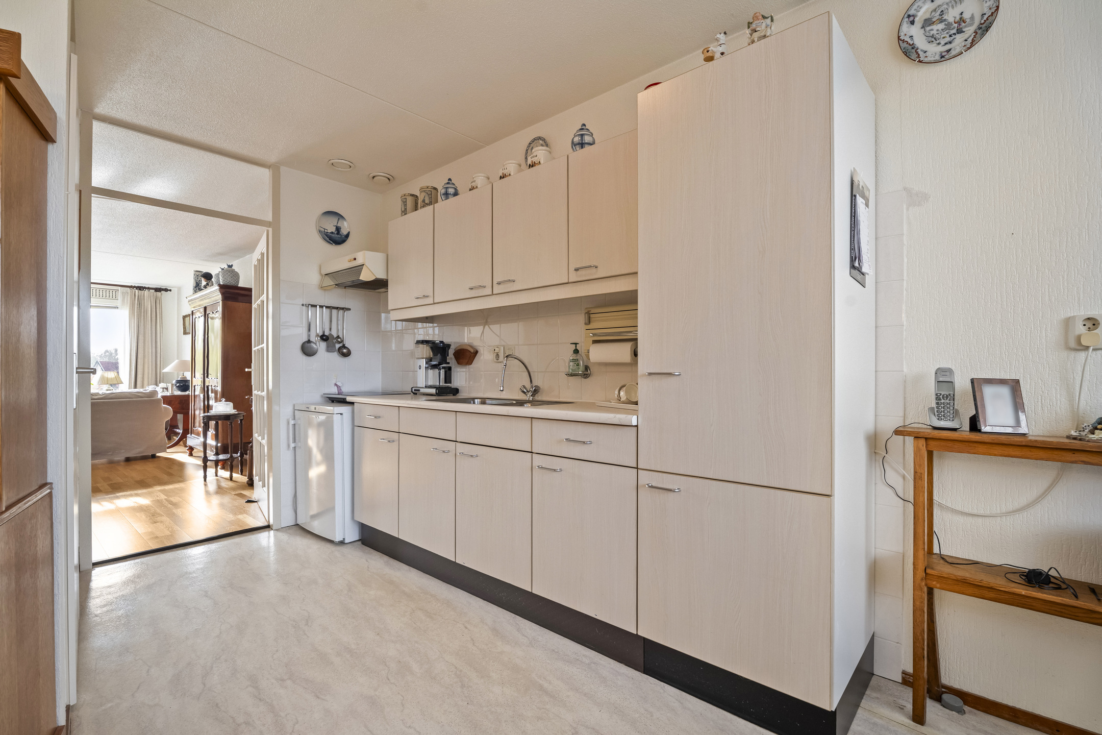 In de hal vindt u de meterkast en toegang tot zowel de badkamer als de keuken. De keuken is uitgevoerd in een lichte kleurstelling en voorzien van veel kastruimte. Aangrenzend bevindt zich een praktische inpandige berging met aansluitingen voor wasmachine en droger. Deze ruimte is ideaal voor opslag of het plaatsen van extra apparatuur, zoals een vriezer.