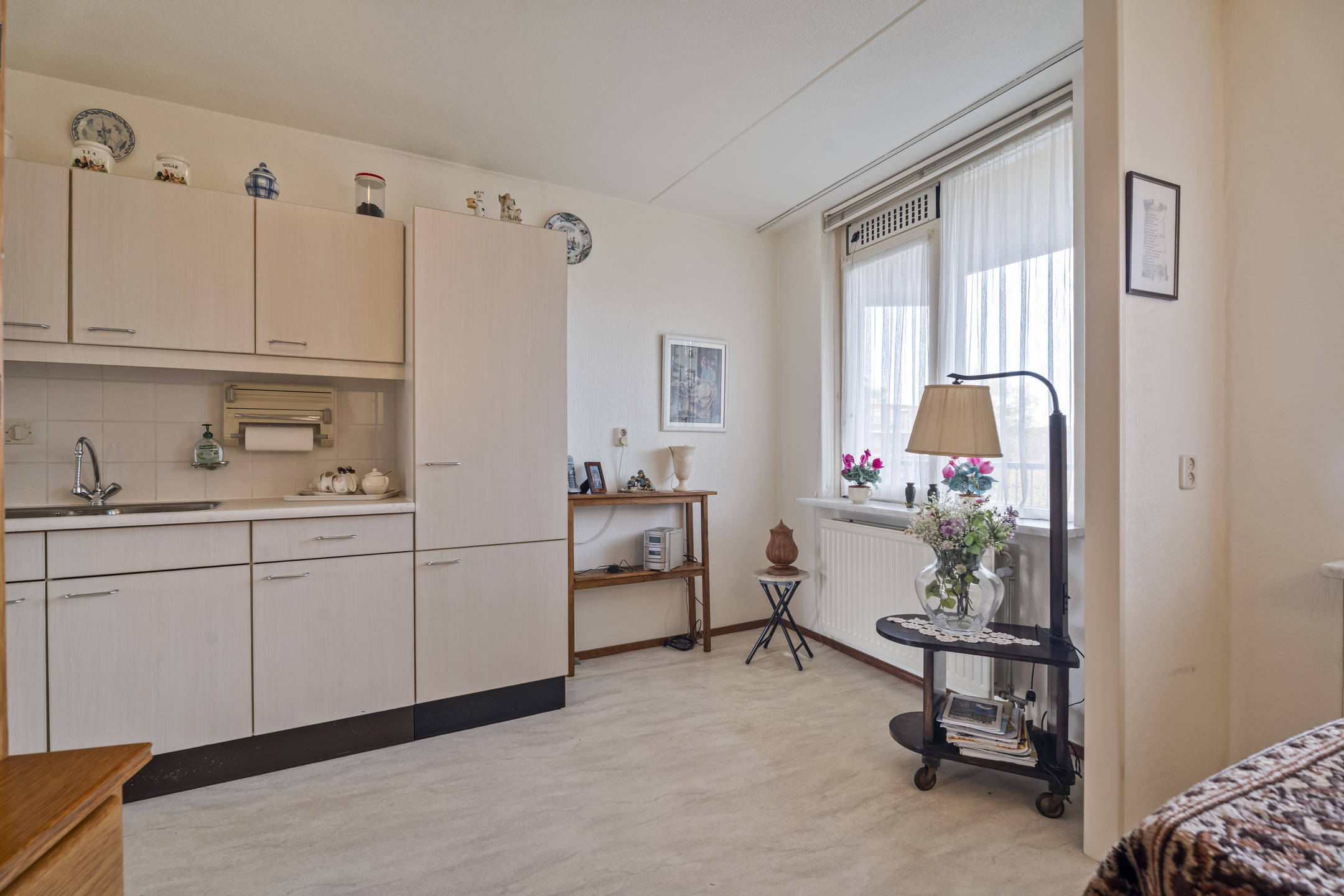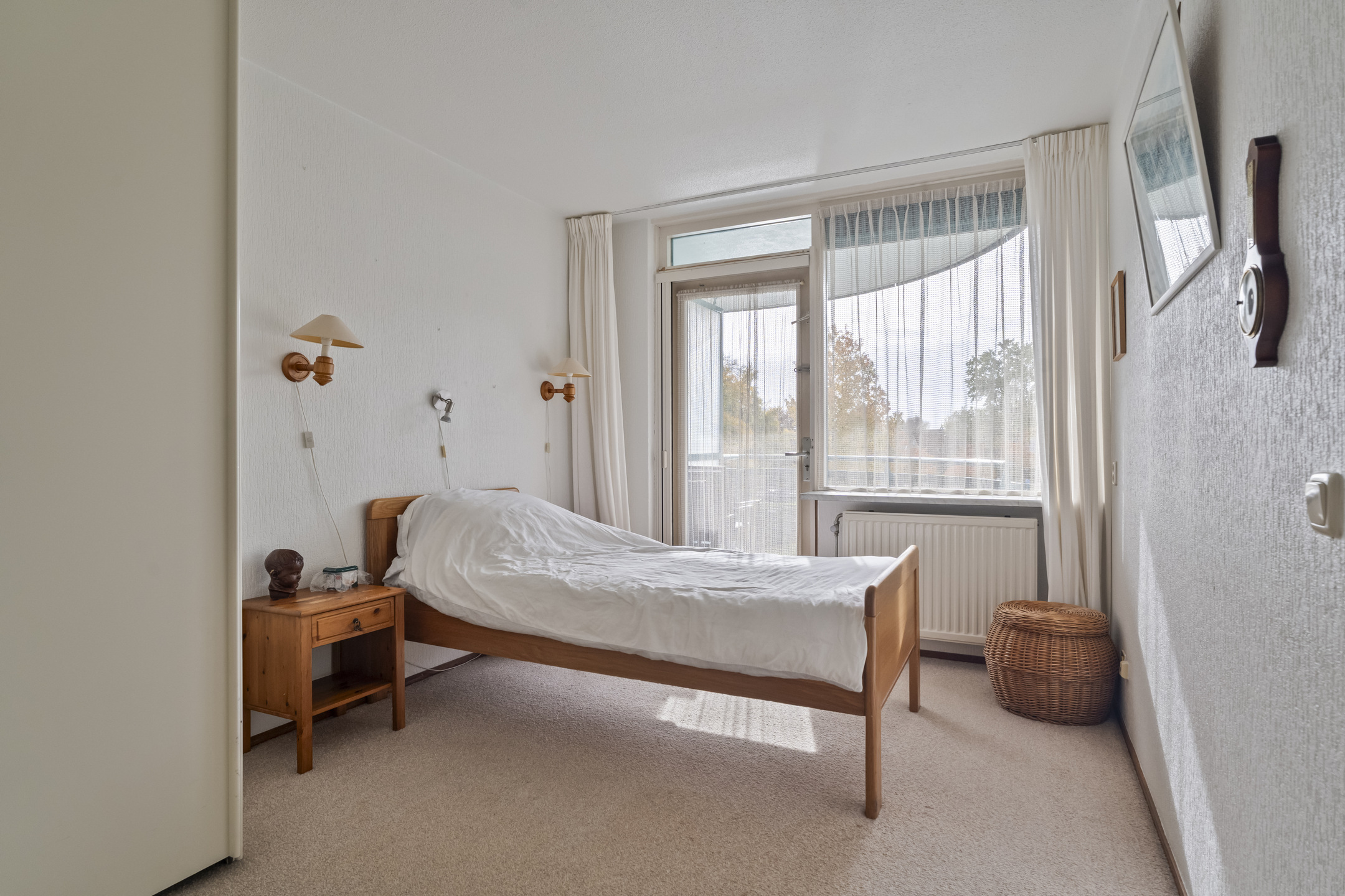 Vanuit de keuken loopt u door naar de woonkamer, een fijne en lichte ruimte dankzij de zuidwestelijke ligging en de grote raampartij. Vanuit de woonkamer heeft u toegang tot het balkon, waar u geniet van een vrij en groen uitzicht. Ook de slaapkamer is vanuit de woonkamer bereikbaar. Deze biedt voldoende ruimte voor een tweepersoonsbed en een kast en beschikt eveneens over een deur naar het balkon.