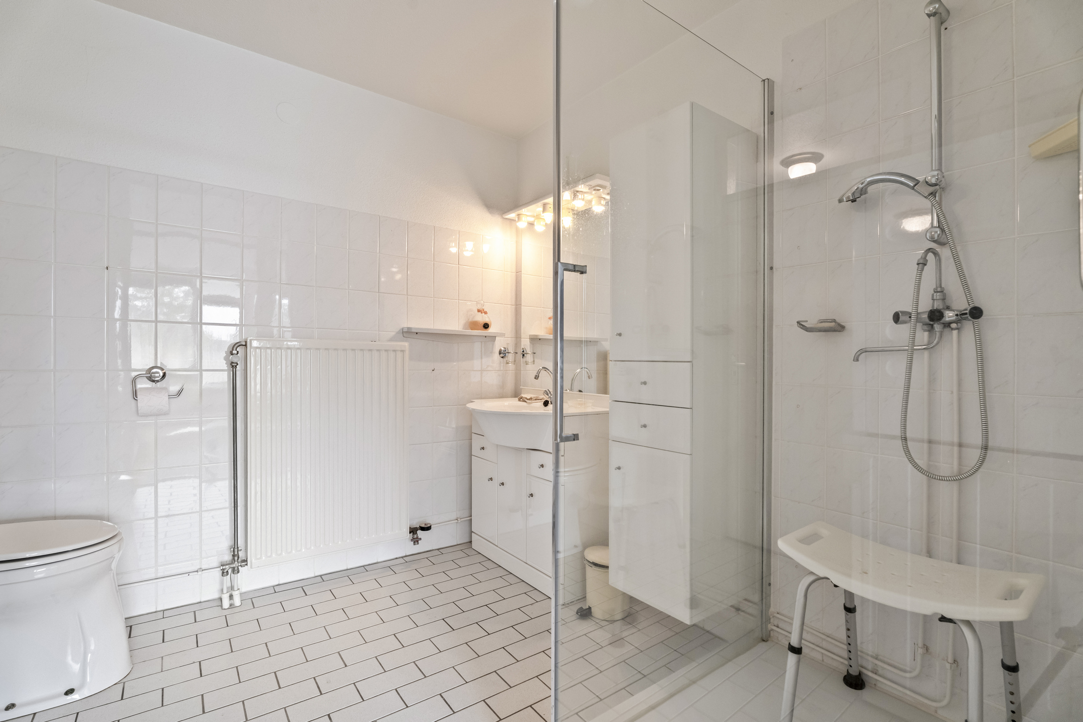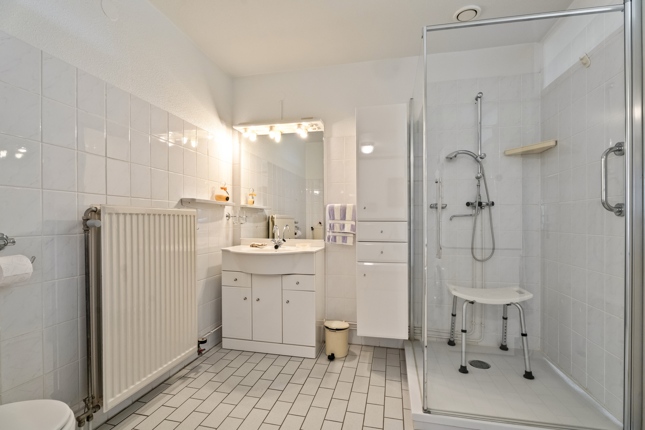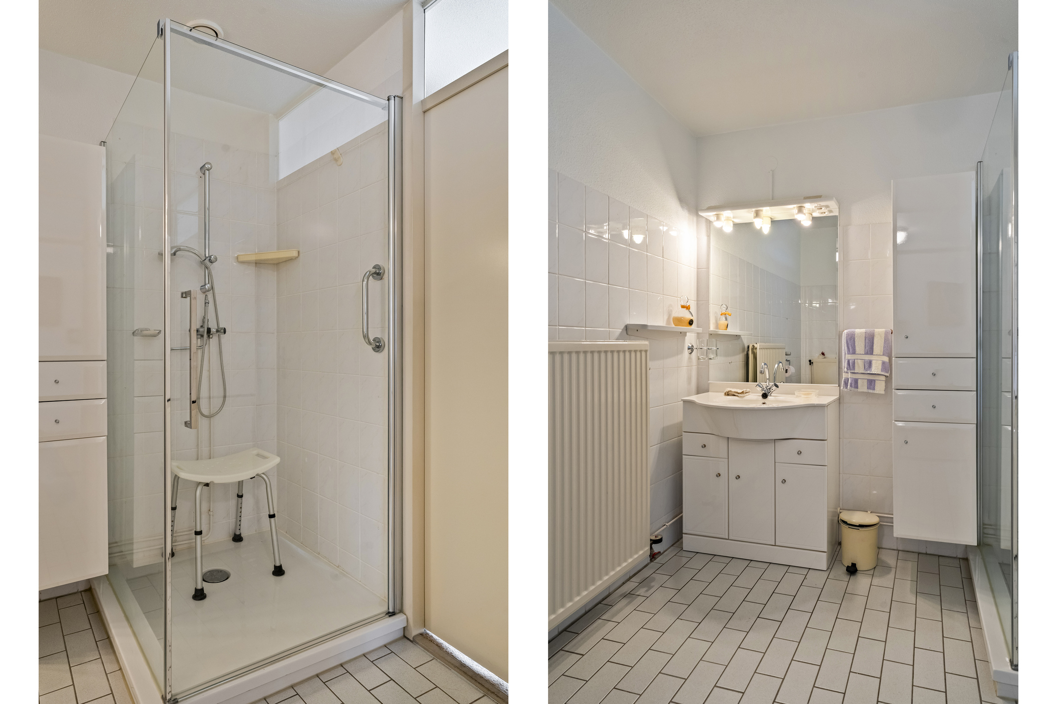 De badkamer beschikt over een douchecabine, wastafelmeubel en toilet. Alles is verzorgd, met voldoende ruimte om het naar eigen inzicht te moderniseren.