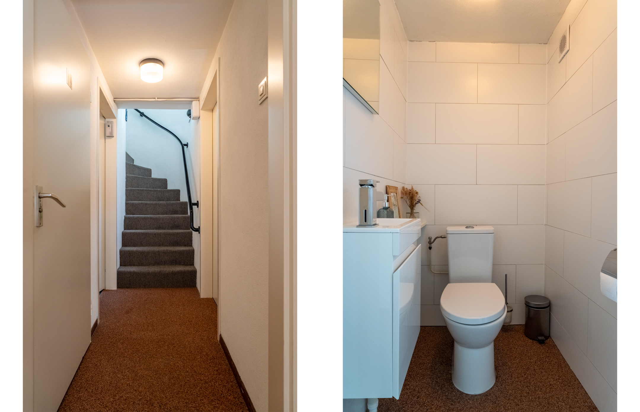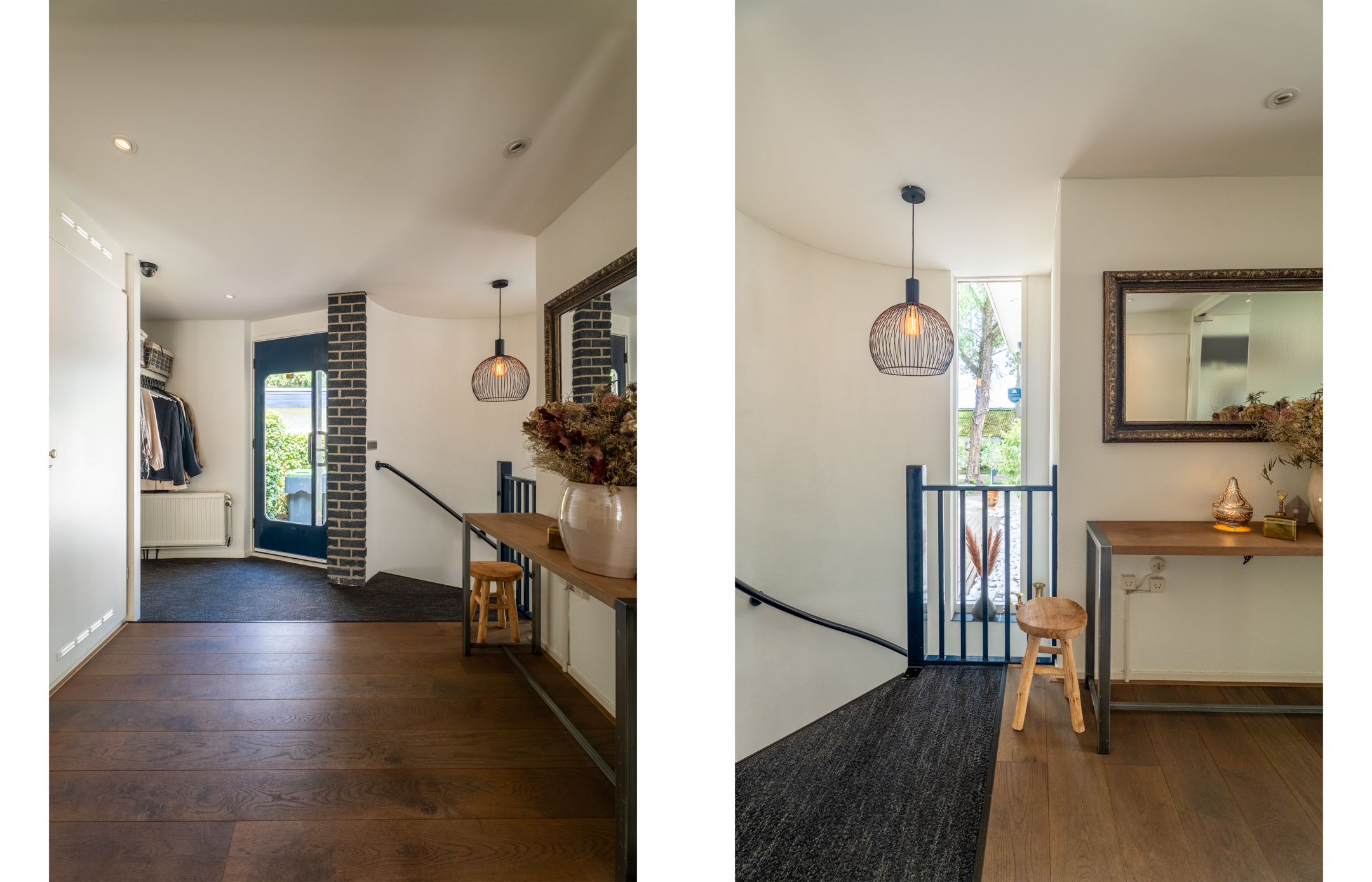 Via de overdekte entree stapt u de ruime hal binnen, waar direct de verzorgde afwerking en het gevoel van ruimte opvallen. Hier vindt u de garderobe, de trapopgang, een modern toilet met fonteintje en toegang tot de living.