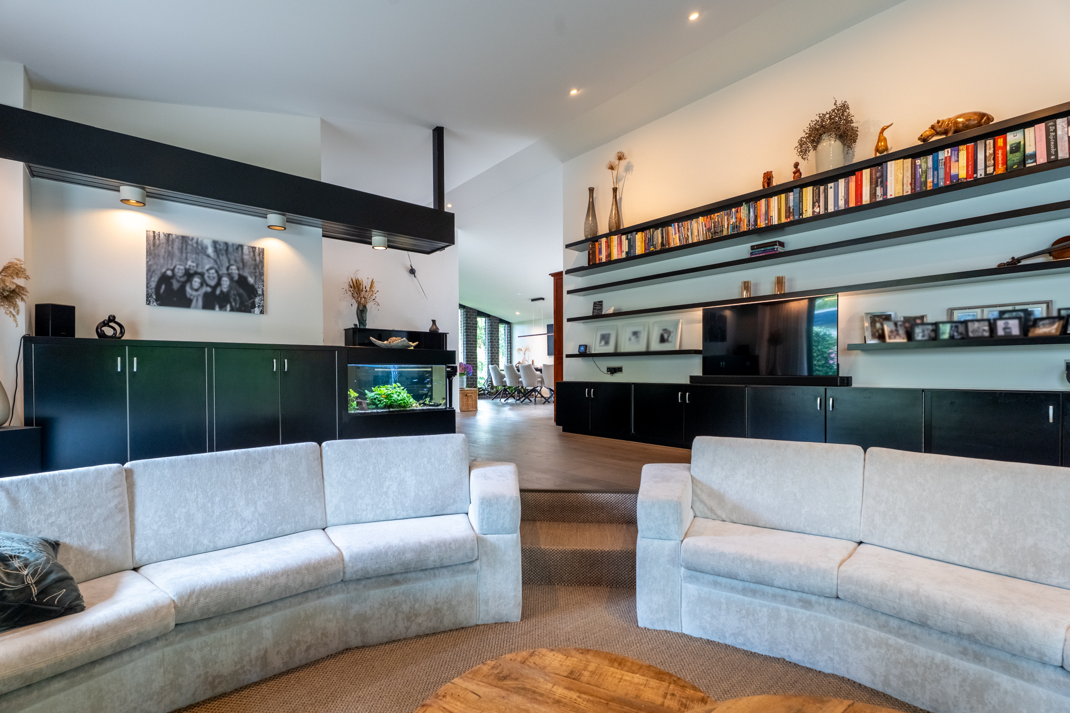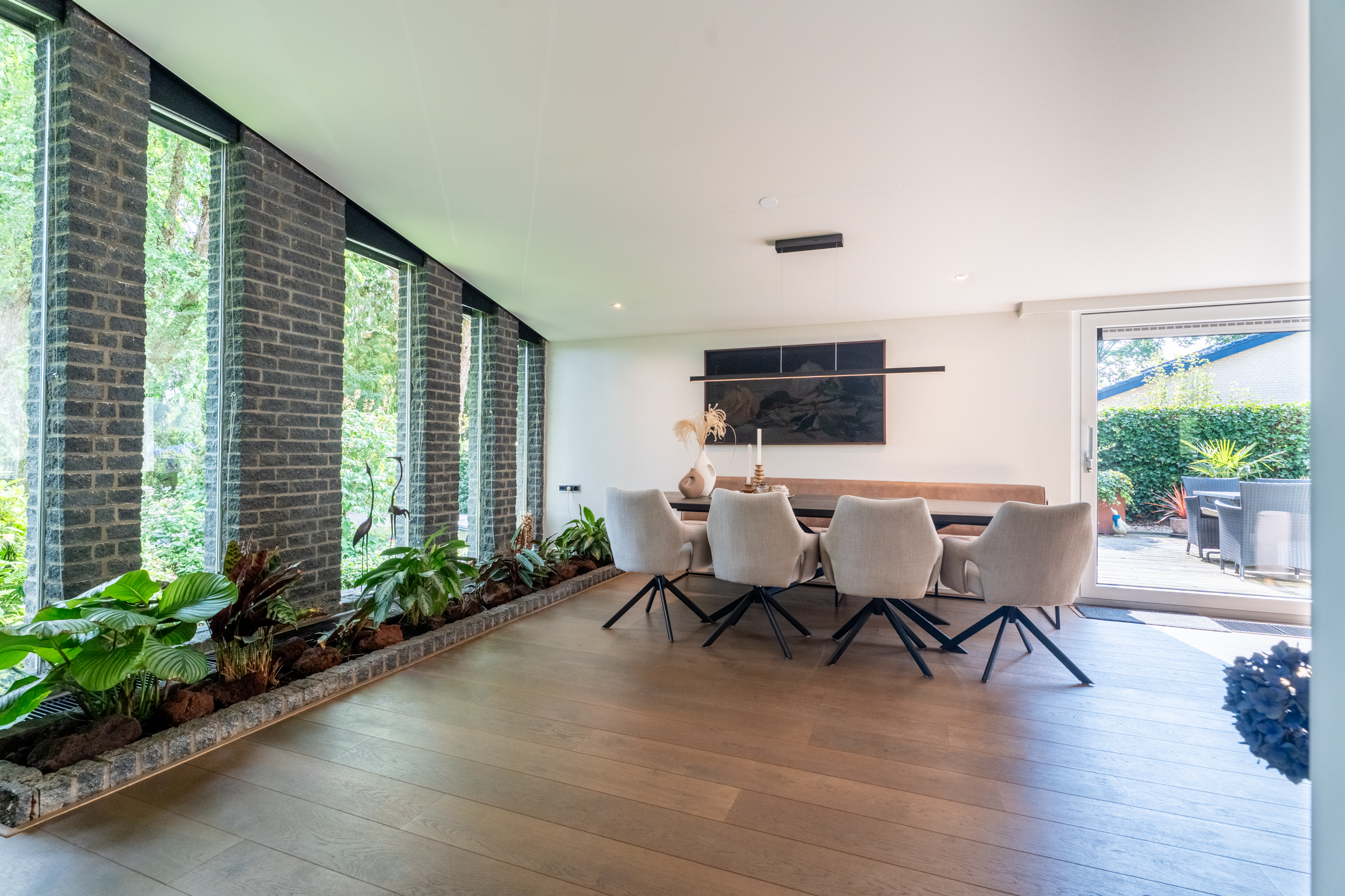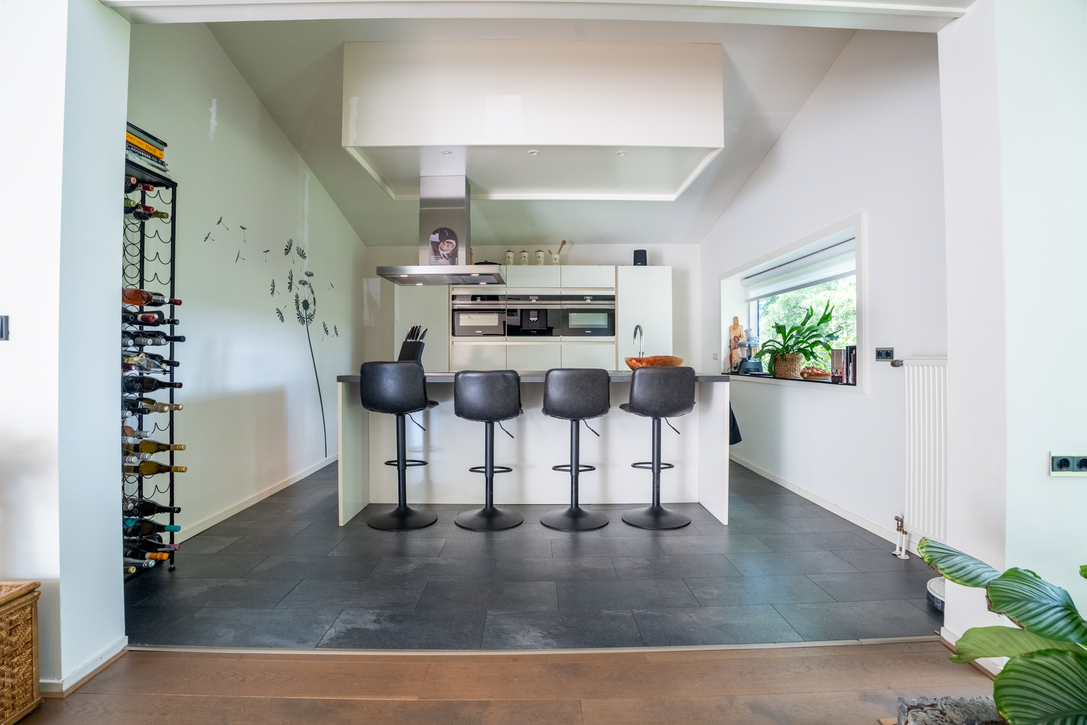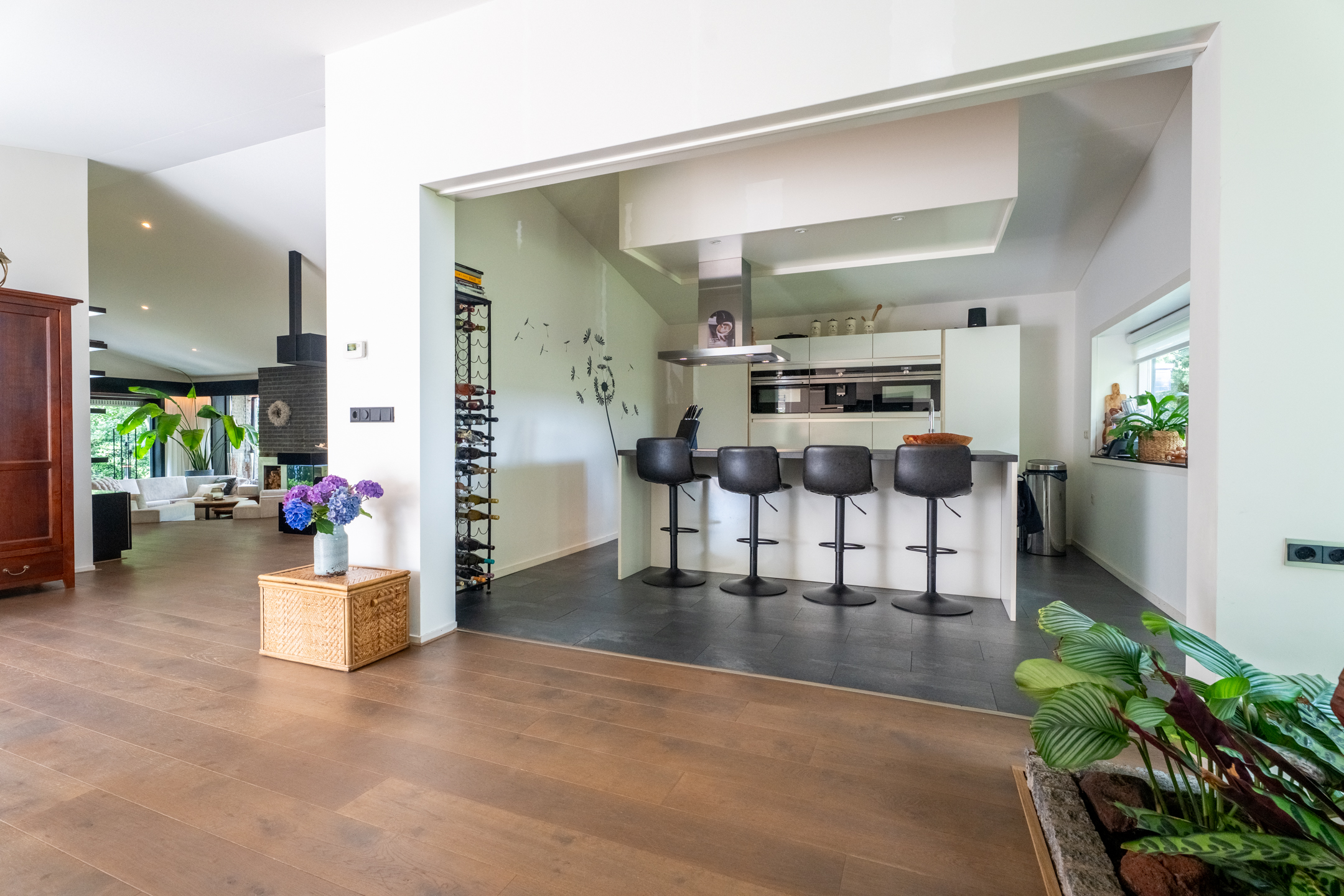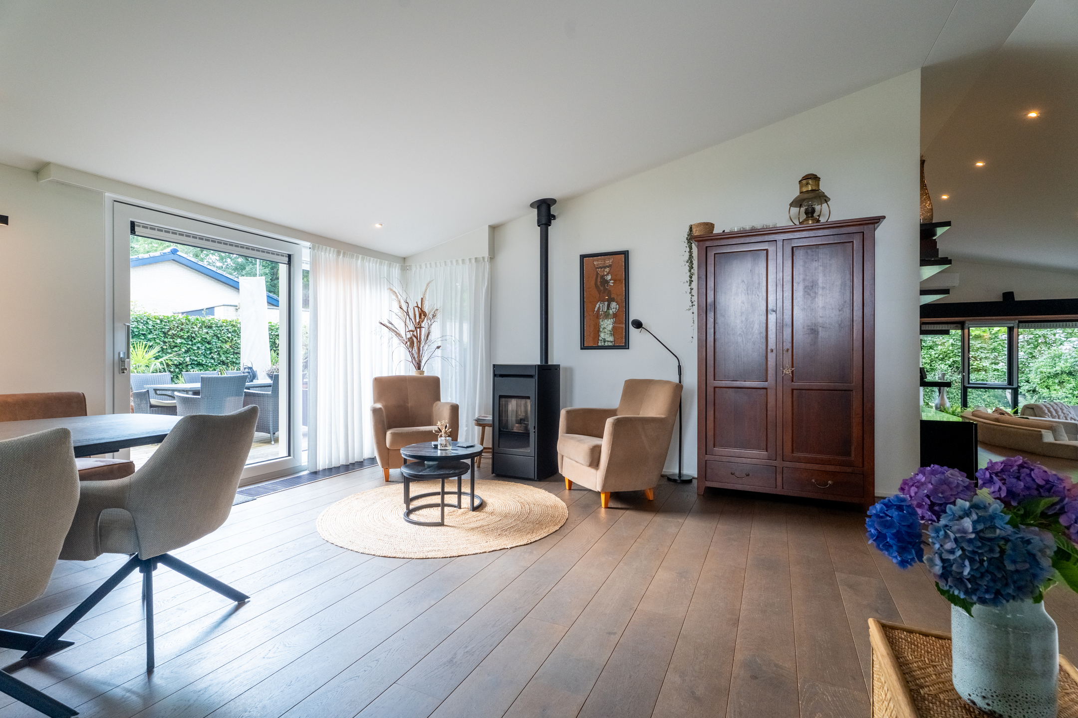 De woonkamer is een sfeervol geheel, met als blikvanger de gezellige zitkuil rondom de houtkachel. Grote raampartijen aan meerdere zijden zorgen voor overvloedig daglicht en een prachtig uitzicht op het groen rondom de woning. Het eetgedeelte sluit aan op de luxe keuken, uitgevoerd in een warme kleurstelling en voorzien van hoogwaardige inbouwapparatuur. Dankzij de vernieuwde schuifpui betrekt u op zomerse dagen eenvoudig het royale terras bij het woongedeelte.