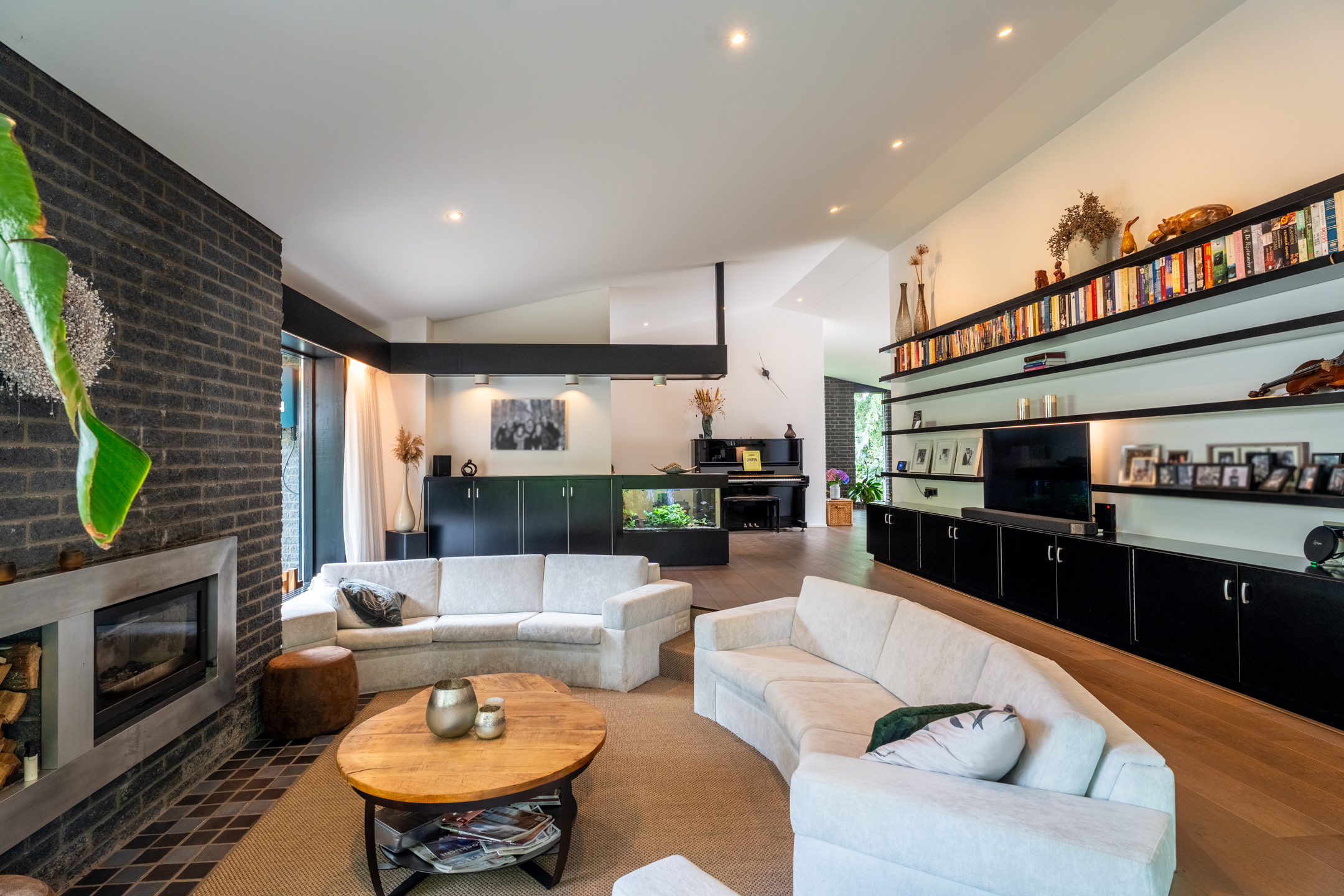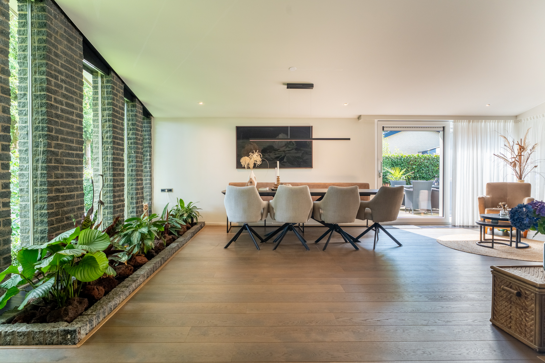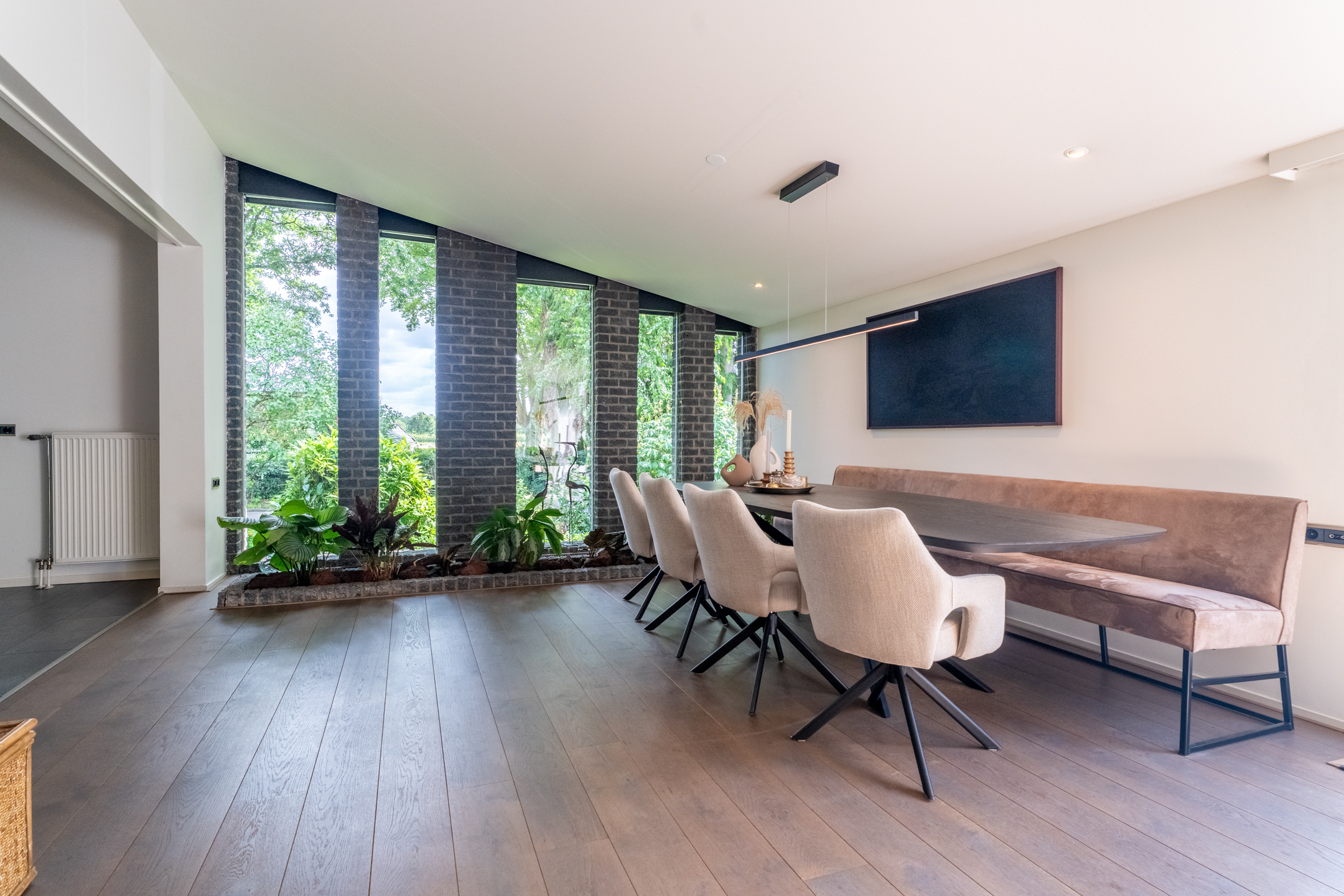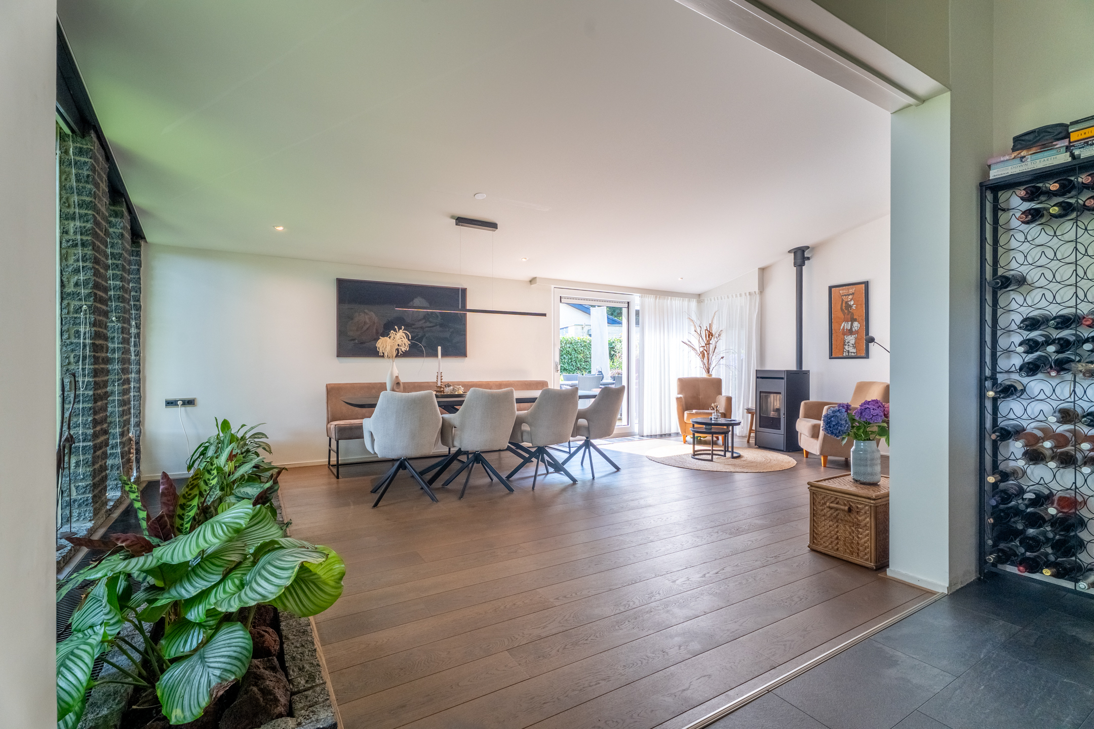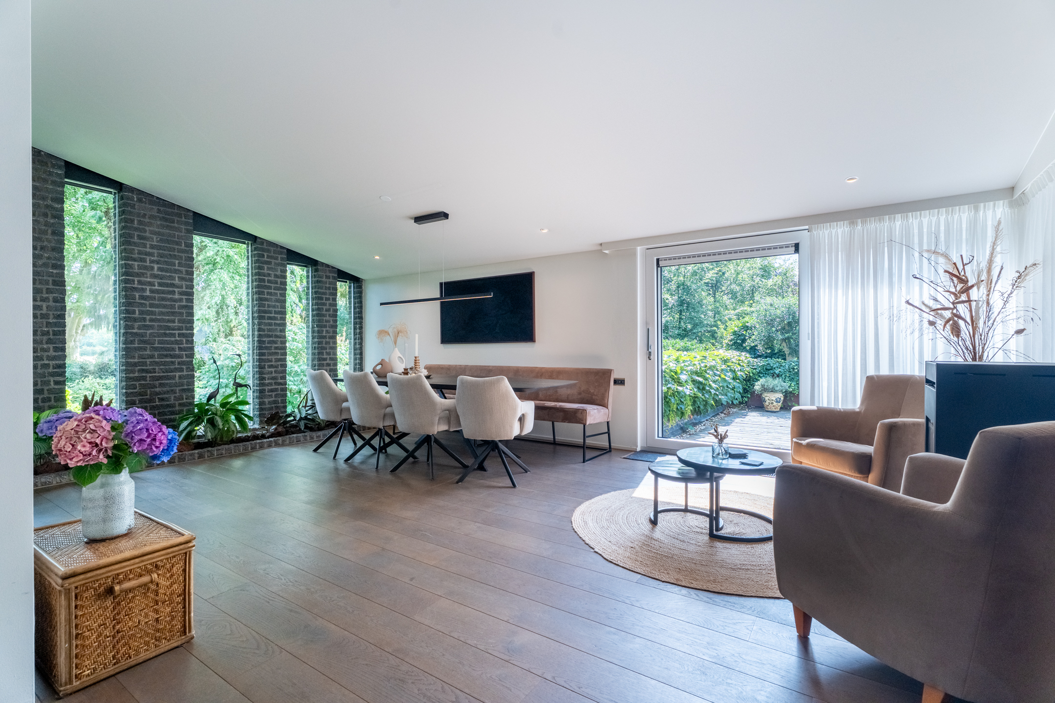 De woonkamer is een sfeervol geheel, met als blikvanger de gezellige zitkuil rondom de houtkachel. Grote raampartijen aan meerdere zijden zorgen voor overvloedig daglicht en een prachtig uitzicht op het groen rondom de woning. Het eetgedeelte sluit aan op de luxe keuken, uitgevoerd in een warme kleurstelling en voorzien van hoogwaardige inbouwapparatuur. Dankzij de vernieuwde schuifpui betrekt u op zomerse dagen eenvoudig het royale terras bij het woongedeelte.